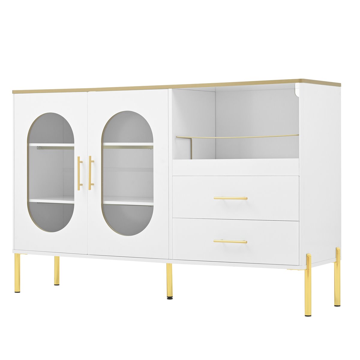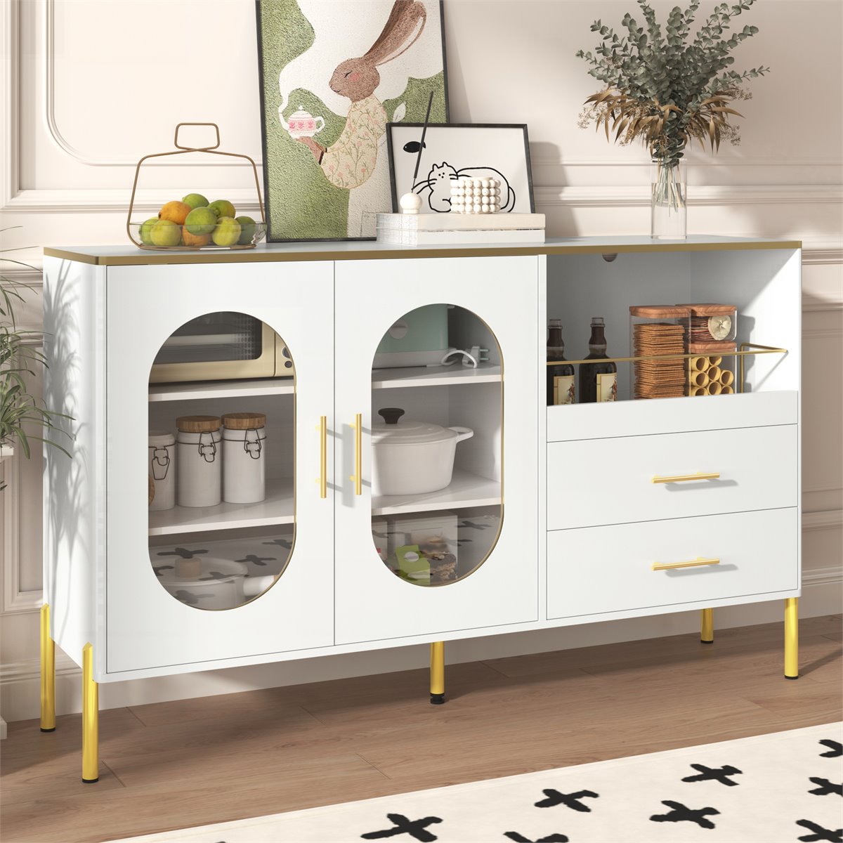 - Grande capacidade de arrumação: Com duas gavetas e duas portas com prateleiras, este aparador oferece um amplo espaço para guardar louça, livros, decorações ou outros objetos do quotidiano.