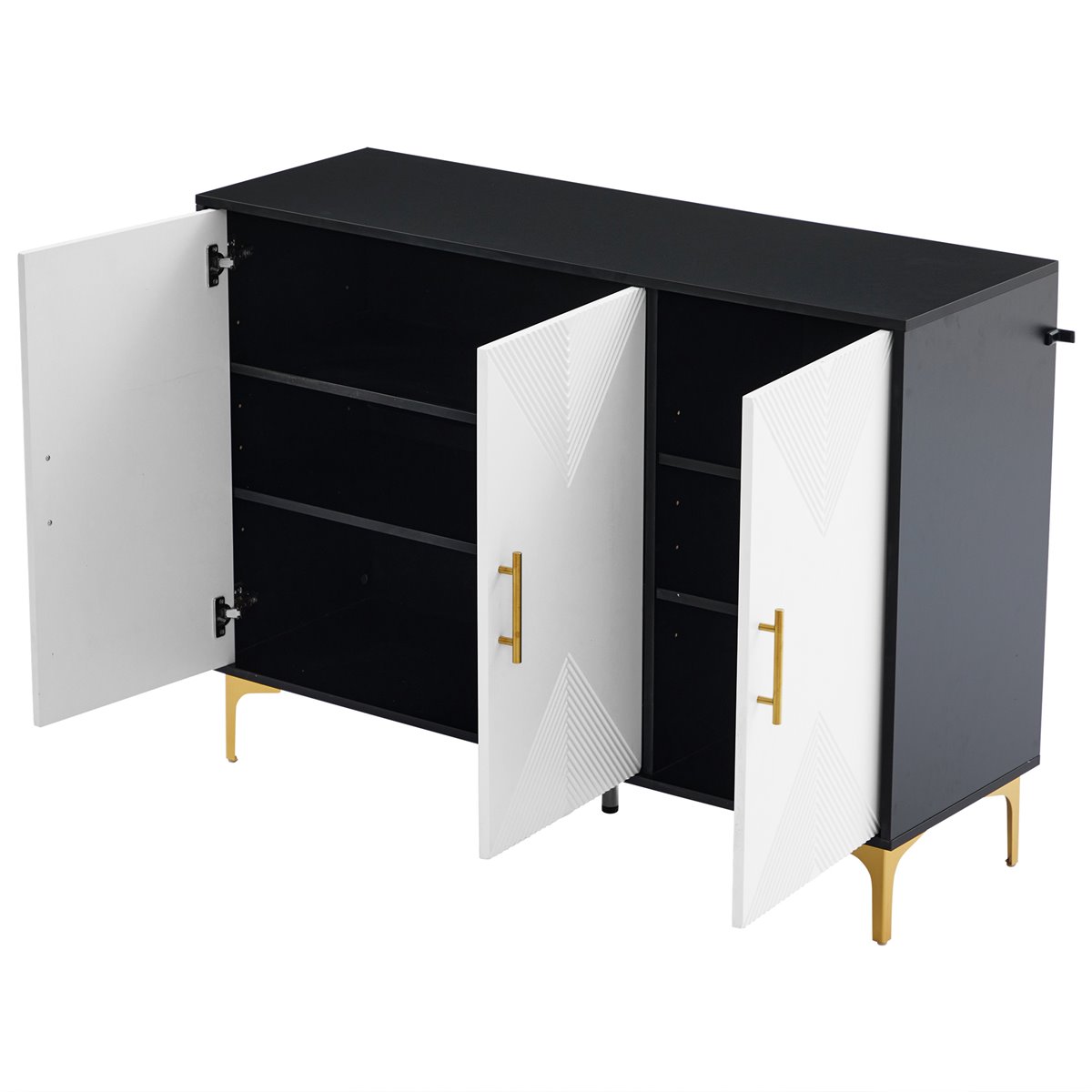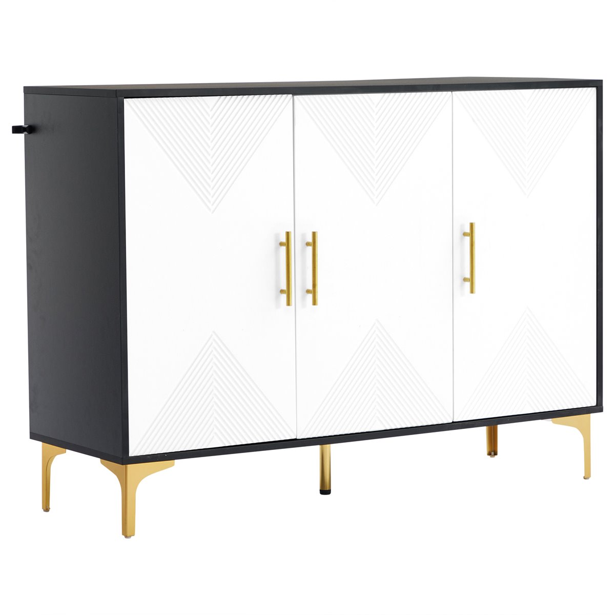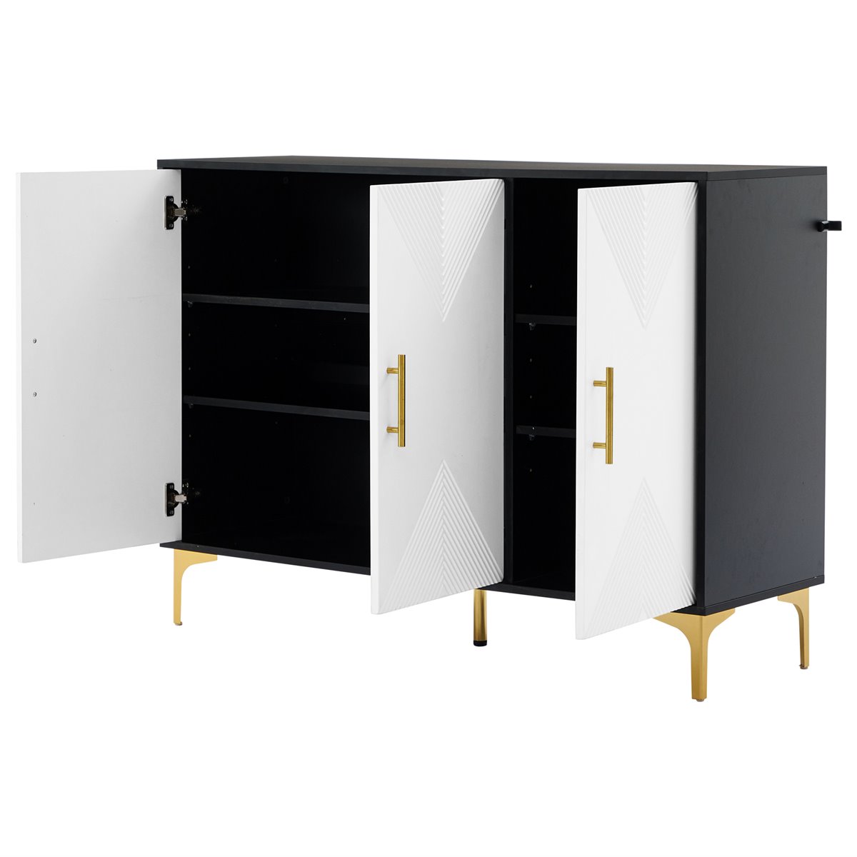 Este aparador boémio com design contemporâneo é uma peça decorativa única que combina funcionalidade e estilo. Os seus elegantes pés metálicos e os luxuosos puxadores dourados realçam os seus detalhes, tornando-o ideal para qualquer tipo de decoração. Com portas com design às riscas brancas e um armário central preto, este móvel é perfeito para adicionar um toque de sofisticação à sua sala de estar, quarto ou sala de jantar.