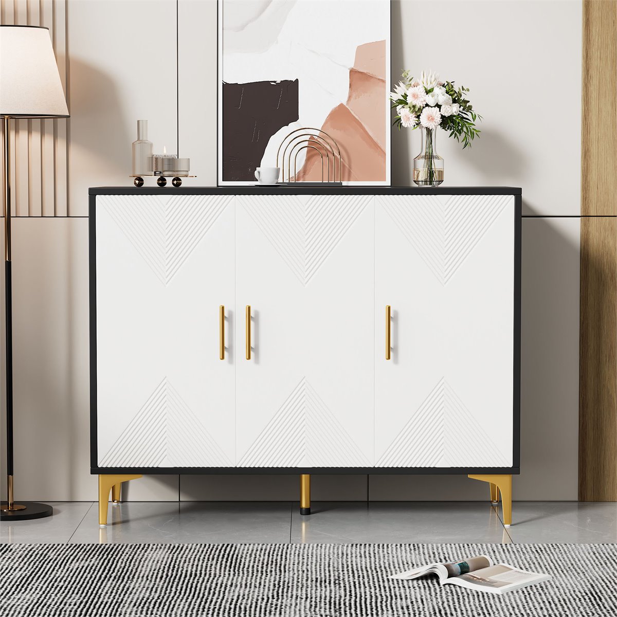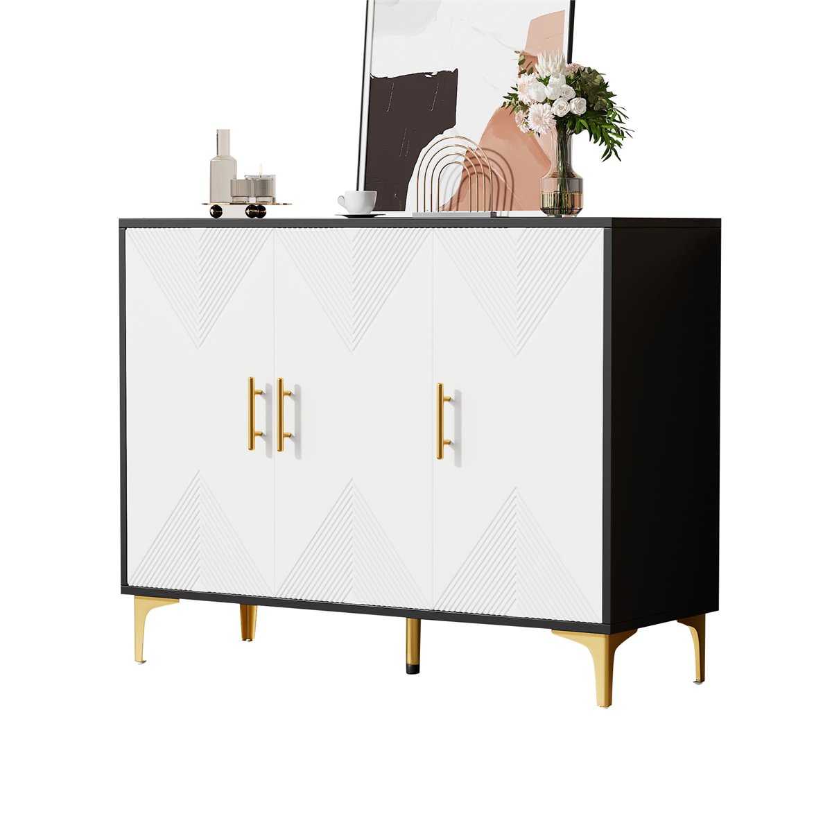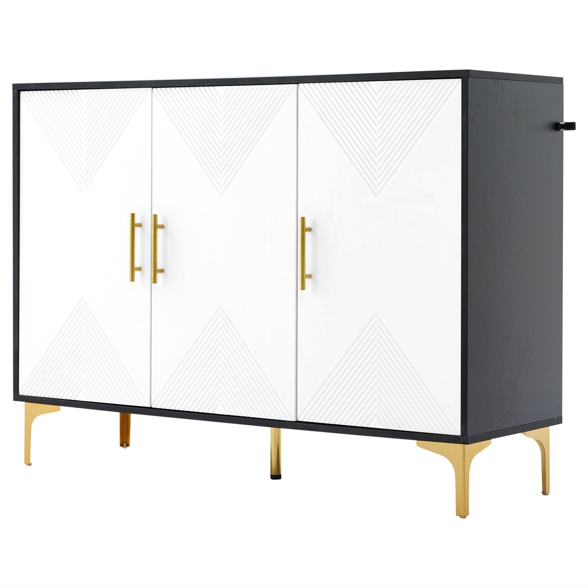 Este aparador boémio com design contemporâneo é uma peça decorativa única que combina funcionalidade e estilo. Os seus elegantes pés metálicos e os luxuosos puxadores dourados realçam os seus detalhes, tornando-o ideal para qualquer tipo de decoração. Com portas com design às riscas brancas e um armário central preto, este móvel é perfeito para adicionar um toque de sofisticação à sua sala de estar, quarto ou sala de jantar.