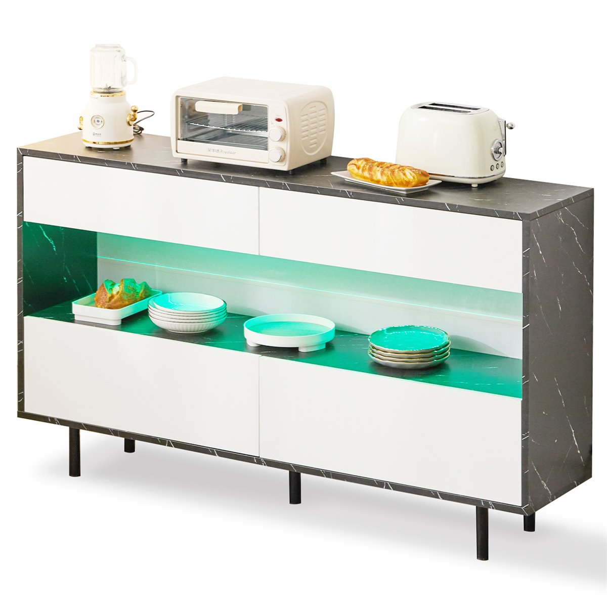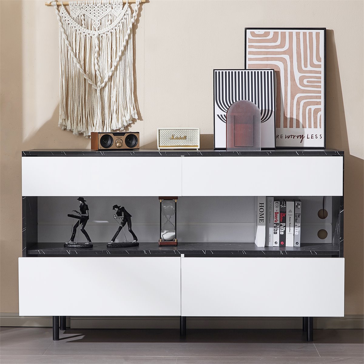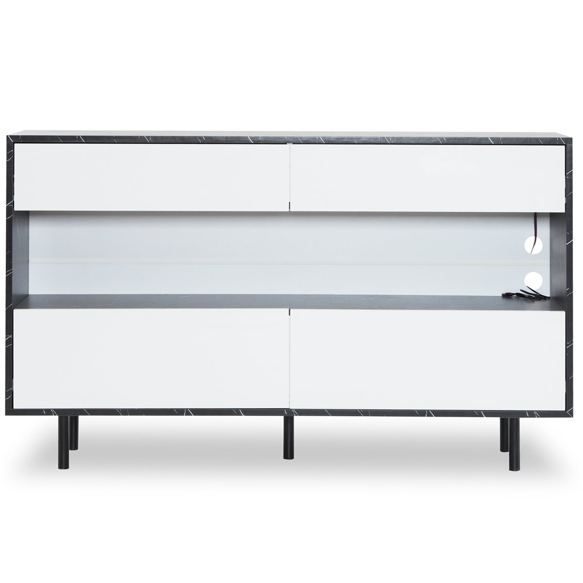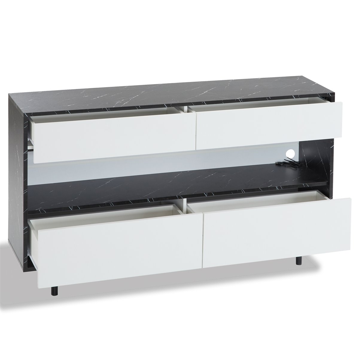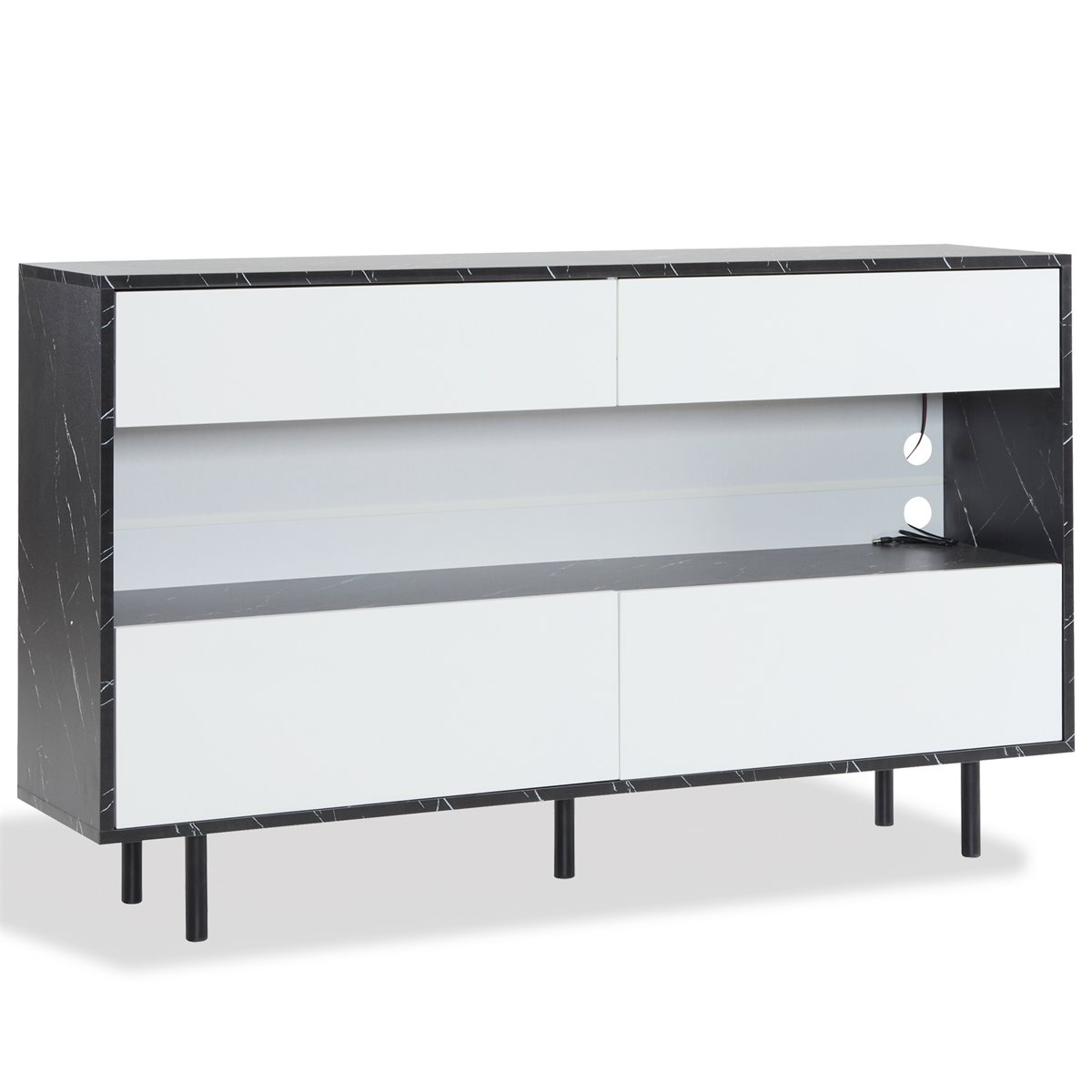 - Espaço de armazenamento aberto com iluminação LED decorativa, que oferece diferentes modos de luz para criar um ambiente acolhedor. Possui orifícios para a gestão de cabos, ideal para dispositivos eletrónicos ou artigos decorativos.