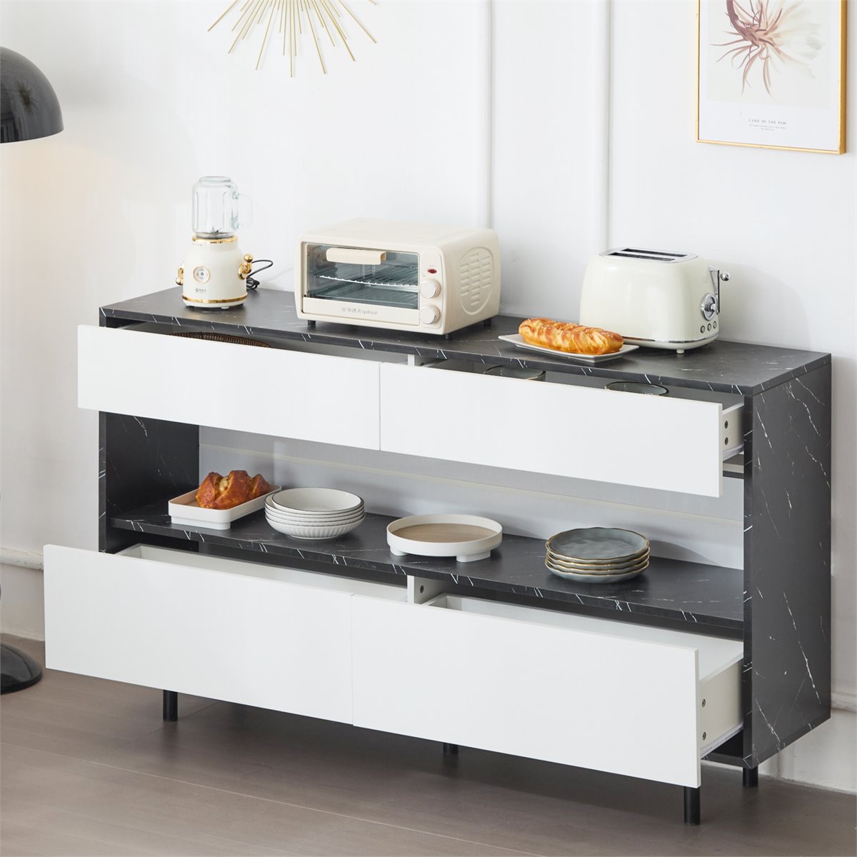 - Com 4 gavetas amplas que proporcionam um armazenamento tranquilo e espaçoso para utensílios, especiarias, documentos e objetos domésticos.