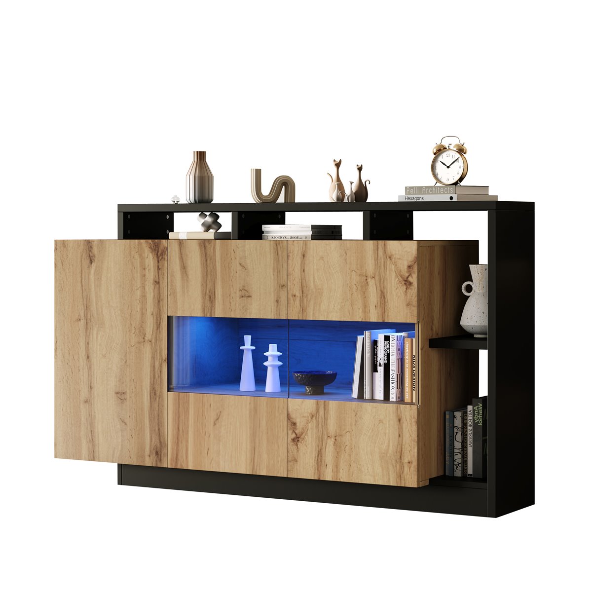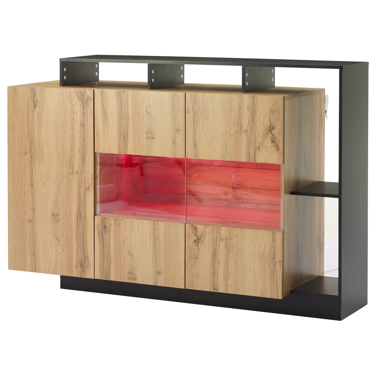 Este elegante aparador LED moderno com controlo Bluetooth combina design estético e tecnologia avançada. Com uma estrutura robusta em MDF ecológico, este móvel de arrumação não só é funcional, como também perfeito para qualquer casa moderna. O seu sistema de iluminação LED RGB, com 16 cores disponíveis, pode ser facilmente controlado através de uma aplicação Bluetooth, ideal para criar ambientes acolhedores durante uma noite de cinema ou animar uma festa.