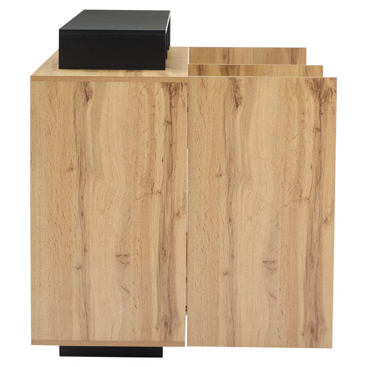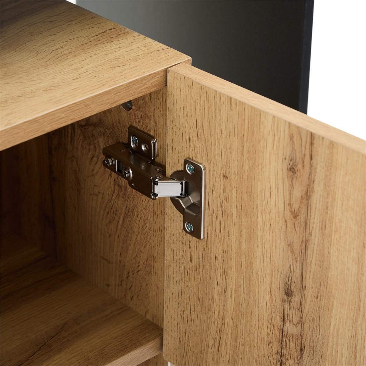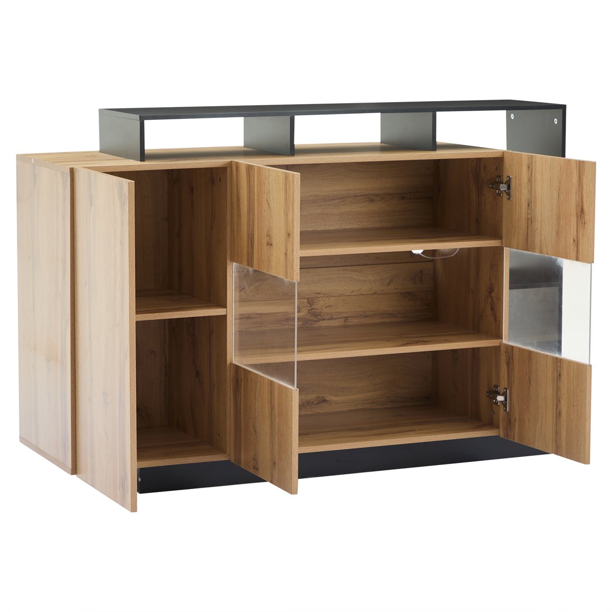 O aparador possui uma distribuição prática para armazenar os seus objetos de forma organizada. Tem três prateleiras ajustáveis (capacidade de carga de 10 kg por prateleira) que são ideais para garrafas, copos ou decorações. Além disso, uma porta possui compartimentos independentes para organizar itens menores. A elegante superfície mate com borda metálica preta dá um toque intemporal que se adapta a qualquer estilo de sala, quarto ou hall de entrada.
