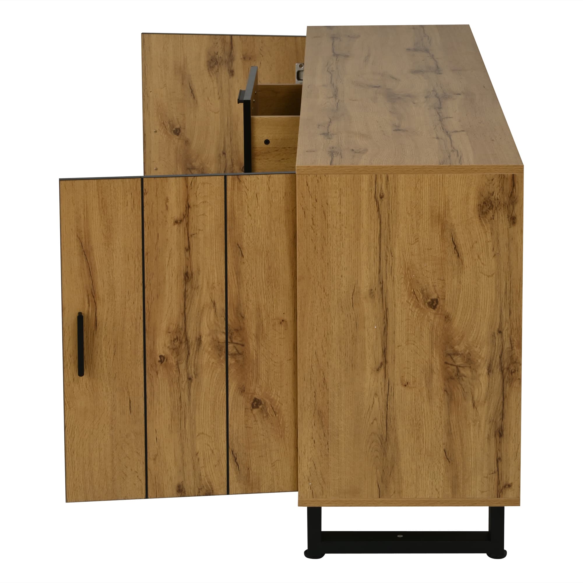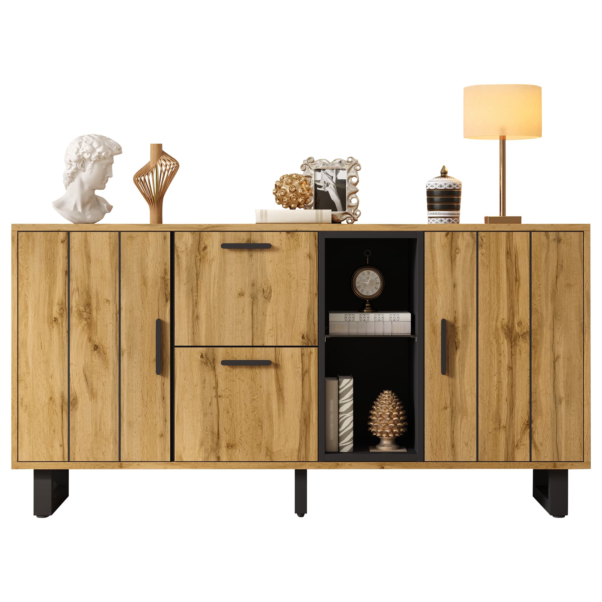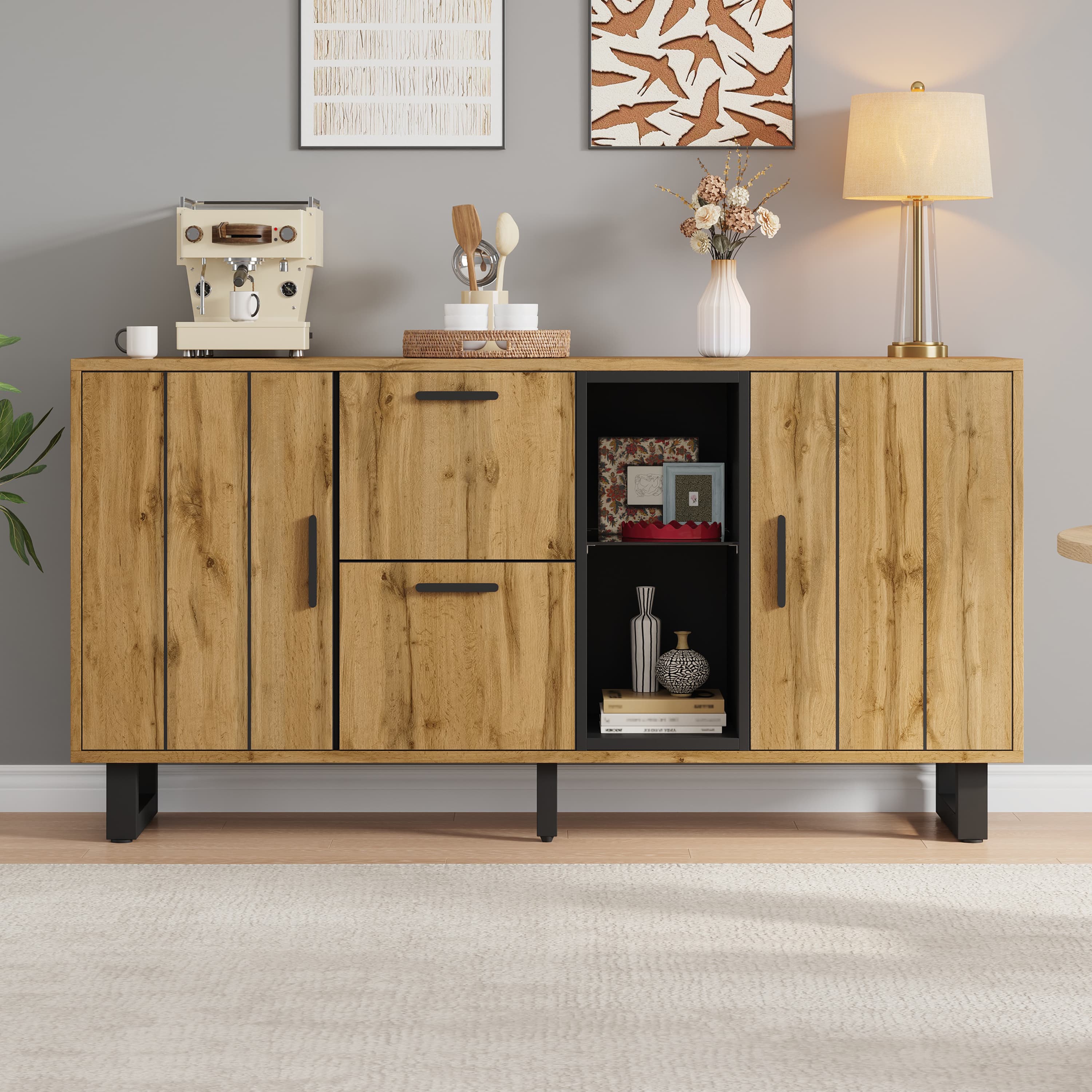- O acabamento em madeira natural com detalhes em preto proporciona uma combinação sofisticada e acolhedora, perfeita para qualquer espaço.