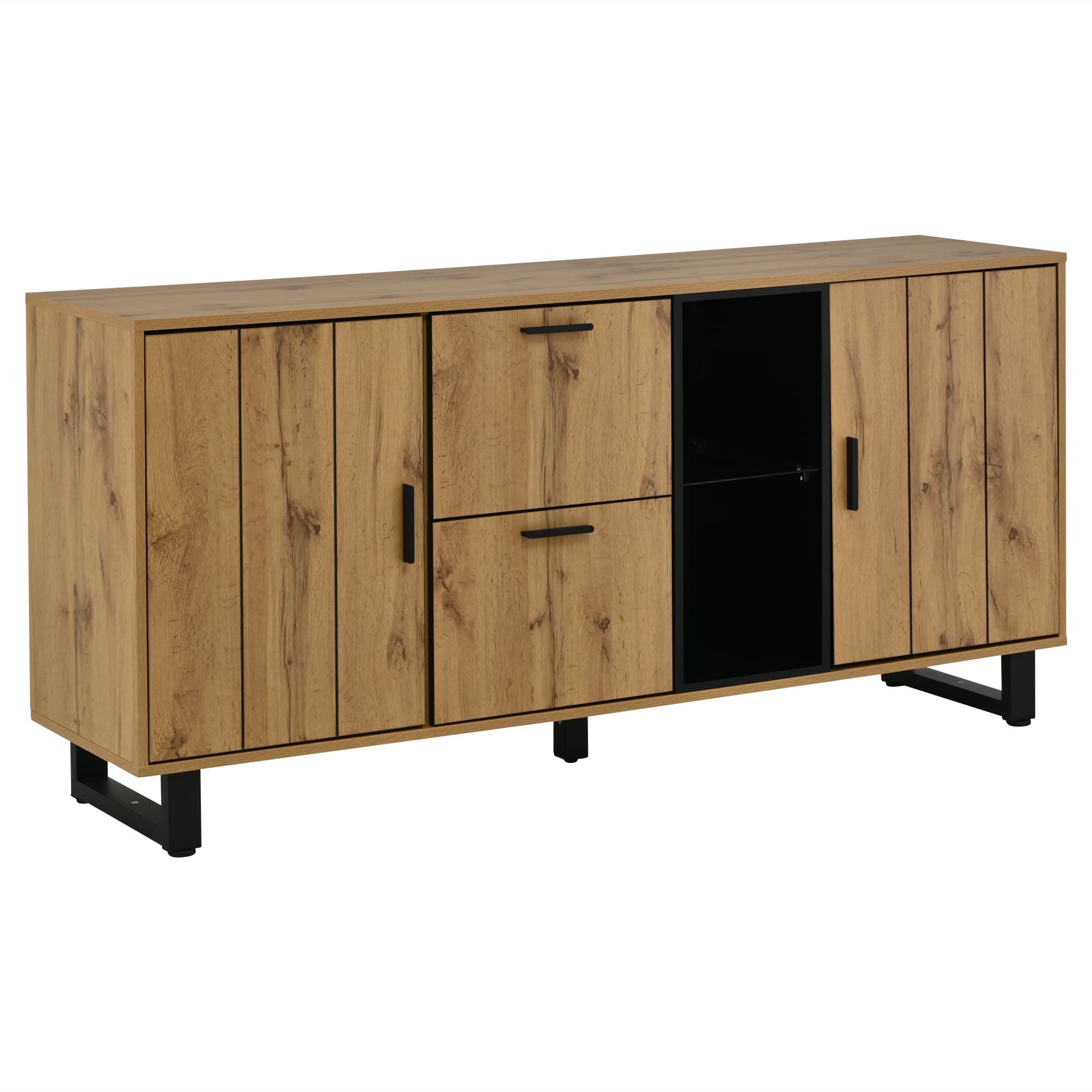 - Concebido com 2 gavetas amplas, 2 portas e uma área aberta com vidro temperado para expor as suas decorações favoritas.