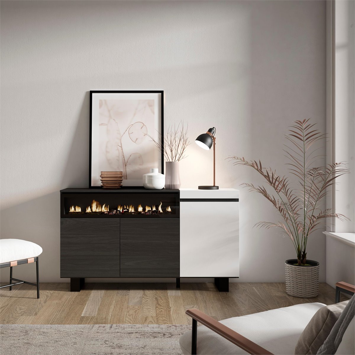 Módulo com 2 portas, grande capacidade de arrumação. Dimensões do módulo: 102 cm. de largura, 75 cm. de altura, 35 cm. de profundidade. Cor carvalho e preto com grão de madeira de tato poroso de alta qualidade.