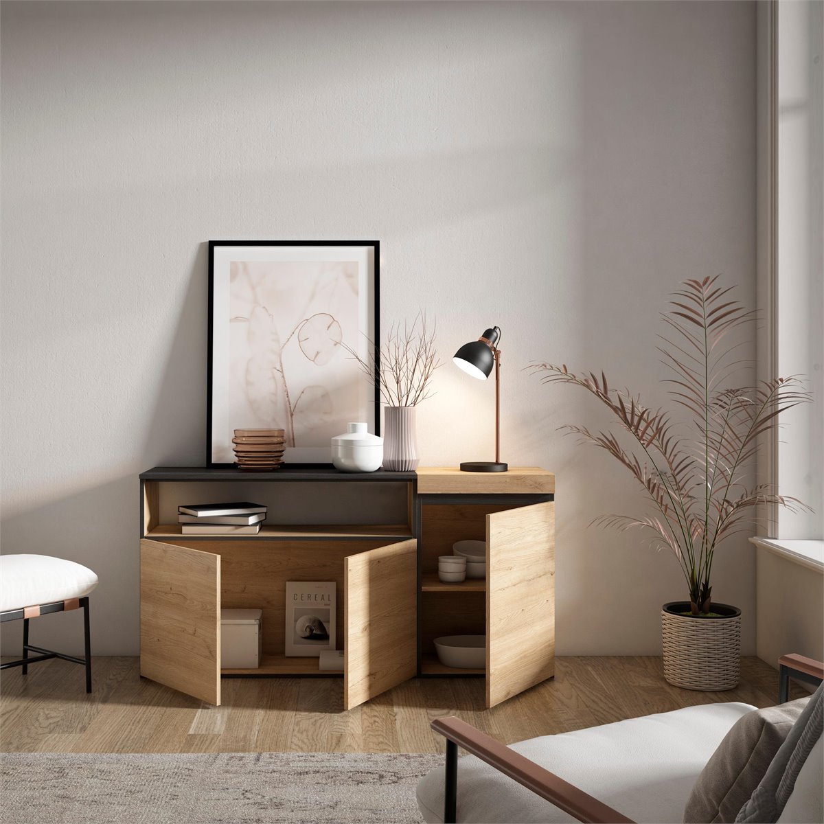 Módulo com 2 portas, grande capacidade de arrumação. Dimensões do módulo: 102 cm. de largura, 75 cm. de altura, 35 cm. de profundidade. Cor carvalho e preto com grão de madeira de tato poroso de alta qualidade.