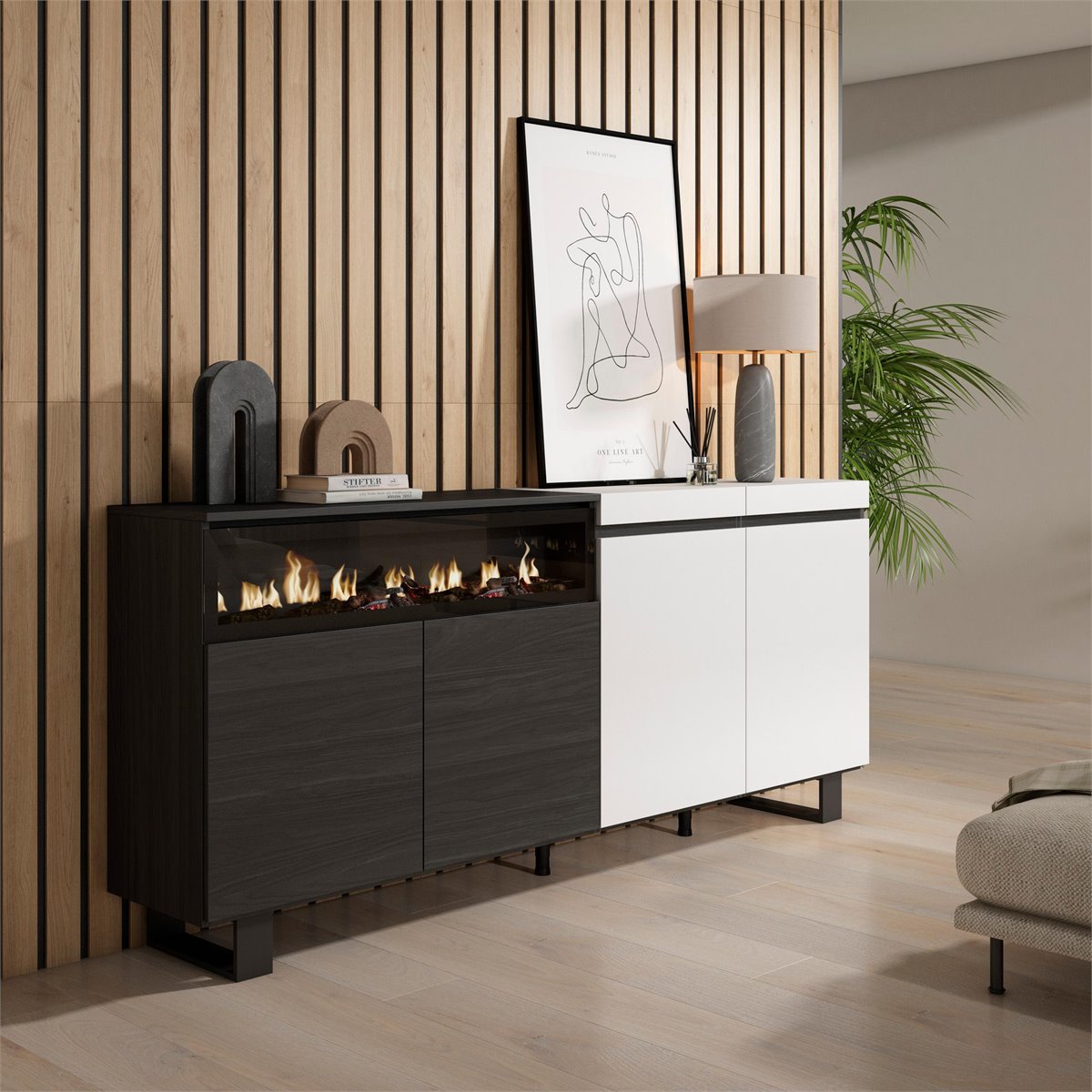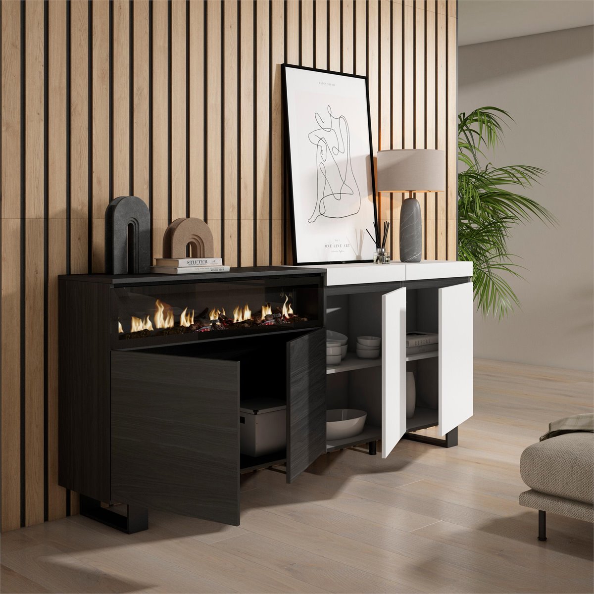 Módulo com porta, prateleira divisória interna. Dimensões do módulo: 51 cm. de largura, 75 cm. de altura, 35 cm. de profundidade. Cor branco sólido fosco e preto com grão de madeira de tato poroso de alta qualidade.