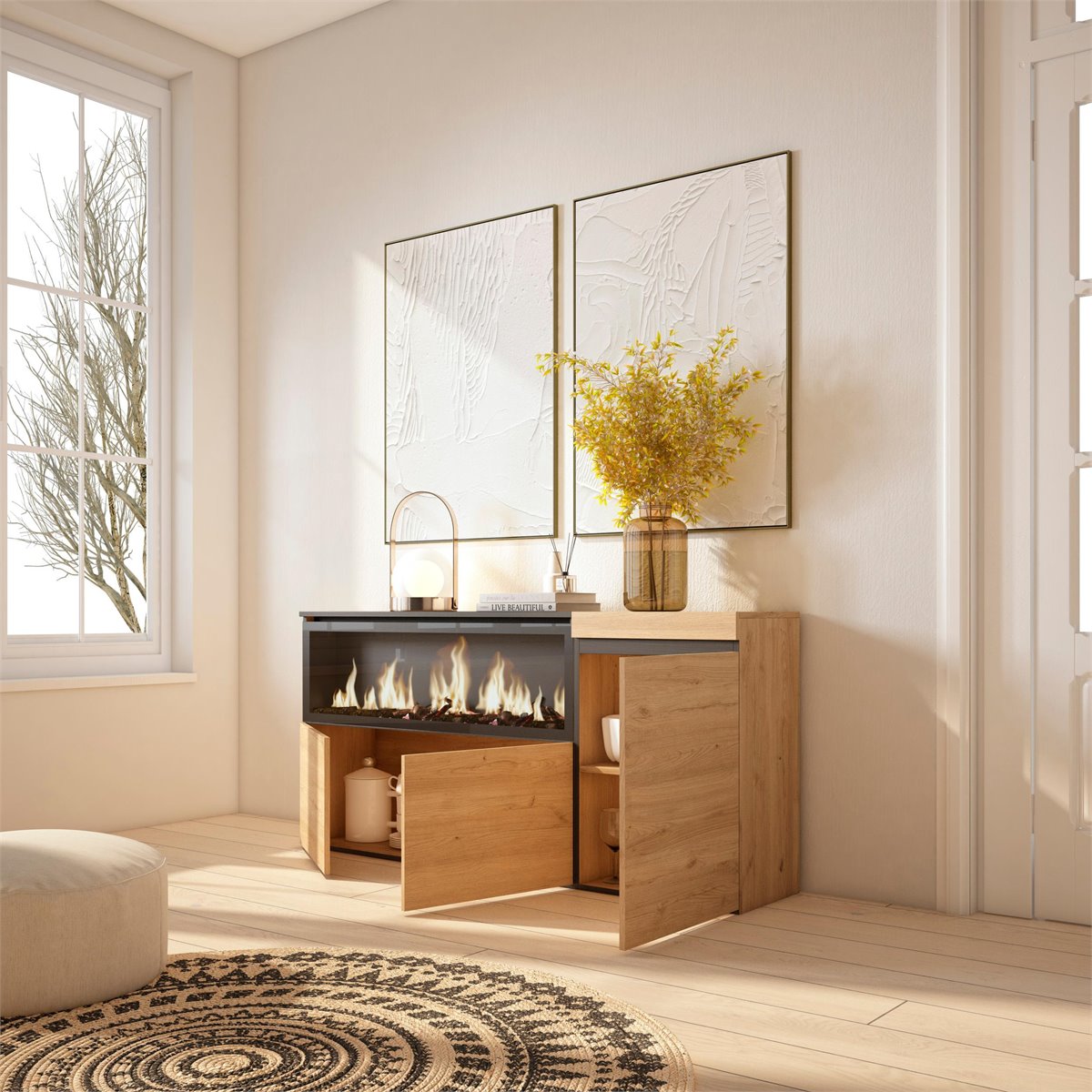 Lareira eléctrica LED. Dimensões: 107cm. de largura, 32cm. de altura. Efeito de fogo 3D incrivelmente realista. Sem risco de queimaduras, pois não incorpora nenhuma fonte de calor. Potência: 34w. Inclui controlo remoto e 3 níveis de intensidade.
