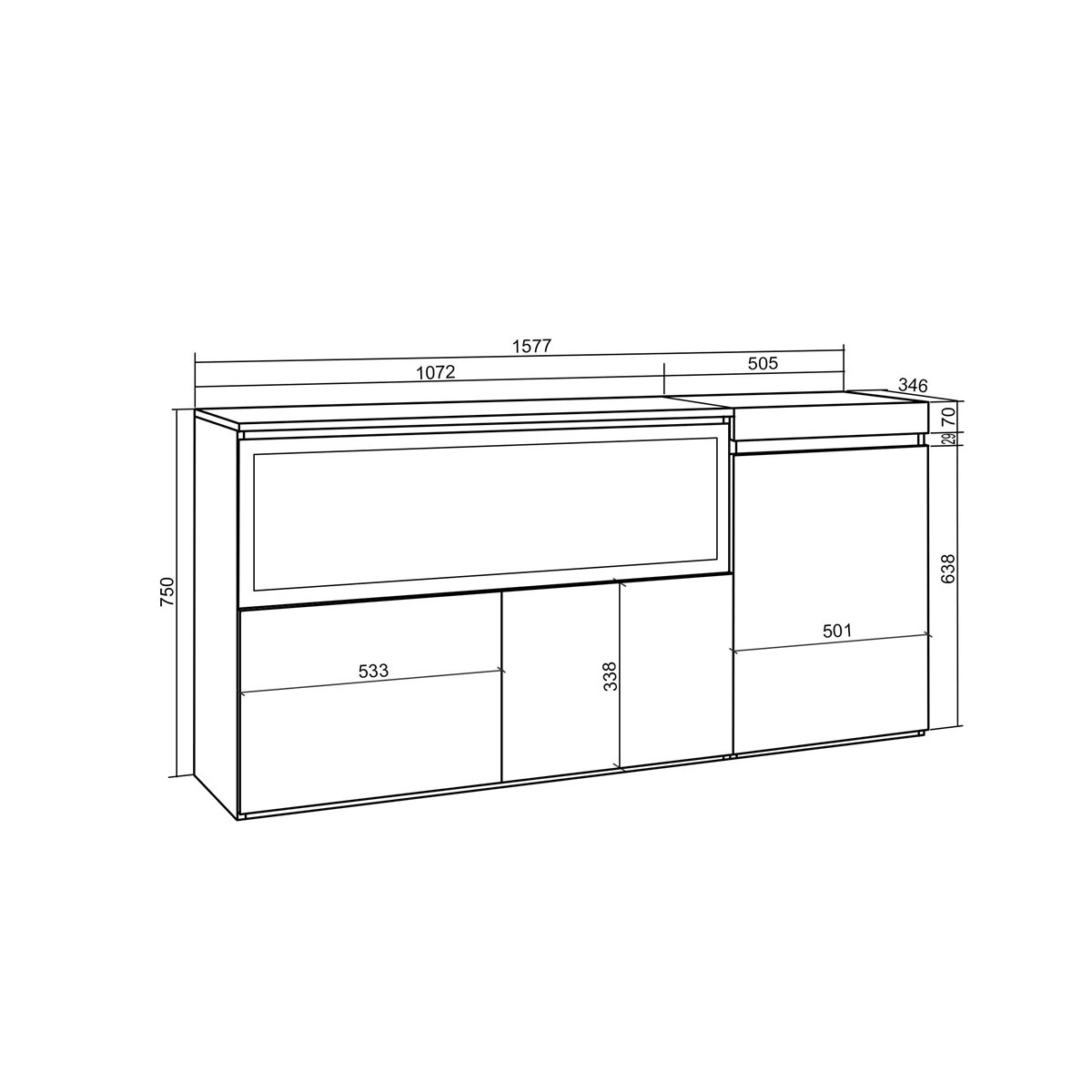 Módulo com 2 portas, grande capacidade de arrumação. Dimensões do módulo: 107 cm. de largura, 75 cm. de altura, 35 cm. de profundidade. Cor carvalho e preto com grão de madeira de tato poroso de alta qualidade.