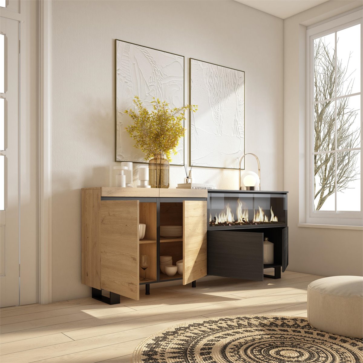 Módulo com porta, prateleira divisória interna. Dimensões do módulo: 51 cm. de largura, 75 cm. de altura, 35 cm. de profundidade. Cor carvalho e preto com grão de madeira de tato poroso de alta qualidade.