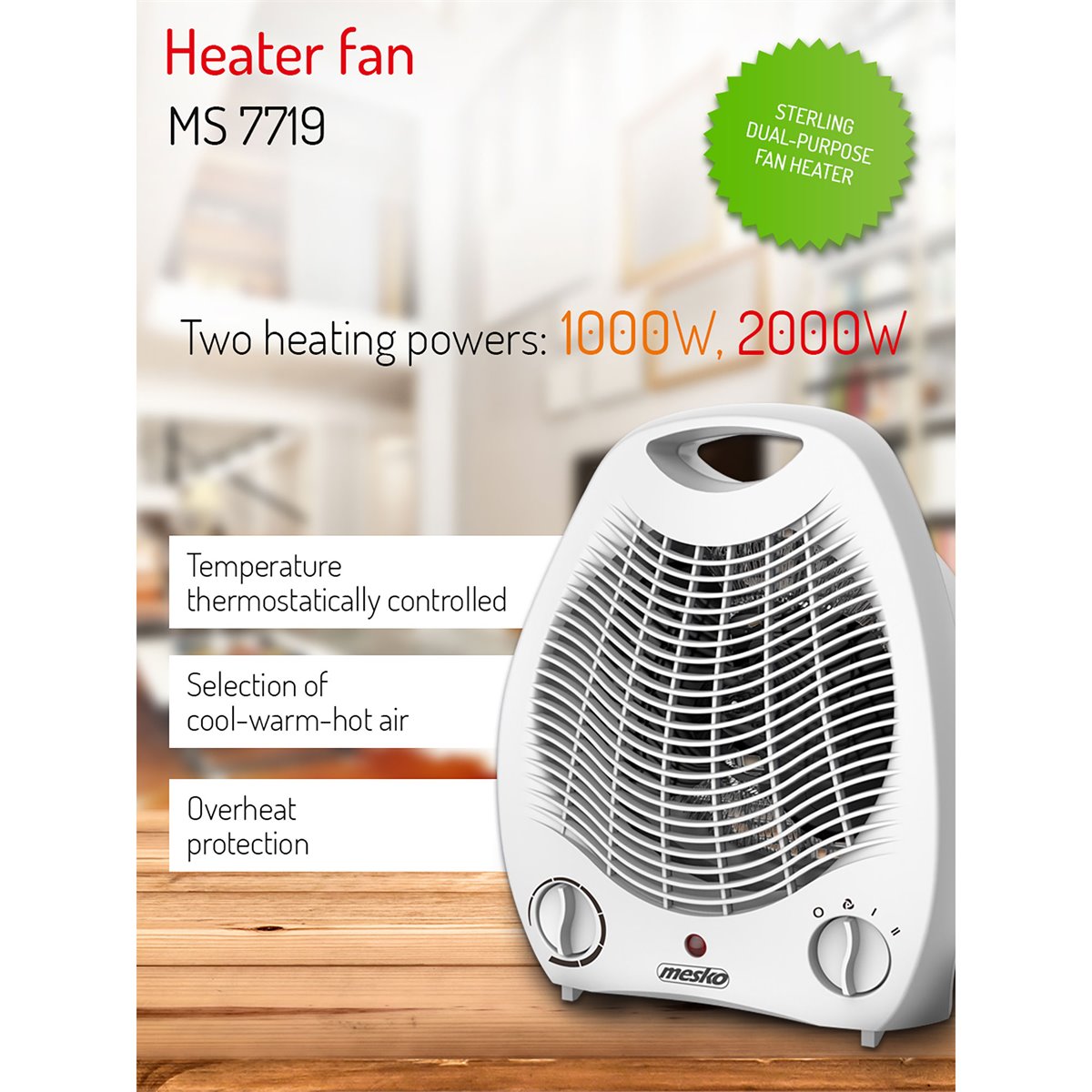 O aquecedor portátil MS7719 é adequado para pequenos quartos na casa, tais como casas de banho ou quartos de dormir, e é também ideal para noites de Outono quando ainda não estamos a utilizar o sistema de aquecimento básico, mas precisamos de aquecer o quarto. O dispositivo funciona silenciosamente e é muito leve e compacto para que o possa levar consigo de quarto em quarto. Tem 2 potências de funcionamento para ajustar o fluxo de ar quente e selector de temperatura controlado termostaticamente. Também pode funcionar como ventilador, pelo que é muito útil tanto em dias quentes como frios. Para maior segurança, o dispositivo está equipado com uma protecção de sobreaquecimento.