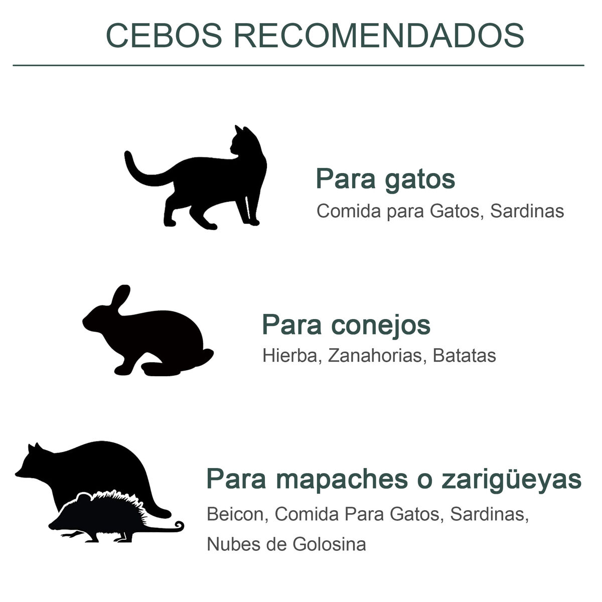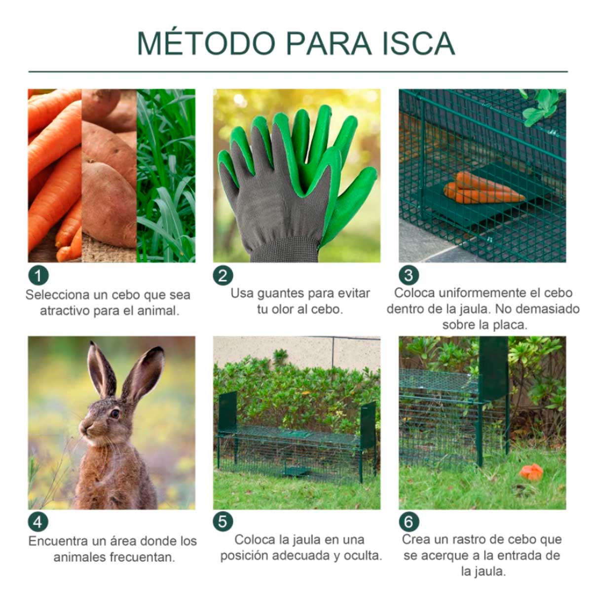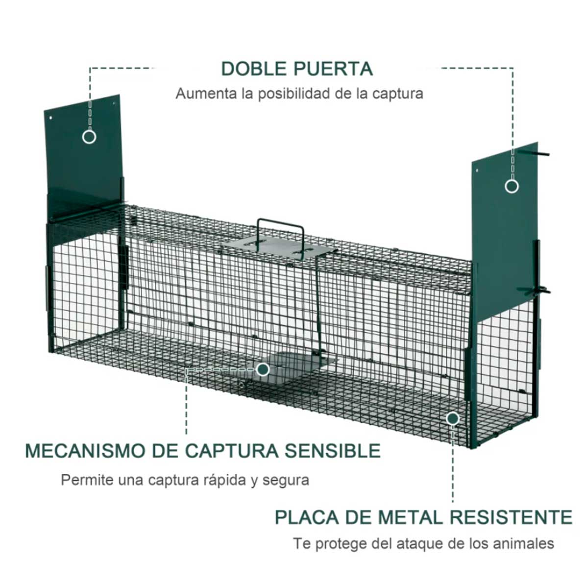- COM 2 PORTAS: Tem 2 portas em ambas as extremidades, que deslizam para baixo, fechando a gaiola quando o mecanismo de armadilhagem é activado - MANIPULAÇÃO SUPERIOR: Esta gaiola tem uma manivela superior para facilitar a deslocação. Isto significa que mover esta armadilha não é uma tarefa complicada - UTILIZAÇÃO NO INTERIOR E NO EXTERIOR: Utilize esta armadilha tanto no interior como no exterior, de acordo com as suas necessidades. Pode ser colocada em casa, no quintal, na garagem, no jardim, na quinta, na floresta, etc. - CAPTURA DE ANIMAIS VIVOS: Captura pequenos gatos, coelhos, martas, guaxinins ou outros pequenos animais. O seu sistema de alta precisão permite a captura eficaz de animais vivos sem os ferir, garantindo assim a segurança dos seus filhos ou animais de estimação - MEDIDAS TOTAIS: 100x25x28 cm (CxLxA); Dimensões da entrada: 23x21 cm (CxA)
