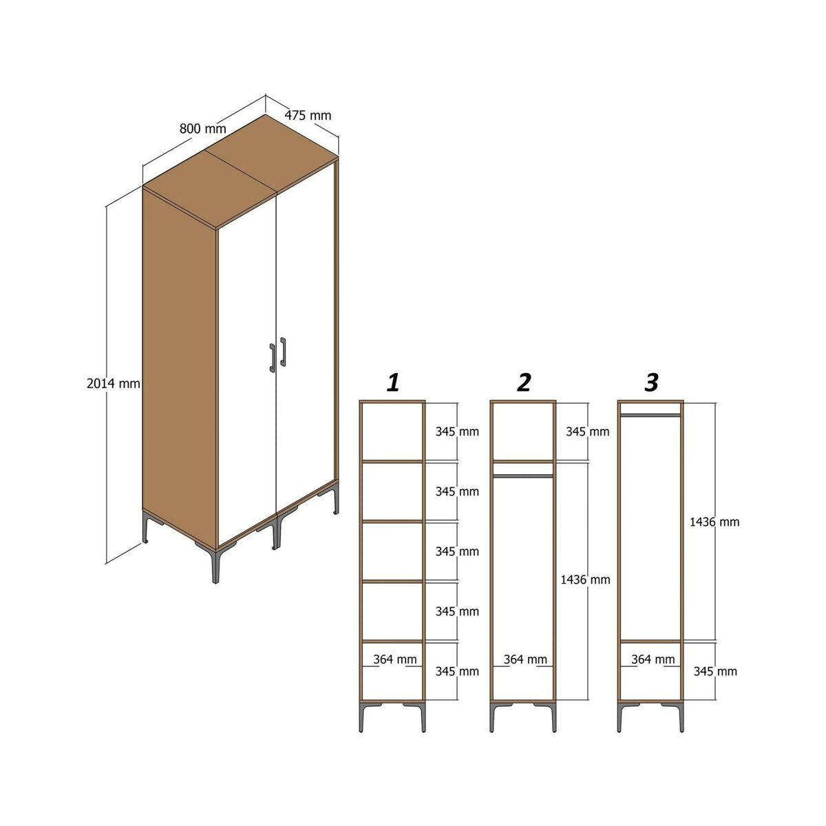 ARMÁRIO 2 PORTAS - Móveis de Quarto, Roupeiro, Roupeiro, 80x201h48 cm, Nogueira e Antracite.