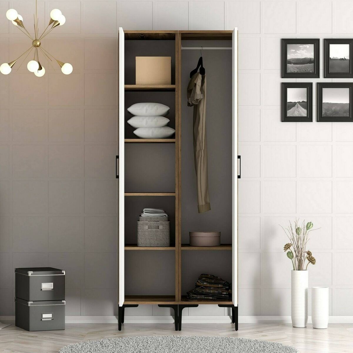 ARMÁRIO 2 PORTAS - Móveis de Quarto, Roupeiro, Roupeiro, 80x201h48 cm, Nogueira e Branco.