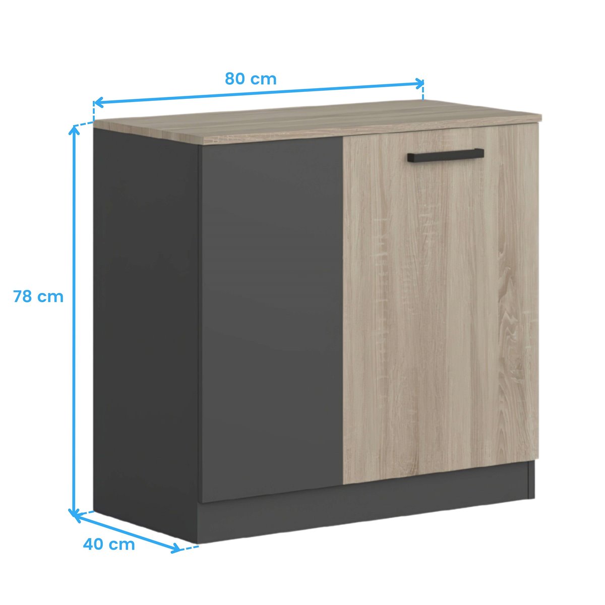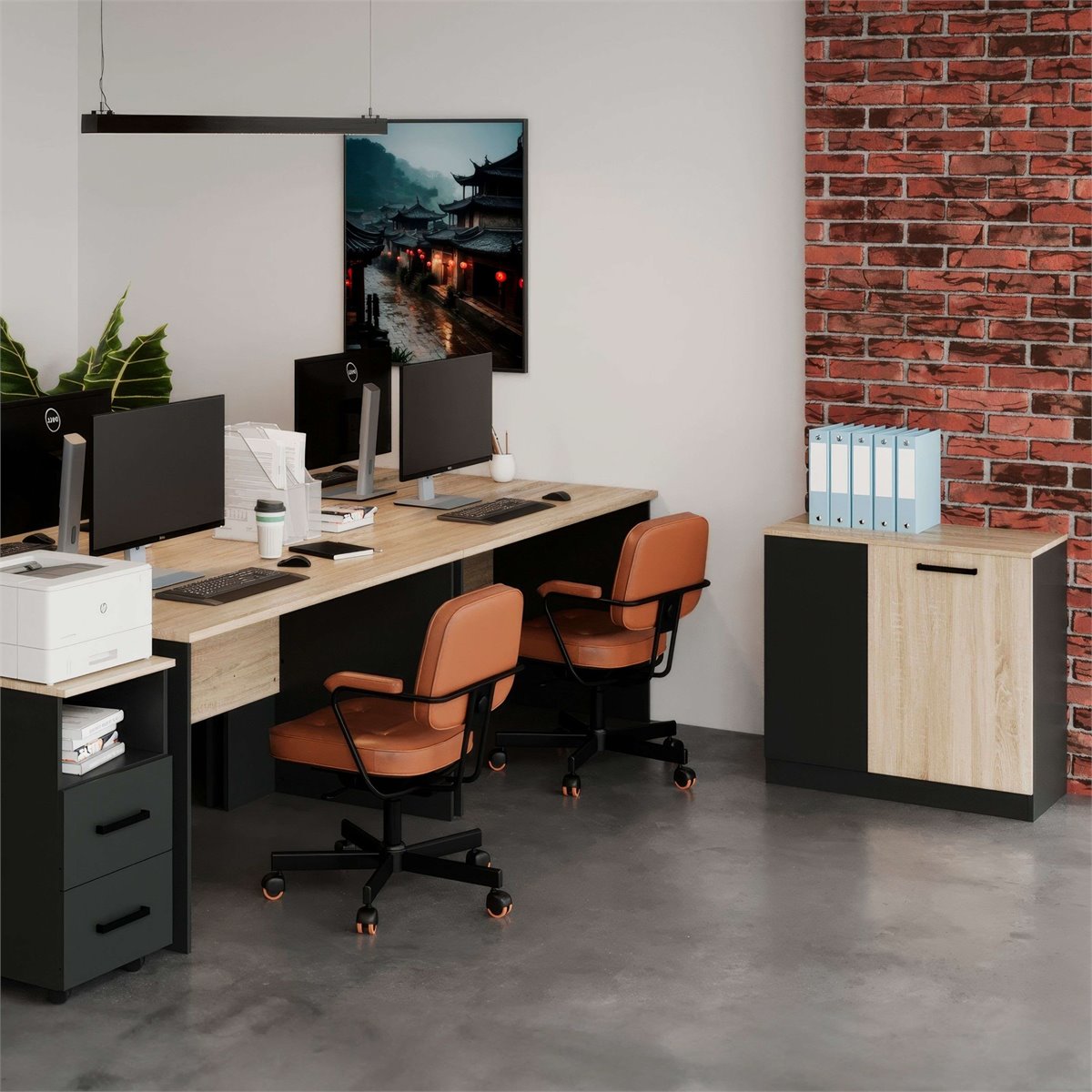 Descubra a solução perfeita para otimizar o espaço do seu escritório com o armário auxiliar baixo Nibis. Este móvel funcional oferece armazenamento prático graças às suas duas portas de batente que escondem duas prateleiras internas, ideais para organizar documentos, materiais de escritório ou pertences pessoais. Feito de melamina, o armário apresenta um atraente acabamento contrastante em carvalho Sonoma e cinza antracite, combinando tons claros de madeira com cinza para uma aparência moderna e profissional, perfeita para qualquer ambiente de trabalho. Seu design compacto e versátil se adapta facilmente a diferentes espaços sem ocupar muito espaço, tornando-o a escolha ideal tanto para escritórios domésticos quanto para locais de trabalho maiores. Este armário não só proporciona organização e eficiência, mas também adiciona estilo ao seu escritório. Dimensões: Largura: 80 cm, Altura: 78 cm, Profundidade: 40 cm. Este móvel vem com um kit de montagem, que inclui um manual de instruções e ferragens.