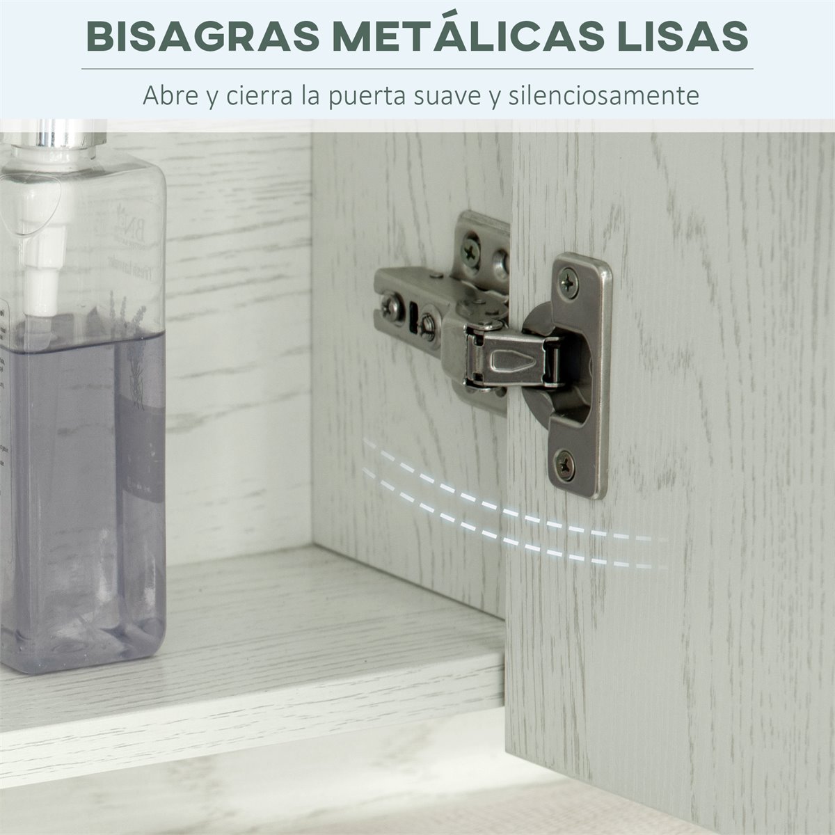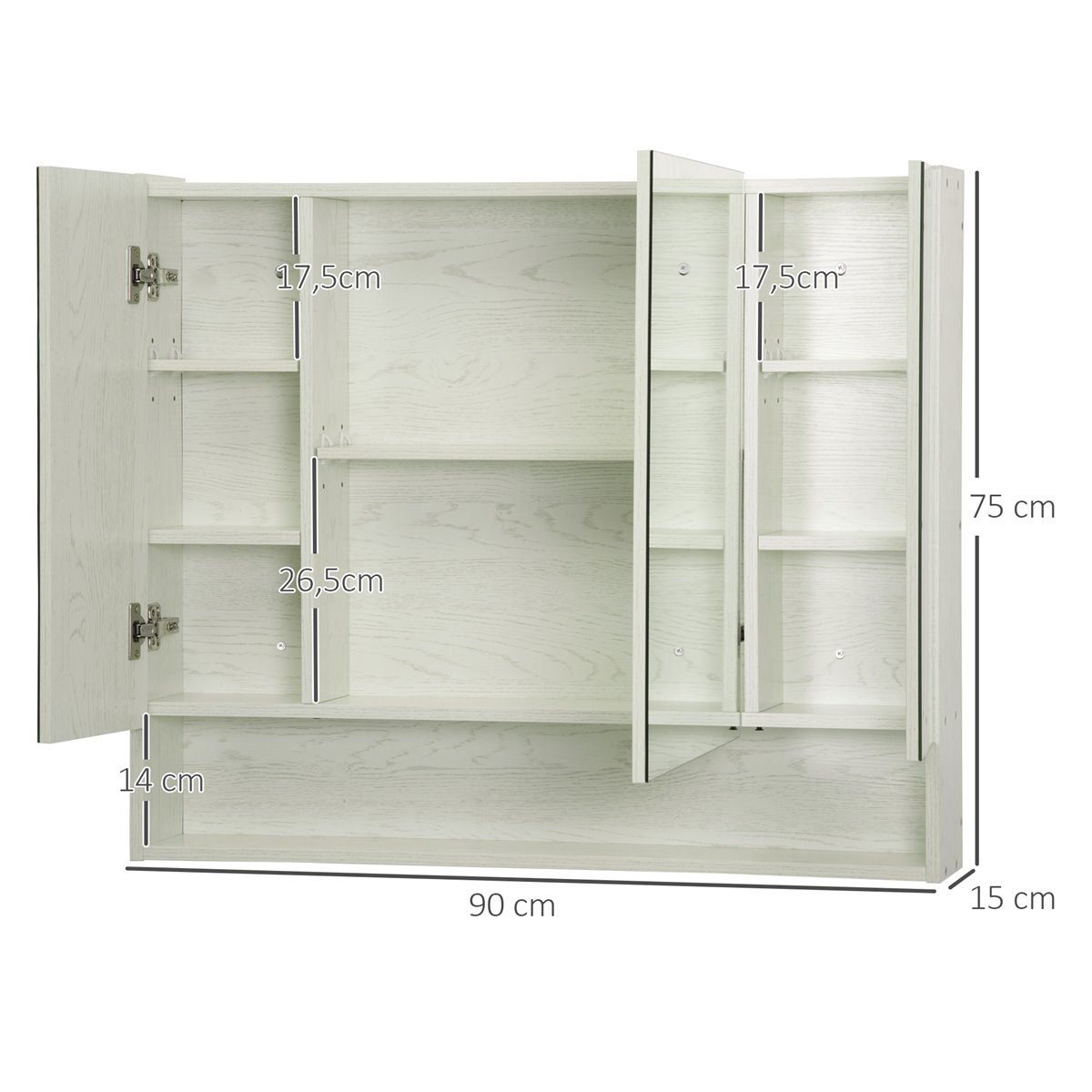 Consiga um espaço organizado e elegante com o armário com espelhos para casa de banho da Kleankin. Este armário combina funcionalidade e design, permitindo-lhe realizar a sua rotina diária e armazenar os seus produtos de higiene de forma prática e segura. Com acabamento em melamina, é resistente à humidade, facilitando a sua manutenção e limpeza. Ideal para quem procura um ambiente prático, moderno e bem organizado Características: - O desenho montado na parede economiza espaço, otimizando o ambiente da casa de banho - Possui um amplo espaço de arrumação, ideal para guardar produtos de higiene pessoal, perfumes e outros itens essenciais - A prateleira ajustável em 3 níveis oferece flexibilidade para organizar os objetos de acordo com as suas necessidades - As dobradiças com amortecimento proporcionam um fecho suave e silencioso - Fabricado em MDF com revestimento em melamina de madeira, garante resistência e durabilidade - Requer montagem Especificaciones: - Cor: Madeira Clara - Materiais: MDF e vidro - Medidas totais: 90x15x75 cm (CxLxA) - Medidas do espelho: 50x60 cm (CxA)● Medidas do compartimento interno (central): 48x12x55 cm (CxLxA) - Medidas do compartimento interno (lateral): 18x12x14 cm (CxLxA) - Medidas da prateleira aberta: 87x12x14 cm (CxLxA) - Carga máxima: 15 kg (total), 5 kg (cada prateleira) - Referência: 834-425WT O pacote inclui: - ● 1 x Armário com espelho; ● 1 x Manual de instruções