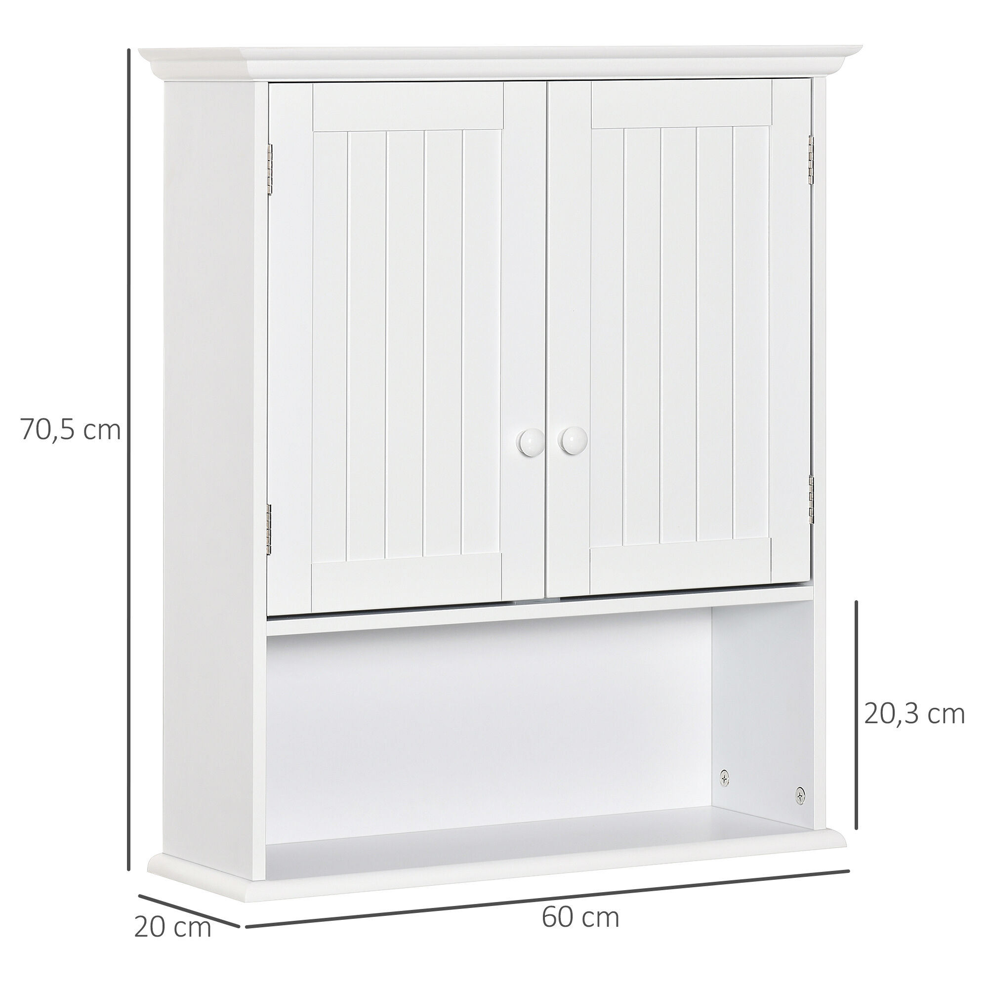 - DESIGN E ESPAÇO: Este armário de parede caracteriza-se pelo seu design moderno em branco elegante e pelo seu design economizador de espaço, perfeito para guardar todos os seus utensílios de casa de banho e até mesmo utensílios de cozinha e outros artigos em sua casa - ESPAÇO DE ARRUMAÇÃO LARGO: Este armário de porta dupla tem uma prateleira ajustável para guardar produtos de diferentes tamanhos. Além disso, tem uma prateleira inferior que proporciona espaço extra para o seu lava-loiça - ESTRUTURA FORTE: Fabricado em painel de madeira MDF, é uma peça de mobiliário resistente e de baixa manutenção. Os puxadores das portas facilitam a abertura e o fecho das portas - GUARDE O SEU ESPAÇO NA PAREDE: Poupe espaço no chão e pendure-o na parede. Este armário com porta oferece-lhe uma solução de poupança de espaço para casas de banho pequenas. Dispõe de uma prateleira interior regulável em 3 posições - MEDIDAS TOTAIS: 60x20x70,5 cm (CxLxA). Peso máximo suportado: 13 kg (total), 5 kg (prateleira exterior) e 3 kg (prateleira interior). Montagem necessária