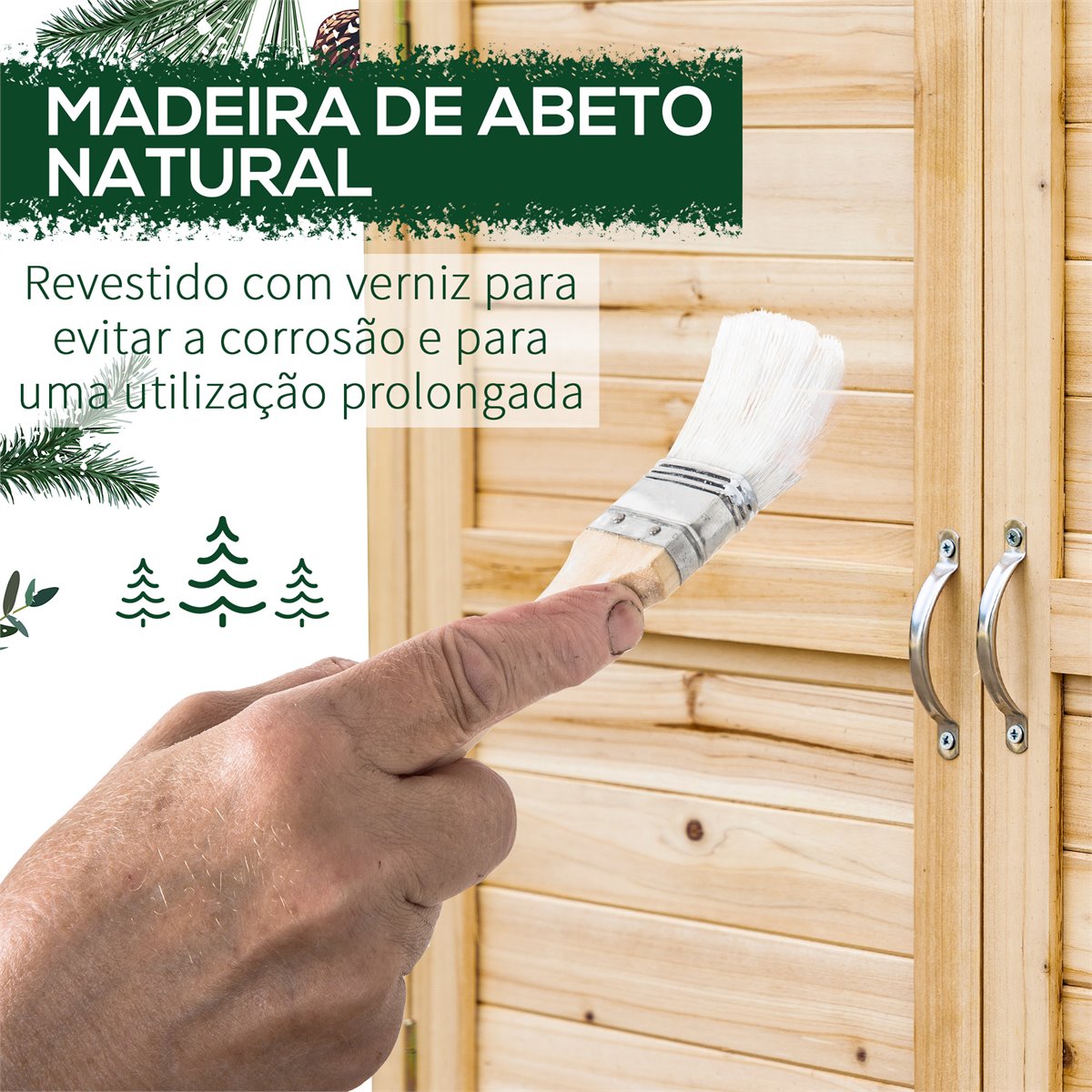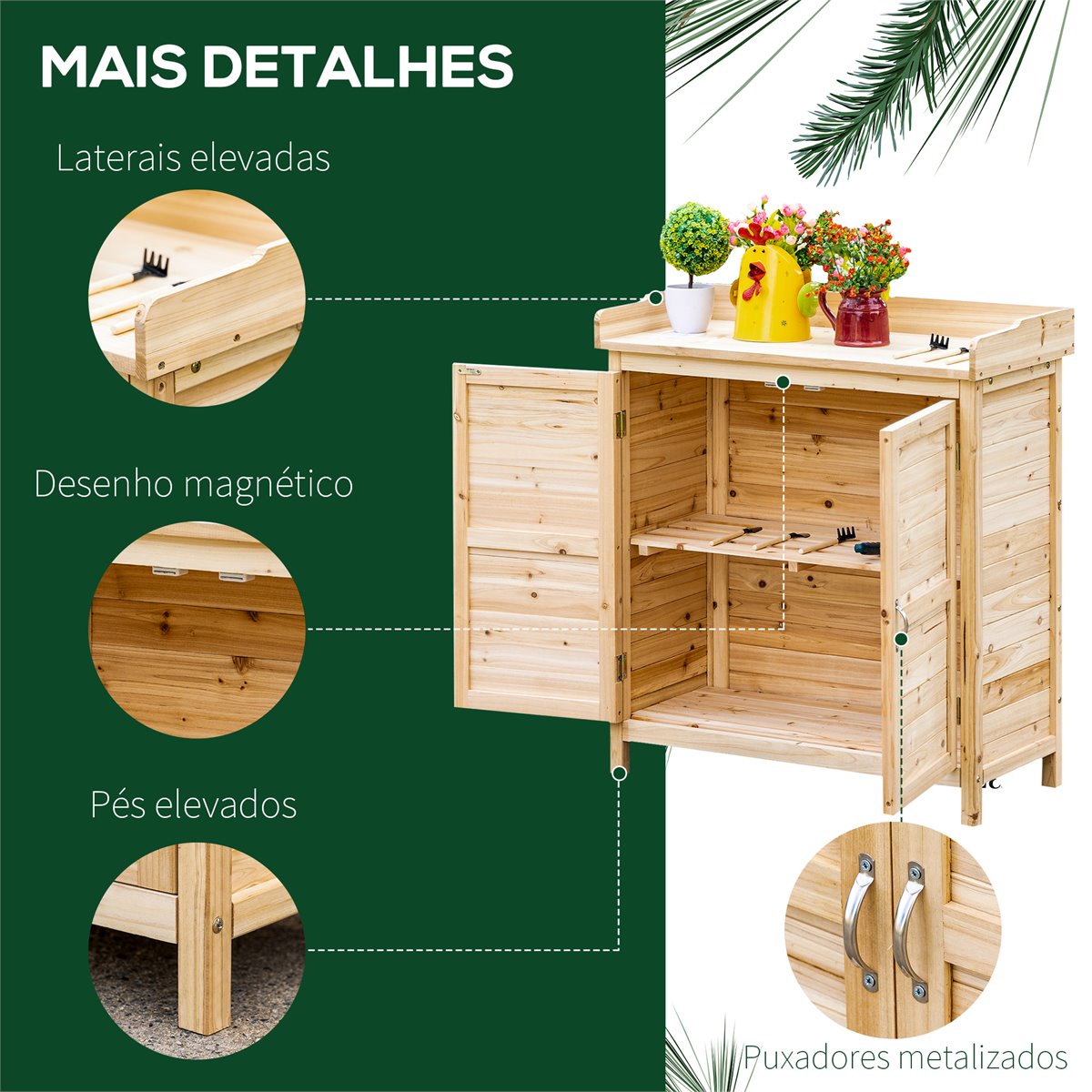 Se necessita de manter os seus acessórios de jardim organizados, este abrigo de jardim da Outsunny é ideal! Este abrigo de jardim de madeira oferece amplo espaço de arrumação, sendo composto por 2 prateleiras e uma ampla bancada. Fabricado em madeira de abeto com revestimento em verniz, é resistente e ideal para uma utilização prolongada. Além disso, a base elevada protege os seus objetos da humidade. Otimize o seu espaço exterior trazendo para casa este prático armário de arrumação exterior! Características: - Armário de jardim ideal para guardar ferramentas de jardinagem, mangueiras, entre outros - Fabricado de madeira de abeto resistente e ideal para um uso prolongado - Composto por 2 prateleiras e uma ampla bancada - A borda elevada da bancada evita que os seus objetos caiam-se - O desenho elevado protege os seus objetos da humidade - Possui puxadores e fechadura magnética para facilitar o acesso ao interior - Requer montagem Especificaciones: - Cor: Madeira - Material: Madeira de abeto - Medidas totais: 83x40x92 cm (CxLxA) - Medidas da bancada: 80x38 cm - Altura da borda elevada: 7,5 cm - Prateleira interior: 75,5x30 cm - Medidas da porta: 36,5x68 cm (cada) - Capacidade máxima de carga: 50 kg (bancada) e 15 kg (prateleira) - Referência: 84B-630 O pacote inclui: - ● 1x Armário de armazenamento; ● 1x Manual de instruções