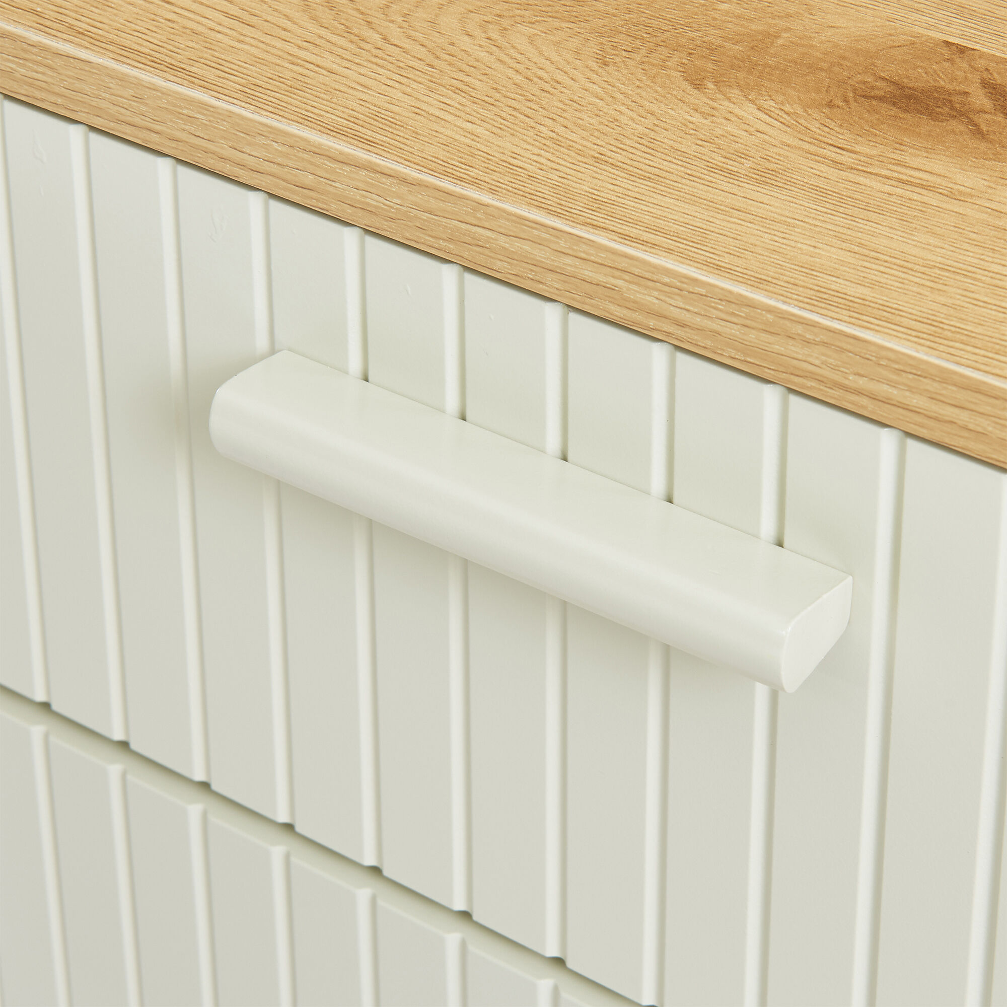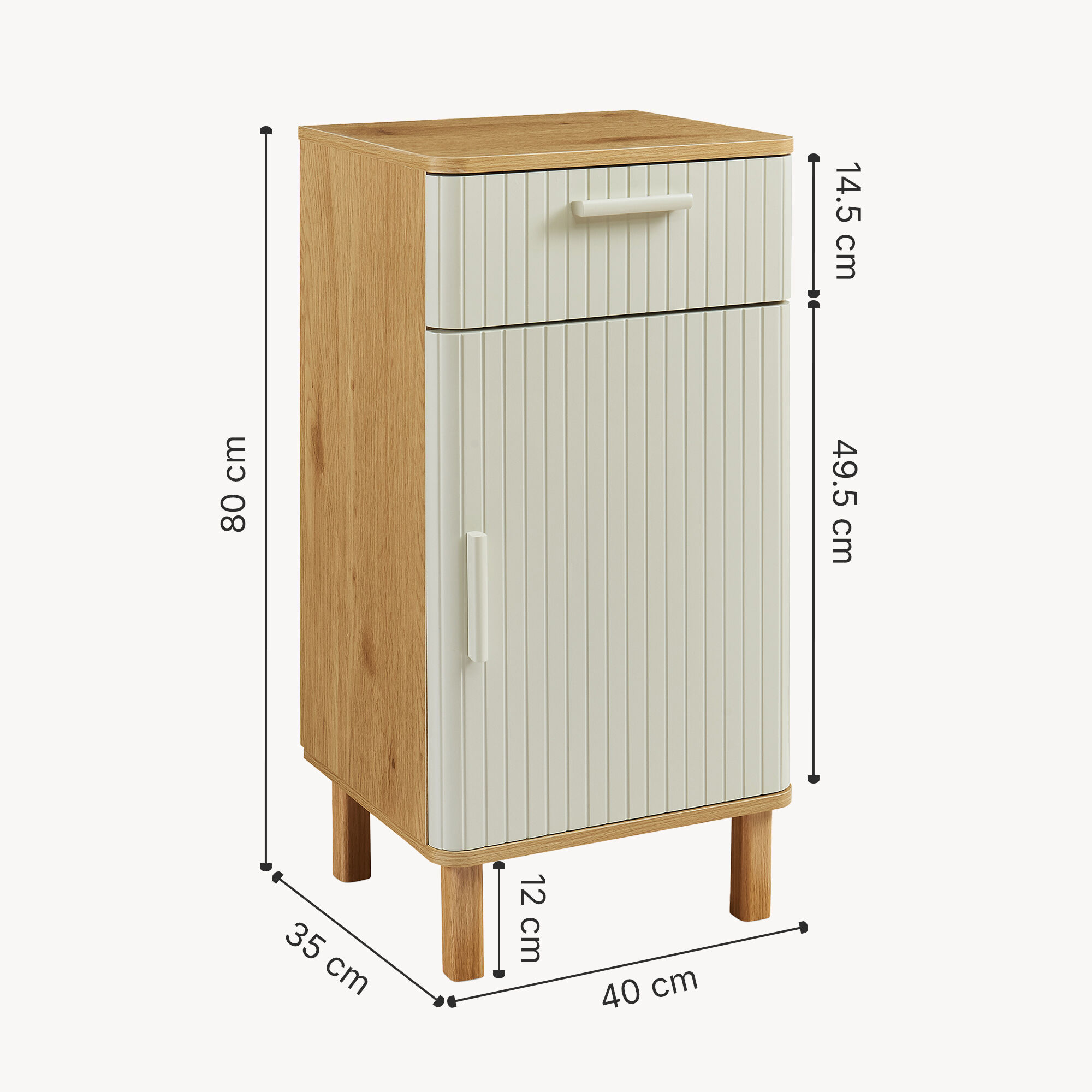 O armário tem uma porta com uma frente estriada. Assim, é fácil de abrir e fechar, permitindo-lhe aceder facilmente aos seus utensílios de casa de banho. A gaveta superior oferece outra opção para armazenar todos os seus itens, como cosméticos, acessórios para o cabelo ou sabonete de reserva.