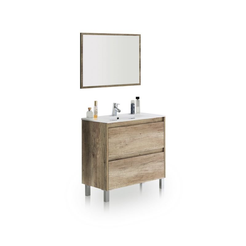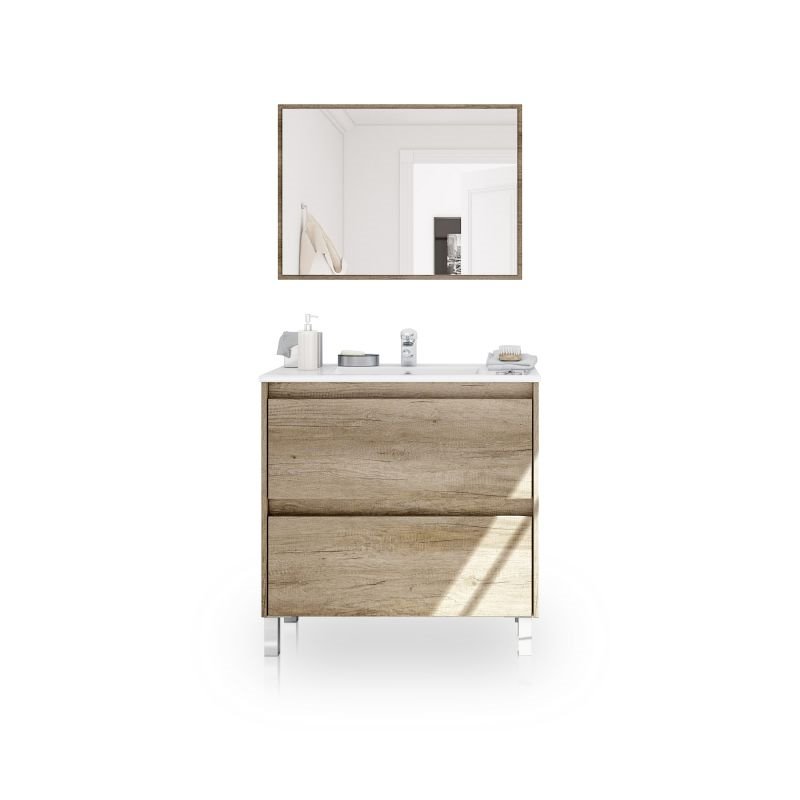 A sua estética limpa e elegante adapta-se facilmente às casas de banho modernas, proporcionando um ar quente graças ao seu acabamento com efeito de madeira natural. O espelho a condizer complementa o conjunto, ampliando visualmente o espaço e iluminando o ambiente.