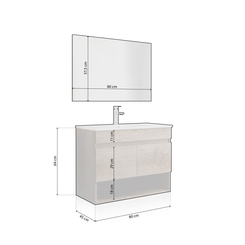 - Dimensões do móvel: 80 cm (comprimento) x 45 cm (profundidade) x 64 cm (altura)