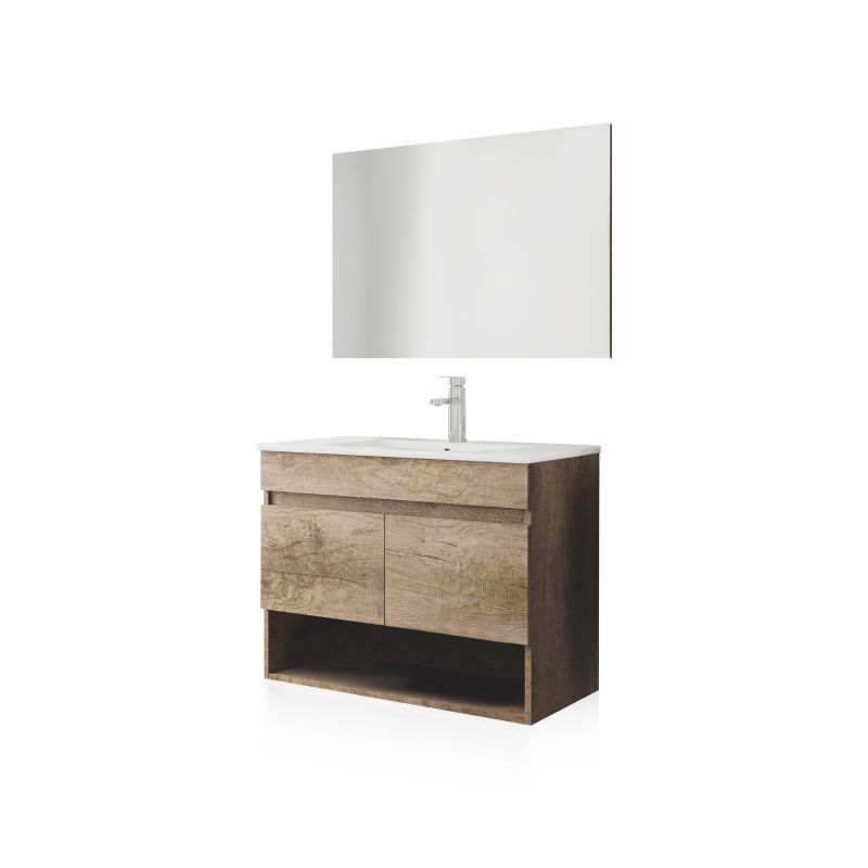 Por cima do móvel encontra-se um tampo concebido para a instalação de um lavatório (não incluído), permitindo personalizar a escolha de acordo com as necessidades e o estilo da casa de banho. O conjunto é complementado por um grande espelho de linhas puras, que reflecte a luz e aumenta a sensação de amplitude do espaço.