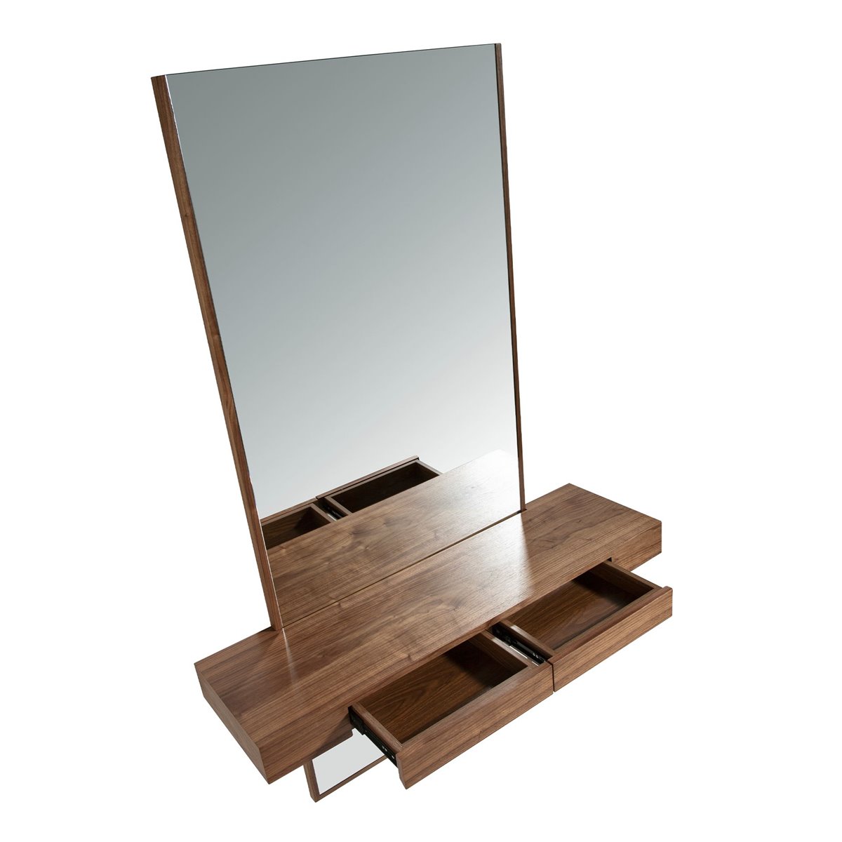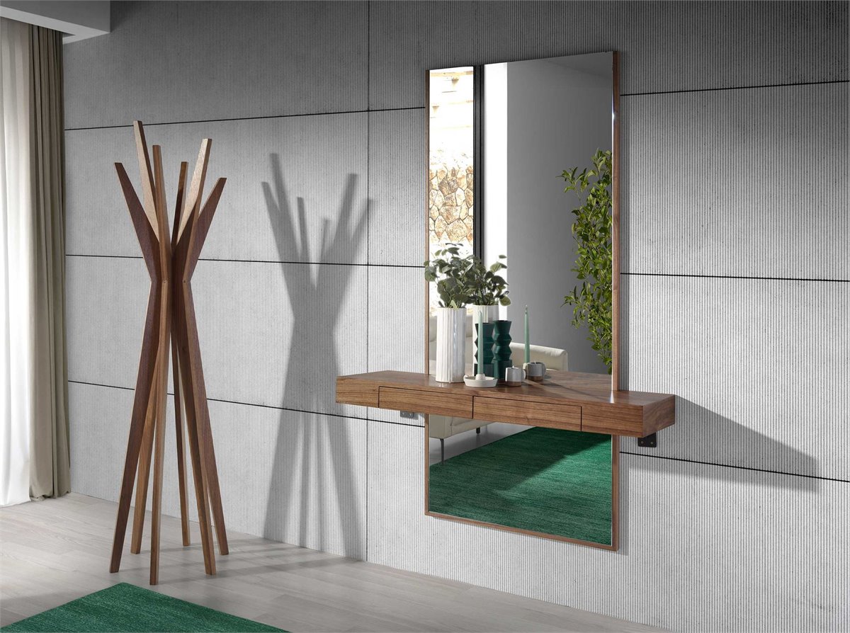 Espelho retangular para hall com design moderno e moldura de madeira folheada a nogueira natural. Esse corredor vertical é ideal para criar uma atmosfera elegante e de vanguarda, proporcionando uma sensação maior de espaço e luminosidade. Possui um amplo espaço de armazenamento com 2 gavetas com sistema de abertura finger-joint e sistema de fechamento suave.