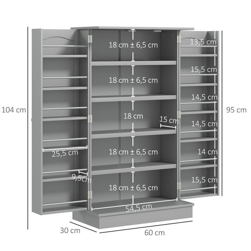 Tem demasiados utensílios na cozinha e pouco espaço para os arrumar? Este armário tipo despensa ajuda a manter tudo organizado sem esforço. Pode guardar pratos, frascos, chávenas ou até aquele robot de cozinha que nunca soube onde colocar. Graças às múltiplas prateleiras e ao desenho compacto com portas, é prático, bonito e adapta-se facilmente a qualquer espaço da casa Características: - Este armário de cozinha tipo despensa oferece amplo espaço com 5 prateleiras interiores e 12 prateleiras adicionais nas portas - Conta com barras de proteção nas prateleiras laterais para evitar a queda de frascos ou recipientes - Tem duas prateleiras interiores ajustáveis para colocar objetos de diferentes tamanhos - A estrutura é de MDF com acabamento pintado, resistente e fácil de limpar - Inclui sistema anti-tombo para maior segurança em casa - As portas possuem fecho magnético e dobradiças em aço inoxidável - Requer montagem Especificaciones: - Cor: Cinzento - Material: MDF, melamina de madeira - Medidas totais: 60x30x104 cm (CxLxA) - Medidas do interior do armário: 54,6x27,2x95 cm (CxLxA) - Medidas de cada prateleira lateral: 25,4x9,4 cm (CxL) - Carga máxima: 65 kg (total), 8,6 kg (cada prateleira), 8,2 kg (tampo superior), 1,8 kg (cada prateleira lateral) - Referência: 83A-037V80GY O pacote inclui: - ● 1 x Armário de cozinha; ● 1 x Manual de instruções;