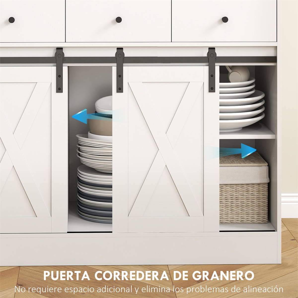 Esta despensa da HOMCOM é a solução perfeita para manter a sua cozinha ou qualquer outro espaço da sua casa organizado e funcional. Com um desenho atraente em branco e detalhes em preto, oferece grande armazenamento com a sua ampla bancada, seis prateleiras abertas, três gavetas e dois armários. Além do seu estilo rústico e acolhedor, a sua estrutura em melamina resistente assegura durabilidade. Esta despensa não é só funcional, mas também uma excelente peça decorativa para qualquer ambiente Características: - Armário multifuncional com espaço suficiente para armazenar utensílios de cozinha, eletrodomésticos e mais - Este armário de cozinha com seis prateleiras abertas e três gavetas oferece soluções adicionais de armazenamento para os seus objetos pequenos e médios - A superfície superior aberta é ideal para colocar eletrodomésticos como micro-ondas, máquinas de café e mais - Desenho de portas tipo celeiro deslizantes que não requerem espaço extra e aportam um estilo único - Este móvel de despensa de cozinha com estrutura sólida de melamina suporta até 75 kg, garantindo estabilidade e durabilidade Especificaciones: - Cor: Branco - Materiais: Melamina de madeira - Medidas totais: 93,5x40x180 cm (CxLxA) - Medidas do compartimento: 45x21,8x20,2 cm (CxLxA), 45x21,8x21,8 cm (CxLxA) - Medidas interiores da gaveta: 24,5x29x6,6 cm (CxLxA) - Medidas interiores do armário: 29,5x35x46,7 cm (CxLxA) - Carga máxima: 75 kg (total), 5 kg (gaveta, prateleira) - Referência: 83A-256V00WT O pacote inclui: - ● 1 x Armário de cozinha; ● 1 x Manual de instruções
