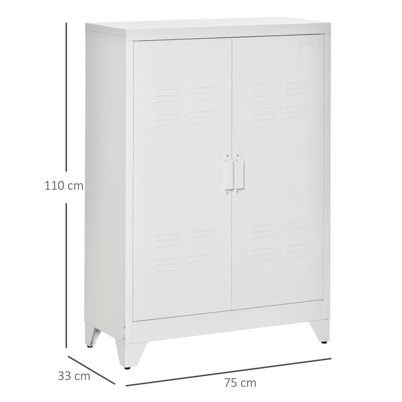 Este armário de metal de HOMCOM de estilo industrial é a perfeita solução para sua falta de espaço! Conta com um amplo espaço de armazenamento com 2 prateleiras interiores ajustáveis em altura ideal para guardar suas ferramentas, toalhas, roupas de cama, livro entre outros. Fabriacado de metal é um móvel resistente e ideal para um uso prolongado. Conta com um dispositivo anti-rolamento que acrescesta uma estabilidade extra a esse móvel. Não perca essa oportunidade! Características: - Armário de metal elegante e moderno com um toque industrial - Conta com uma amplo espaço de armazenamento interior - Prateleira interior com altura ajustável em 17 posições para satisfazer as suas diferentes necessidades de armazenamento - Porta com persiana que além de um toque decorativo ajuda na ventilação - Porta com fechadura magnética para uma fácil abertura e fechamento - Ideal para garagens, armazém, escritório, casa, entre outros - Conta com um dispositivo anti-rolamento para uma maior segurança - Requer montagem Especificaciones: - Cor: Branco - Material: Metal - Medidas totais: 75x33x110cm (CxLxA) - Capacidade de peso: 10kg (prateleira), 50kg (inteiro) - Altura do pés: 7,7 cm - Referência: 838-113WT O pacote inclui: - ● 1 x Armário; ● 1 x Manual de instruções
