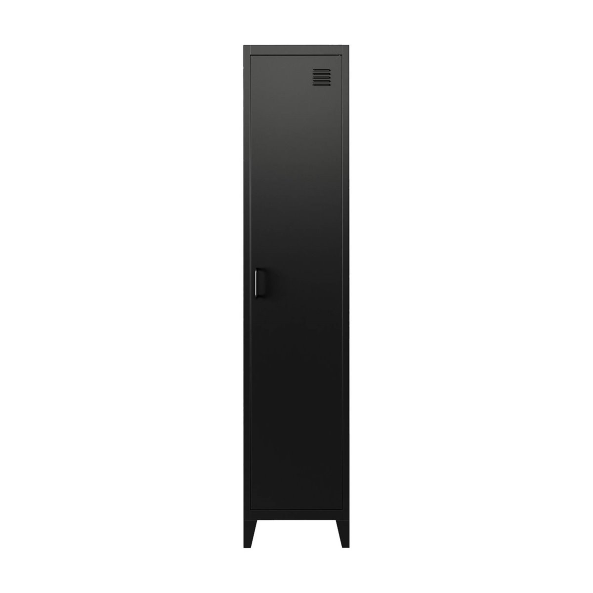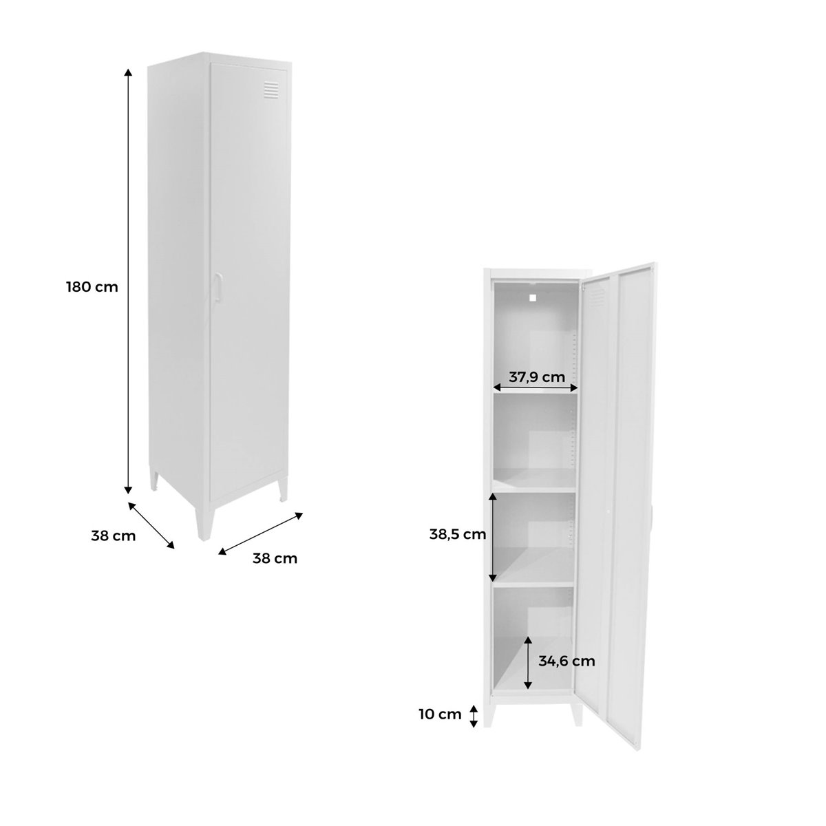 Os + produto Estilo industrial 3 prateleiras 1 porta Pés elevados e ajustáveisDê ao seu interior uma opção de armazenamento funcional e elegante com este armário em aço laminado a frio. O estilo industrial atrairá tanto os jovens quanto os adultos, oferecendo um espaço ideal para organizar roupas, brinquedos e outros itens pessoais através de suas três prateleiras espaçosas. Fabricado em aço, este armário garante uma durabilidade excepcional. Seu design moderno e elegante acrescentará um toque contemporâneo ao quarto do seu filho.Antiderrapante: Sim Espaço de armazenamento: 4 Dimensões: C 38 x P 38 x A 180 cm Dimensões interiores: C 35,5 x P 37,5 x A 161,5 cm Altura dos pés: 10cm Peso: 15kg Dimensões das prateleiras: C 35,3 x P 37,3 cm Dimensões da porta: C 32,5 x A 162,5 cm Espaço entre os pés: 28cm Dimensões da maçaneta: C 10 x P 3 cm Dimensões dos pés: C 5 x P 5 x A 10 cm