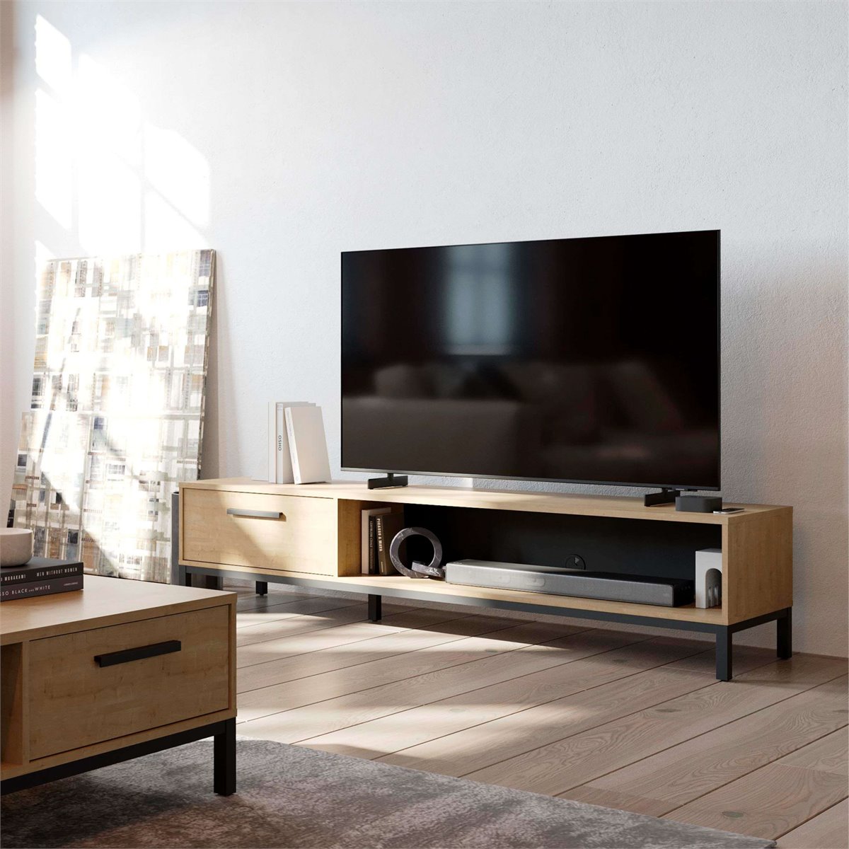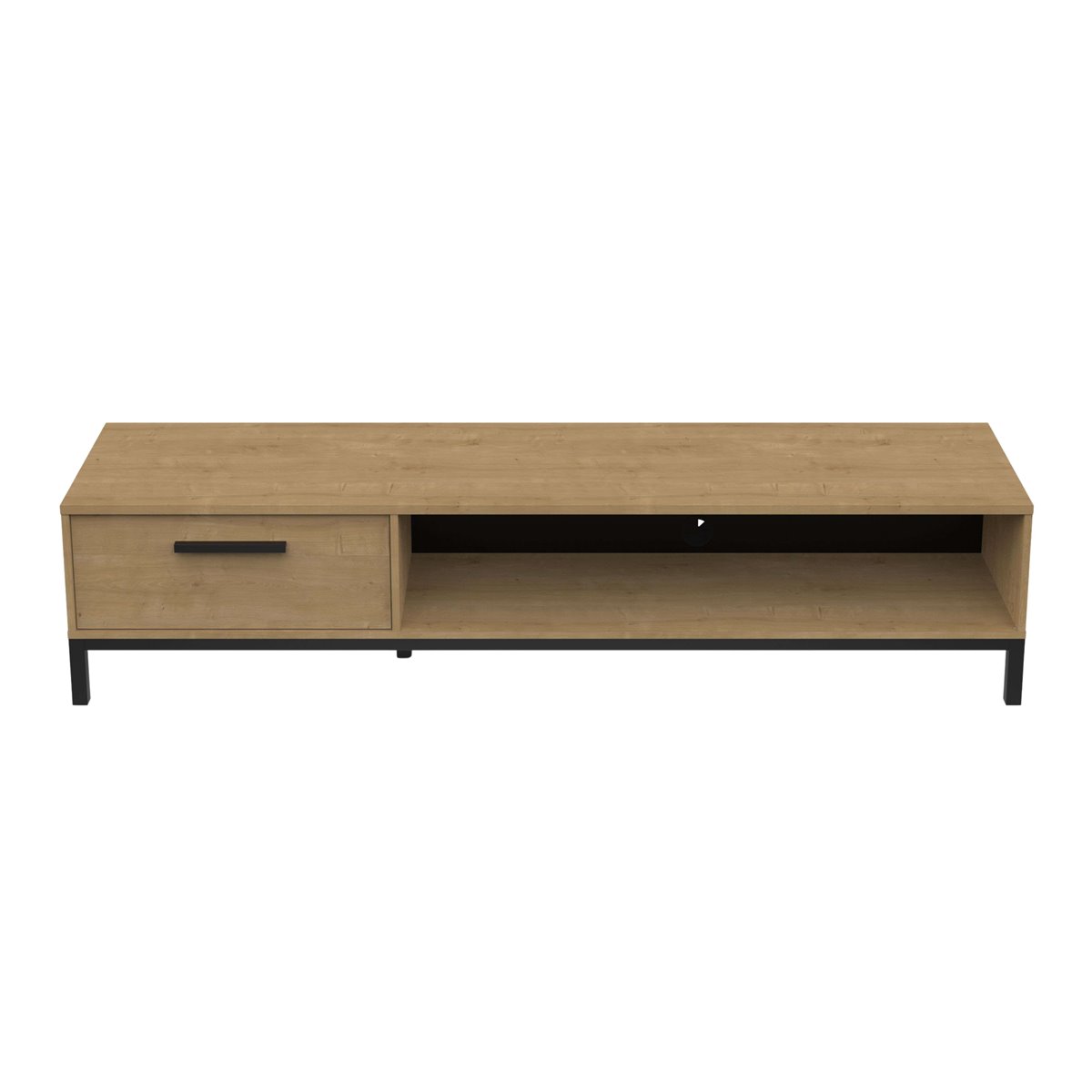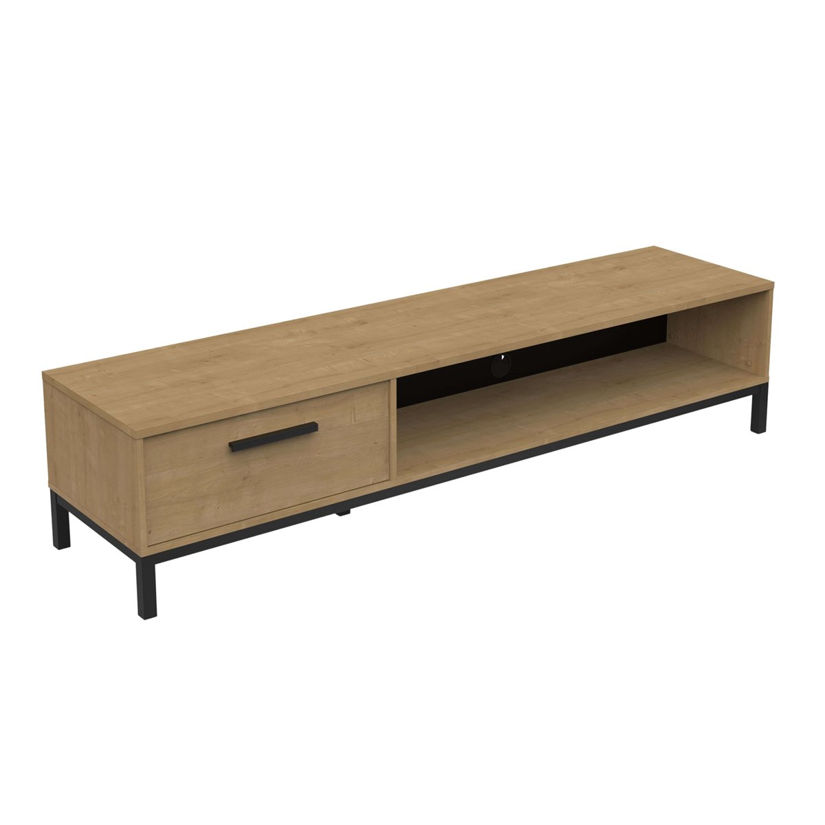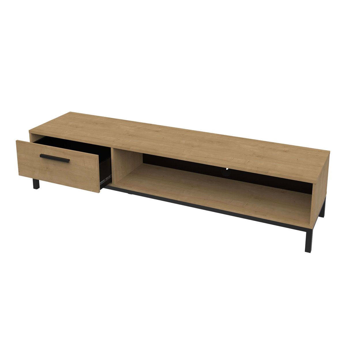 Este móvel para TV, com acabamento em carvalho Hamilton e detalhes em preto, transforma sua sala de estar ou sala de jantar em um espaço moderno e convidativo. Com um design que alia estilo e versatilidade, proporciona um impacto visual que valoriza qualquer decoração. Os pés pretos adicionam um toque robusto e contemporâneo, tornando este móvel uma peça essencial que convida a desfrutar de um ambiente acolhedor e transformador em sua casa. Feito em melamina, este móvel para TV apresenta uma estrutura bem projetada que inclui uma gaveta com guias de esferas para um deslizamento suave e um espaço aberto para equipamentos eletrônicos, facilitando sua organização. Seus pés em pinho maciço laqueado em preto proporcionam estabilidade. Sua fácil montagem e dimensões o tornam versátil para qualquer espaço. Não perca a oportunidade de adquiri-lo e maximizar sua área de entretenimento com praticidade. Medidas: Largura: 183 cm, Altura: 41,3 cm, Profundidade: 44,9 cm. Este móvel acompanha um kit de montagem, que inclui manual de instruções e ferragens.
