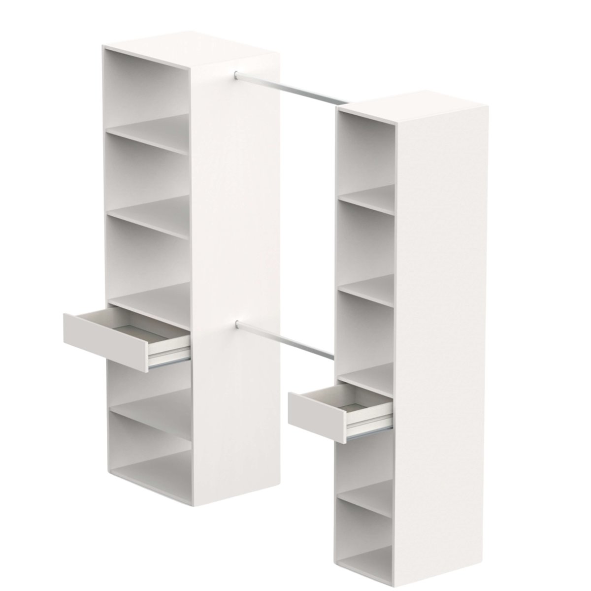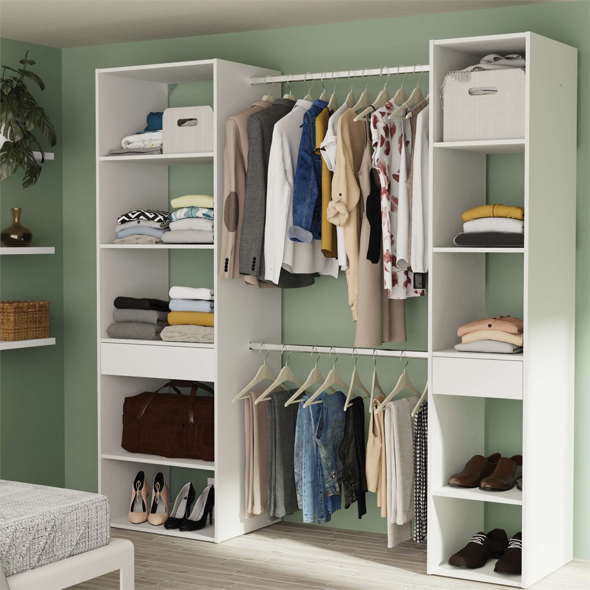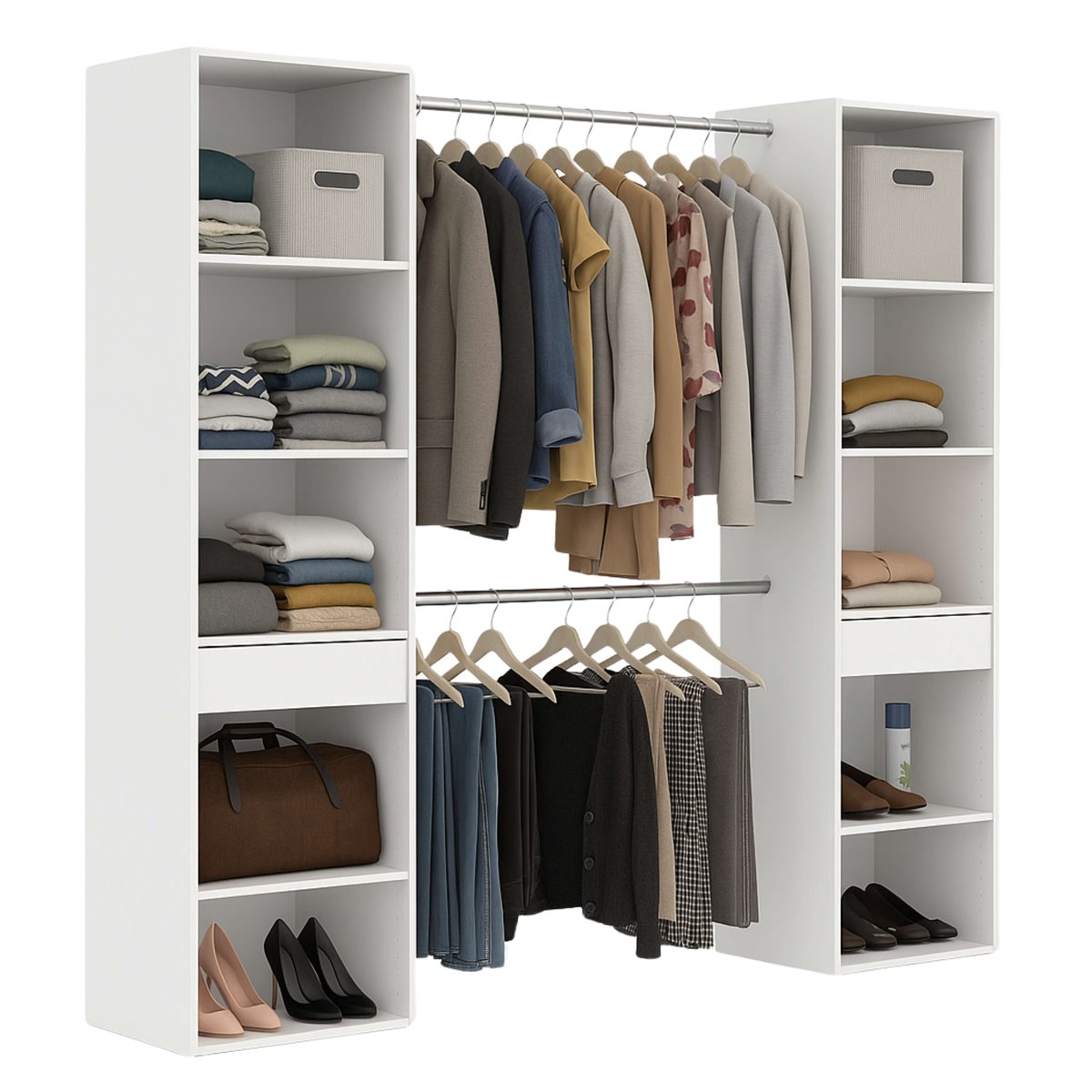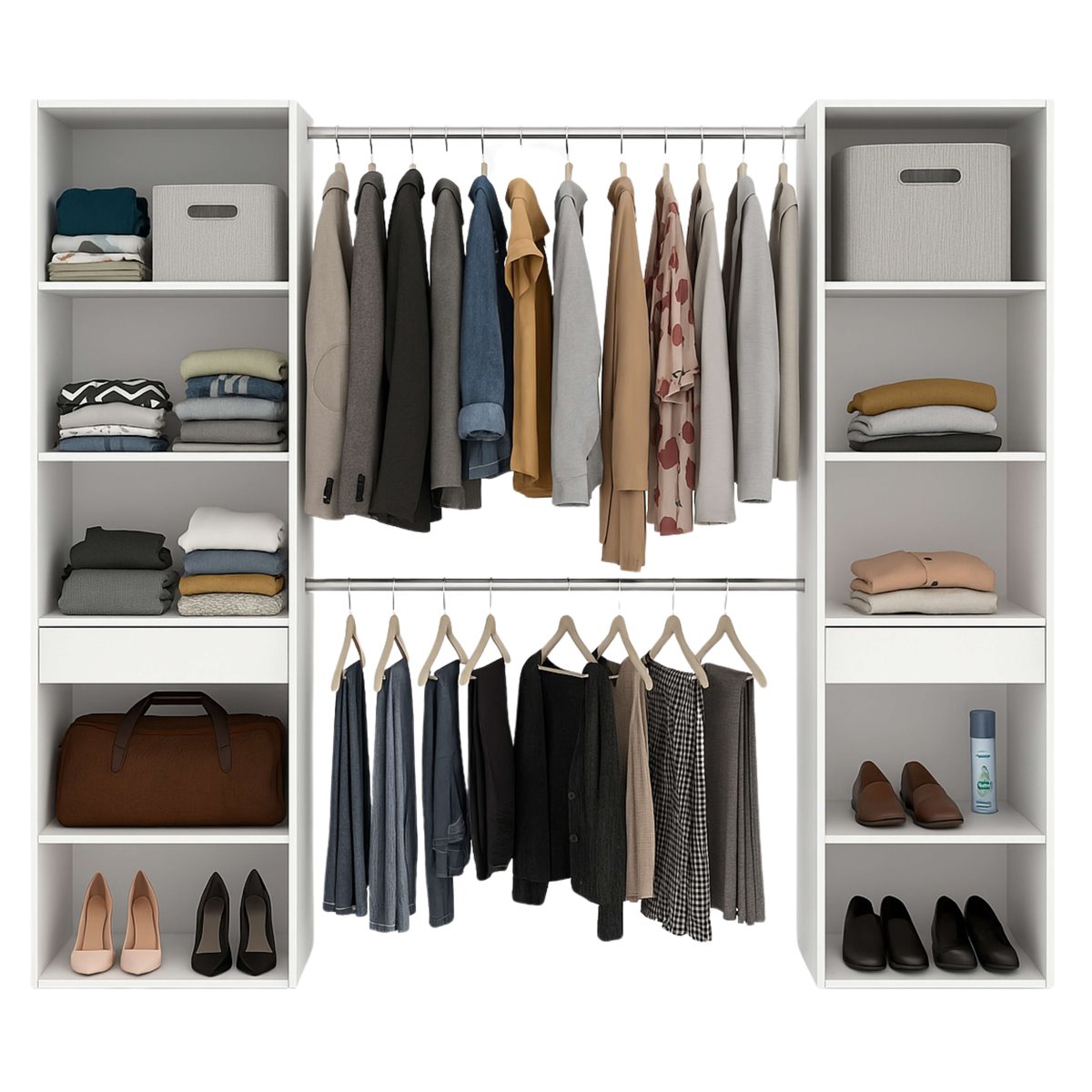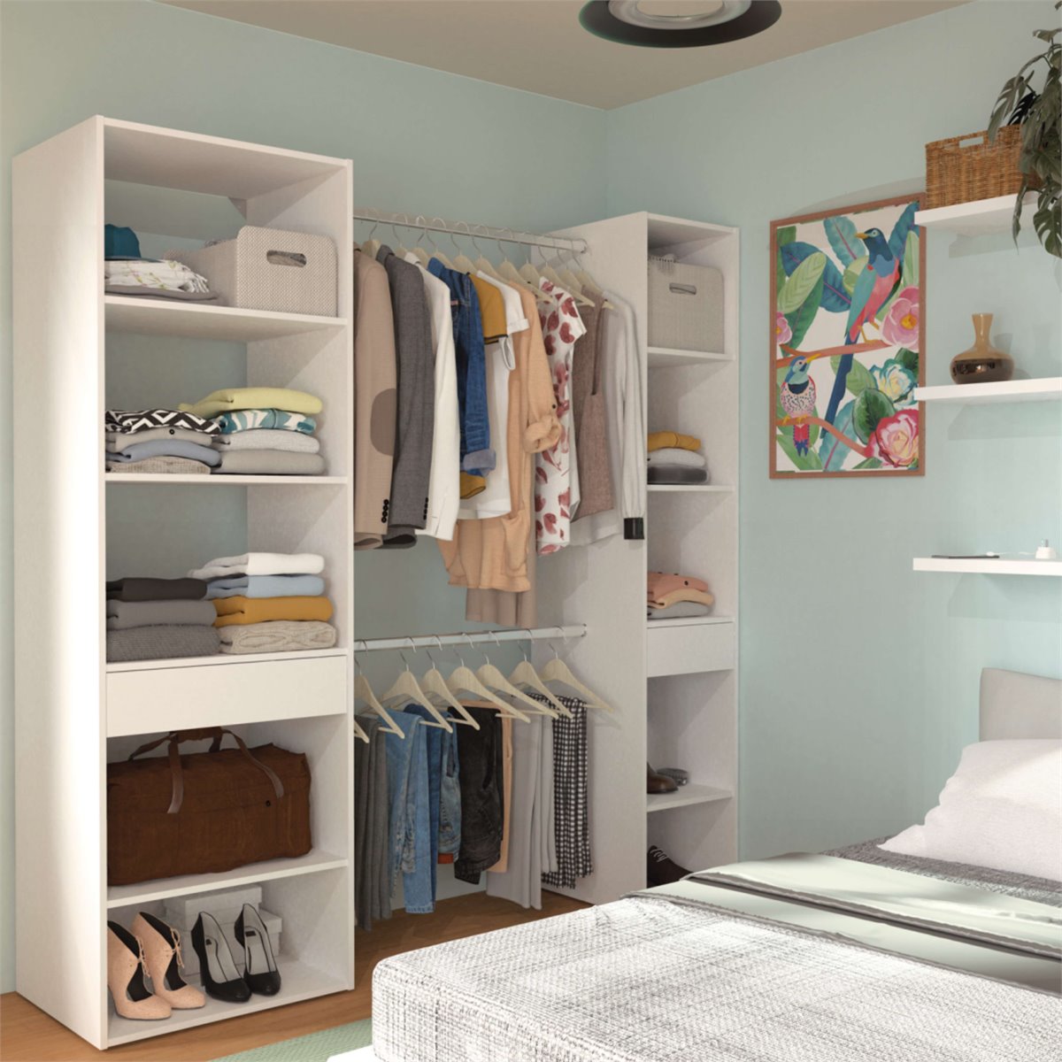 Com este guarda-roupa aberto você pode ordenar e organizar suas roupas de forma prática, Este guarda-roupa inclui 2 barras de alumínio, 6 prateleiras e 2 gavetas onde você pode dobrar roupas ou colocar acessórios, Suas 2 prateleiras inferiores são ajustáveis em altura, que você pode ajustar durante a montagem, Este guarda-roupa branco fosco pode ser combinado com diferentes estilos e ambientes, É hora de ter o camarim que você sempre imaginou, Este guarda-roupa aberto feito de melamina, tem acabamento em branco fosco, Não inclui outros móveis ou elementos decorativos nas imagens, Medidas: Altura 200 cm Largura 200 cm Profundidade 50 cm Barra: Comprimento 96 cm Coluna larga: 64 cm Coluna estreita: Largura 40 cm Este é um móvel com kit de montagem, que inclui manual de instruções e ferragens,