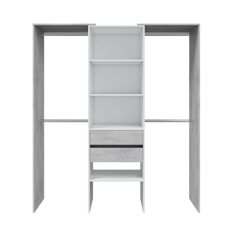 Este roupeiro é composto por 4 varões de alumínio amovíveis, dois de cada lado, e um espaço central com 4 prateleiras, duas delas reguláveis em altura com um peso máximo suportado de 8kg cada e 2 gavetas com um peso máximo suportado de 5kg cada, pode ainda utilizar a parte superior do roupeiro para guardar o que menos usa em caixas decorativas, possui ainda blocos em ABS amovíveis e anti-riscos.