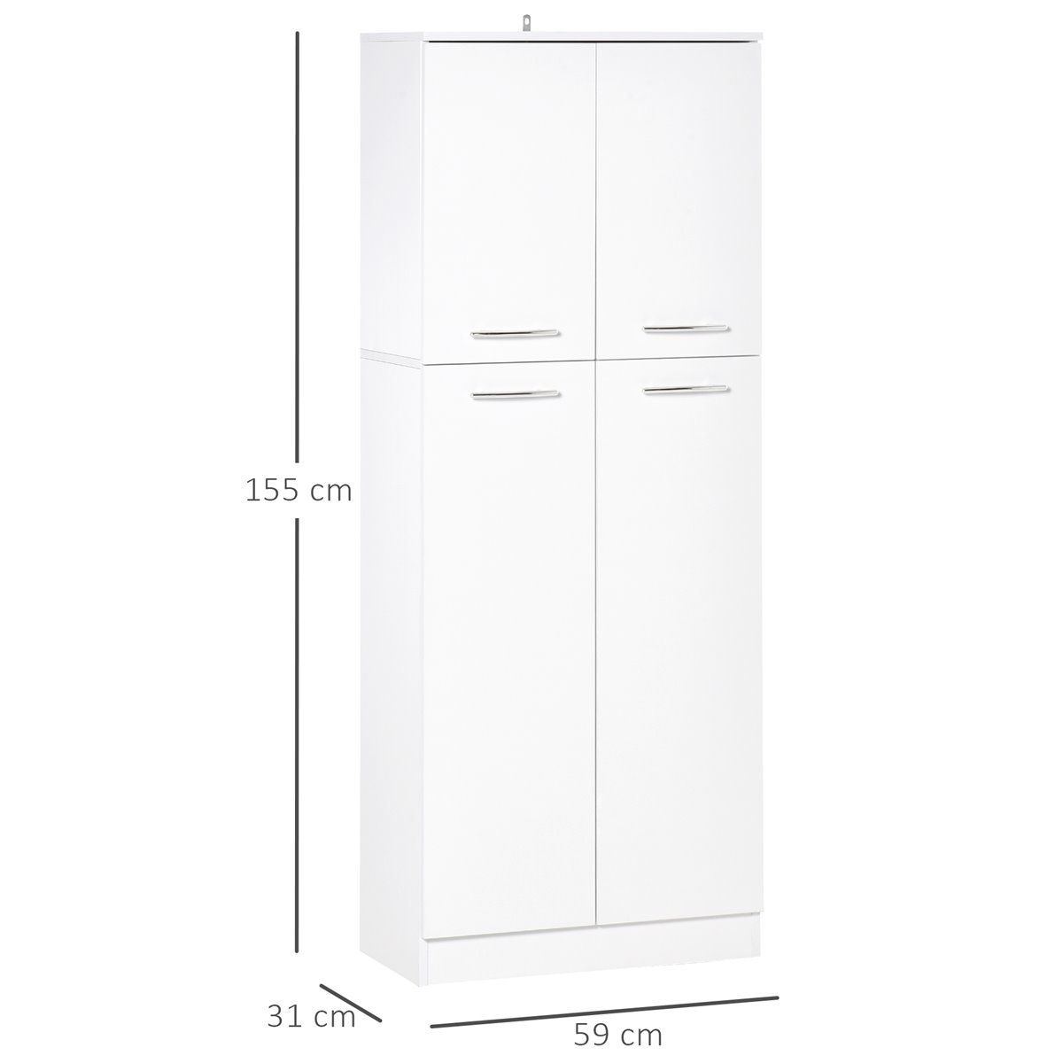 Dê adeus a desorganização em casa, com este armário multiusos de HOMCOM. Pode utilizá-lo como móvel dispensa em sua cozinha ou sala para guardar utensílios e acessórios. Também pode utilizá-lo como um moderno armário em qualquer habitação de casa. Fabricado de melamina de madeira e bonitos puxadores metálicos, é um móvel resistente e seguro graças a seu dispositivo anti-rolamento, ideal para manter sua casa organizada Características: - Desenho simples e minimalista, perfeito para combinar com a maioria de estilos - Este armário conta com 2 amplos compartimentos com portas e prateleiras interiores - As prateleiras interiores possuem altura ajustável para adaptar a suas necessidades de armazenamento - Móvel compacto funcional, útil como dispensa ou armário multiuso - Fabricado de melamina de madeira, fácil de limpar e manter - Requer montagem Especificaciones: - Cor: Branco - Material: Melamina de madeira - Medidas totais: 59x31x155cm (CxLxA) - Medidas do interior do compartimento superior: 56x29x52cm (CxLxA) - Medidas do interior do compartimento inferior: 56x29x93cm (CxLxA) - Distância entre níveis das prateleiras ajustáveis: 6,5cm (compartimento superior) e 6,4 cm (compartimento inferior) - Capacidade máxima de carga: 50 kg (total), 10 kg (cada prateleira) - Referência: 838-097 O pacote inclui: - ● 1x Armário; ● 1x Manual de instruções