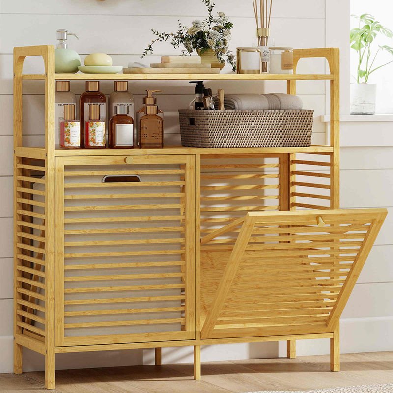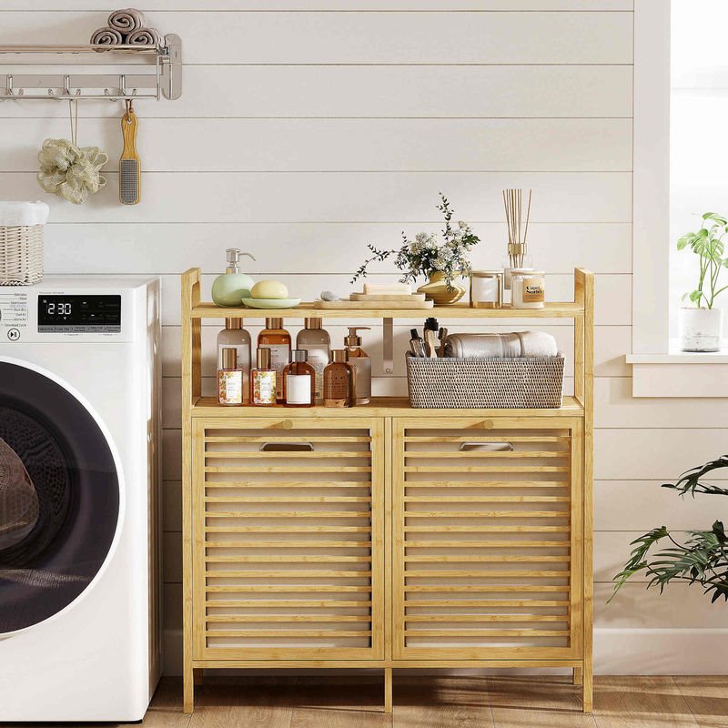 Está farto da desordem na lavandaria? Este móvel auxiliar da HOMCOM mantém tudo arrumado com dois cestos amovíveis de 41L para separar a roupa por cor ou por pessoa. Além dissom inclui duas prateleiras espaçosas para detergentes e toalhas. Fabricado em bambu natural, o seu desenho basculante é elegante e torna a lavandaria mais prática, organizada e bonita Características: - Dois cestos amovíveis de 41L para separar a roupa de forma prática - Duas prateleiras espaçosas para organizar produtos e aproveitar melhor o espaço vertical - Estrutura em bambu natural com acabamento envernizado, que garante resistência e beleza natural - Cintas anti-tombo para maior segurança e estabilidade - Desenho em ripas com cesto de tecido que permite a circulação de ar, ajudando a evitar maus odores - Porta basculante para facilitar o acesso à roupa - Base elevada de 7 cm para evitar contacto direto com o chão, protegendo a roupa da humidade - Requer montagem. Especificaciones: - Cor: Madeira - Material: Bambu e poliéster - Medidas totais: 82x33x88 cm (CxLxA) - Medidas interiores do armário: 38x31x49 cm (CxLxA) - Medidas do cesto de tecido: 33x27x46 cm (CxLxA) - Capacidade de cada cesto de tecido: 41 L - Medidas da prateleira aberta: 81x33 cm (CxL) - Altura da base ao chão: 7 cm - Carga máxima: 26 kg (total), 8 kg (cesto de tecido), 5 kg (prateleira) - Referência: 834-881V00ND O pacote inclui: - ● 1 x Armário roupa suja; ● 1 x Manual de instruções