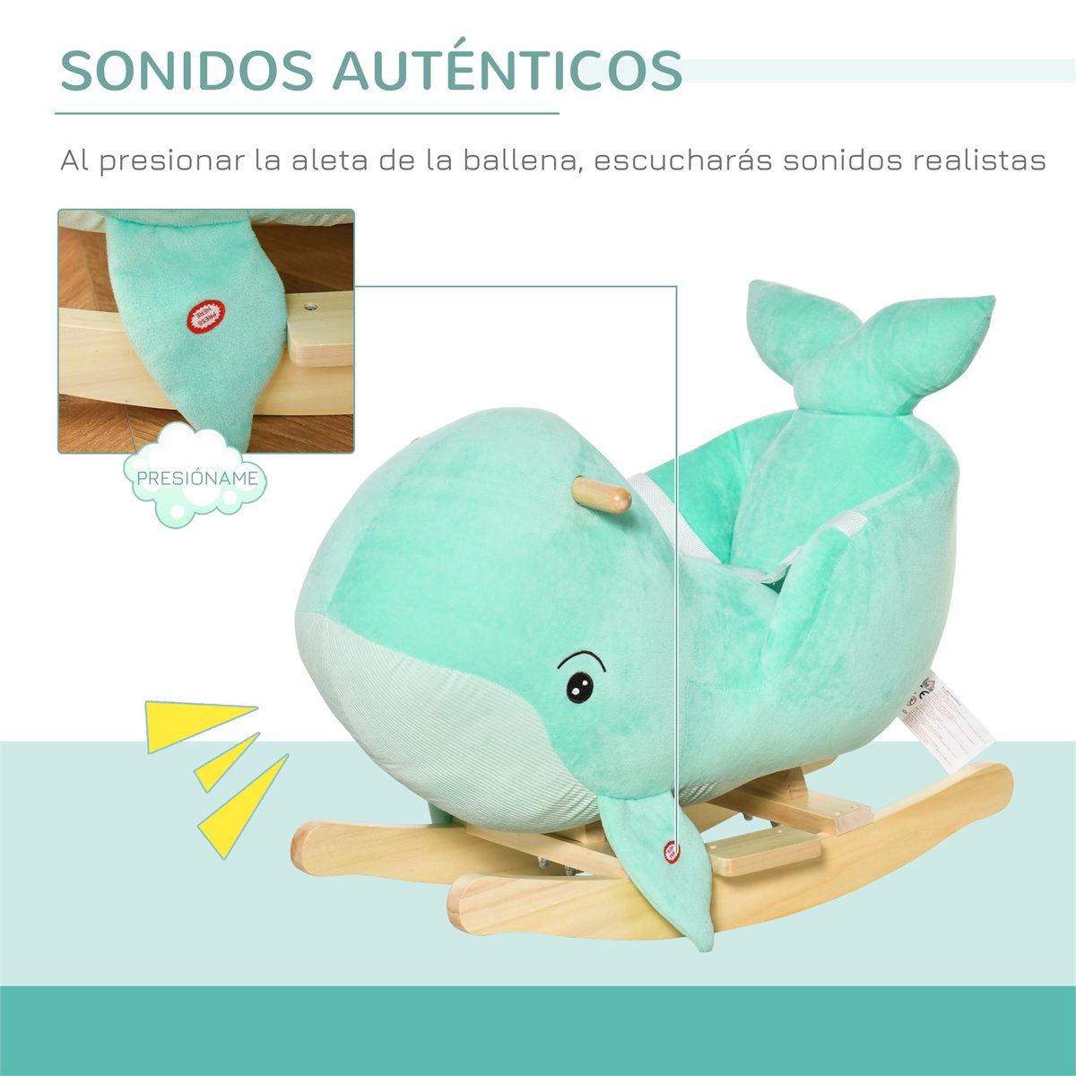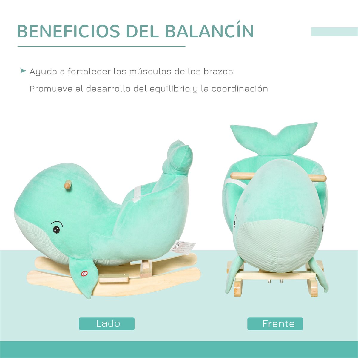 Divertido baloiço infantil de HOMCOM em forma de baleia. Pensado para os mais pequenos de casa, pode ser usado a partir de 18 meses de forma confortável e segura. Conta com um desenho envolvente com encosto e laterais altas, cinto de segurança, apoio para os pés e guidão de fácil aderência. Além disso, conta com uma base de madeira para maior resistência. Ao pulsar uma das barbatanas emitirá sons realistas. Perfeito para decorar habitações infantis Características: - Baloiço com base de madeira de álamo e estrutura de metal - Bonito baloiço com forma de baleia de pelúcia suave, agradável ao tato - Conta com um guidão de fácil aderência, apoio para os pés e cinto de segurança - Ao presionar uma das barbatanas, emite sons realistas - Desenho envolvente com apoio para os braços para que a criança fique mais protegida e segura - Requer 3 pilhas LR44 para o som (incluidas) - Recomendado para crianças a partir de 18-36 meses e com peso inferior a 45kg - Requer montagem Especificaciones: - Cor: Turquesa - Material: Pelúcia, madeira de álamo, metal e algodão PP - Medidas totais: 60x33x50cm (CxLxA) - Medidas do assento: 25x23cm (CxL) - Altura do assento ao chão: 26cm - Idade recomendada: 18-36 meses - Carga máxima: 45kg - Certificações: EN71-1-2-3 e EN62115 - Referência: 330-138GN O pacote inclui: - ● 1x Baloiço; ● 3x Pilhas LR44; ● 1x Manual de instruções