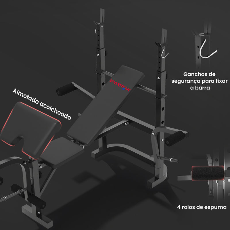 Gostas de treinar força em casa? Este banco multifunções SPORTNOW é perfeito. Permite press de banca, curls, extensões de pernas, poleia alta, mariposa e mais. Ajusta o encosto e troca acessórios conforme o exercício. Uma máquina completa para melhorar o teu desempenho físico Características: - Permite instalar curl de predicador ou barra de tração conforme o exercício - Banco ajustável com suporte para barra para várias rotinas - Estação com três postes para discos com peso regulável - Ganchos de segurança para fixar a barra com estabilidade - Acolchoamento grosso e rolos de espuma para conforto em exercícios - Estrutura em aço para uso seguro e duradouro - Ideal para treinos completos em casa - Requer montagem. Especificaciones: - Cor: Preto - Material: Aço e PU - Medidas totais: 106x155x202 cm (CxLxA)● Medidas do encosto: 73x23 cm (CxA) - Medidas do assento: 50x29x23 cm (CxLxA) - Altura do suporte para barra: 112-160 cm - Barra de tração (poleia alta): 93 cm (comprimento) e 183 cm (altura) - Carga máxima: 100 kg (utilizador), 100 kg (suporte para barra), 25 kg (cada poste) - Referência: A91-373V00BK O pacote inclui: - ● 1 x Banco multifunções com suporte; ● 1 x Almofada para curl de predicador; ● 1 x Barra para poleia alta; ● 1 x Manual de instruções.