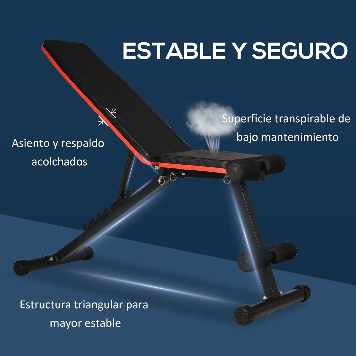 - BANCO MULTIFUNCIONAL: Este banco de pesos 2 em 1 pode ser utilizado como banco de abdominais ou como banco de pesos. É o complemento perfeito para treinar em casa, fazer exercício, tonificar o corpo e trabalhar os músculos e as diferentes áreas do corpo - FORTE E CONFORTÁVEL: Feito de aço revestido a pó resistente a riscos. O assento e o encosto são almofadados com espuma de alta densidade para maior conforto e segurança durante os treinos - Encosto regulável em 7 posições: O encosto tem 7 posições diferentes (90°, 75°, 60°, 45°, 30°, 0°, -10°) para satisfazer as suas diferentes necessidades de treino. Ideal para exercícios como agachamentos, abdominais e exercícios para a parte superior do corpo - COMPACTO E FÁCIL DE LIMPAR: Este banco de halteres tem uma superfície em PU que se limpa facilmente com um pano húmido, pelo que pode limpá-lo depois de cada treino para se certificar de que elimina os vestígios de suor. O seu design compacto facilita a arrumação e permite-lhe colocá-lo em quase todos os espaços - MEDIDAS TOTAIS: 116x43x56-116 cm (CxLxA). Medidas de dobragem: 80x43x12 cm (CxLxA). Medidas do assento: 29x29 cm (CxLxA). Medidas do encosto: 72x29 cm (CxLxA). Peso máximo suportado: 100 kg