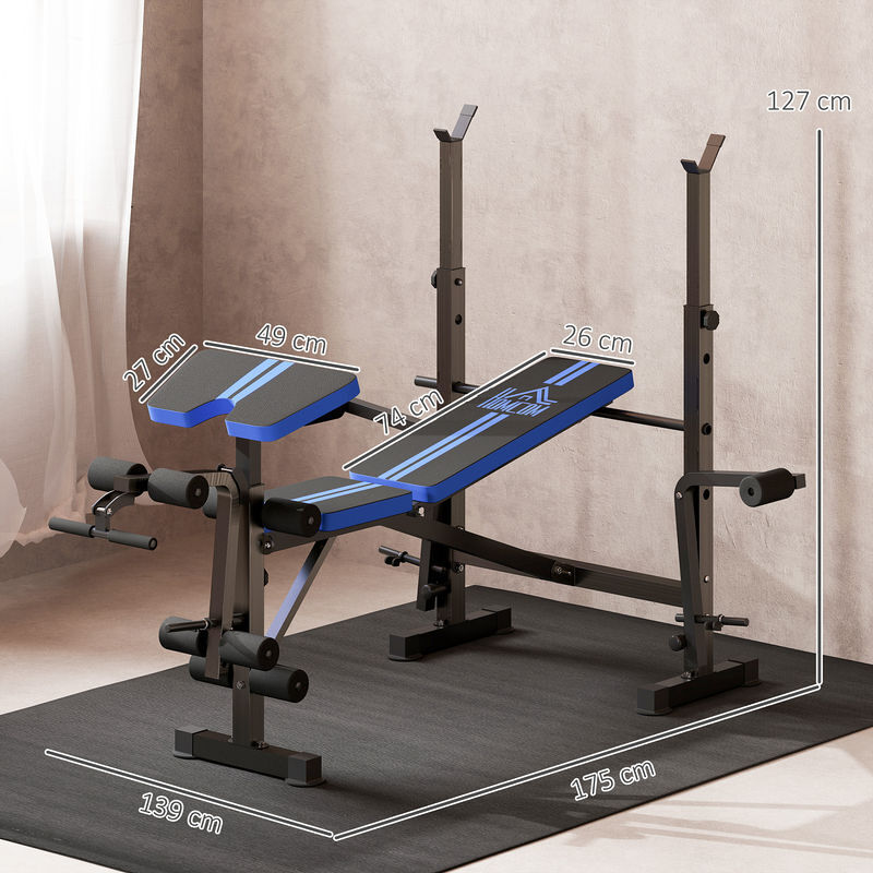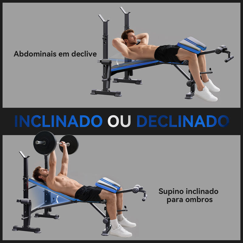 Procura um banco de musculação para treinar em casa ou no escritório? Não deixe de conferir este banco da HOMCOM, pois certamente atende às suas expectativas. Ideal para trabalhar diferentes grupos musculares e tonificar o corpo, este banco possui encosto reclinável, apoio para barra, curl de pernas e braços articulados. É um banco de musculação compacto, prático e permite realizar uma grande variedade de exercícios, trabalhando os músculos dos braços, pernas, bíceps, entre outros. Características: - Ajuda a fortalecer os músculos do tronco, braços, pernas, bíceps, tríceps e muito mais - Estrutura de aço resistente, oferece uma estação de musculação estável e durável - Banco de pesos com assento e encosto almofadados para maior conforto - Revestimento fácil de manter e limpar - Encosto ajustável em 3 posições para atender a diferentes necessidades de treino - Equipado com um curl de pernas para trabalhar os músculos das pernas e glúteos - Rolos revestidos de espuma para evitar danos às pernas e tornozelos - Este banco de musculação requer montagem - Nota: Pesos não incluídos Especificaciones: - Cor: preto e azul - Material: aço, plástico - Medidas totais: 175x139x127 cm (CxLxA) - Medidas do assento: 30x26 cm (CxL) - Medidas do encosto: 74x26 cm (CxL) - Medidas da almofada: 49x27 cm (CxL) (para o cotovelo) - Medidas da barra de pesos: Ø2,5x25 cm (DxA) - Peso máximo suportado: 25 kg (do suporte para pesos) - Diâmetro do suporte: 25 mm (para colocar discos) - Peso máximo suportado: 100 kg (suporte para a barra de pesos), 100 kg (utilizador), 200 kg (assento) - Referência: A91-054V00BU O pacote inclui: - ● 1 x Banco de pesos; ● 1 x Manual de instruções
