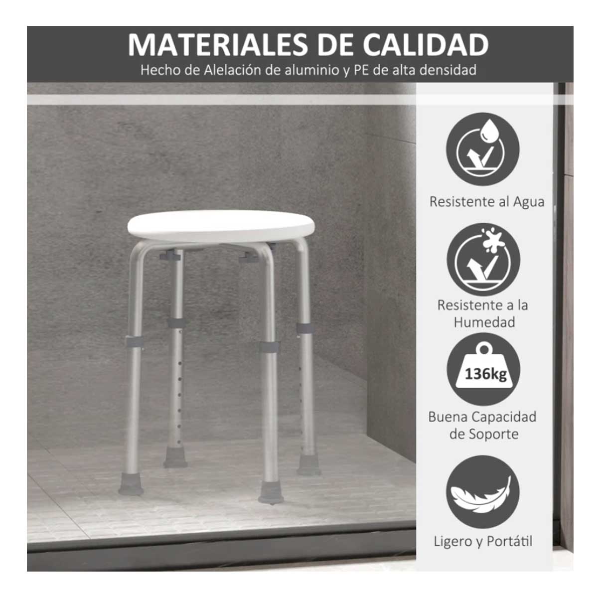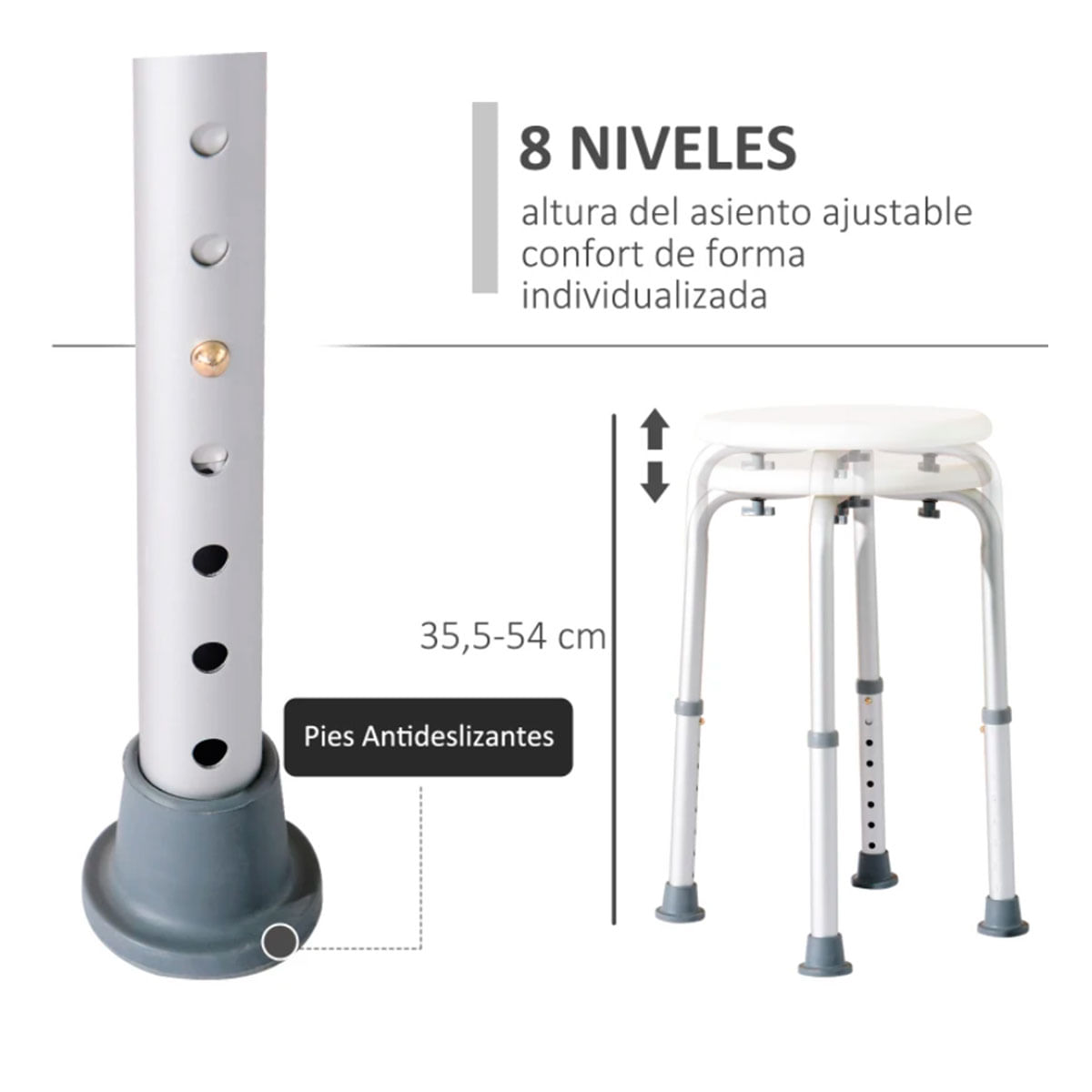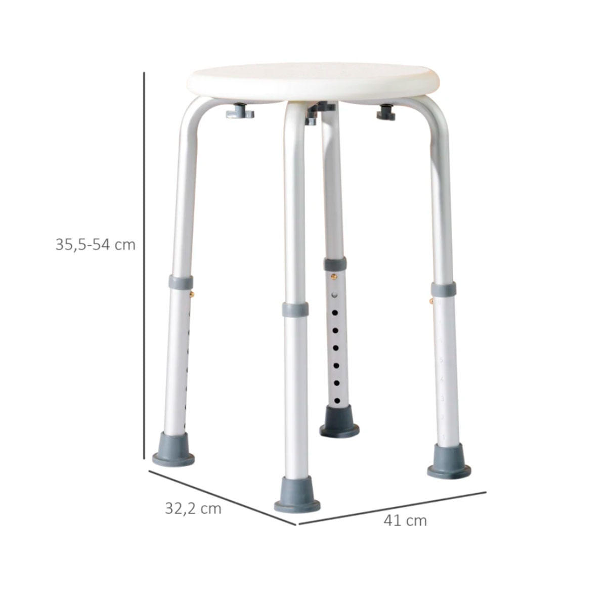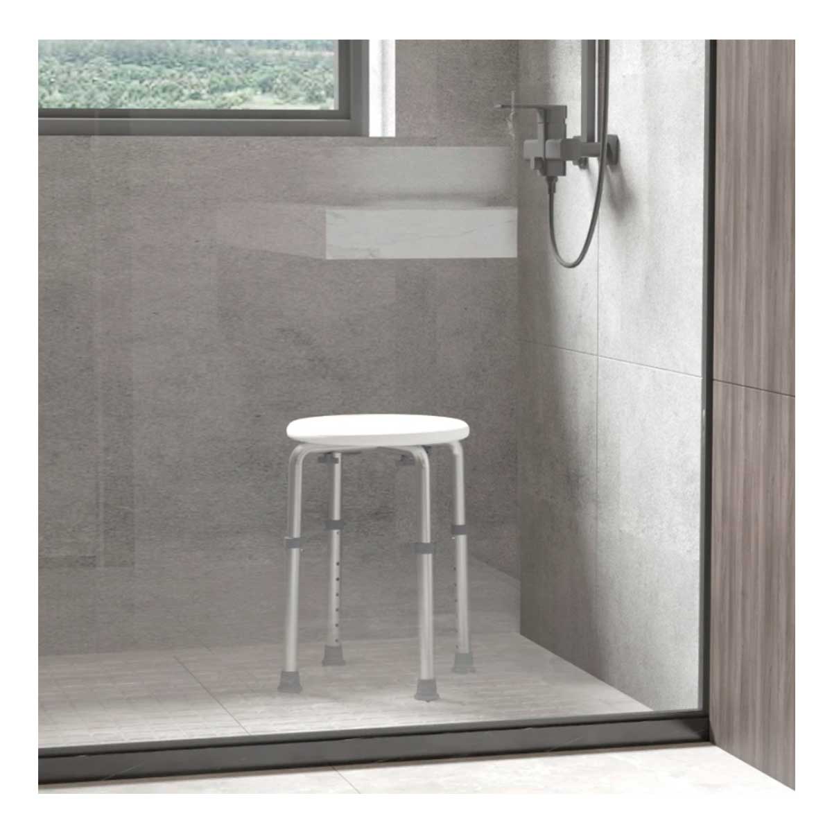 Concebido para auxiliar no duche ou na banheira, este banco de duche da HOMCOM é perfeito para idosos ou pessoas com problemas de mobilidade. Fabricada de alumínio, as quatro pernas são impermeáveis, mantendo a cadeira estável e suportando até 136 kg de peso. Ajustável em altura, para encontrar a posição mais confortável para se sentar. Acabamento com amortecedores de borracha em cada pé para evitar qualquer deslizamento e oferecer uma aderência segura em praticamente qualquer superfície Características: - O banco de duche possui um assento em HDPE higiénico, fácil de limpar e resistente à humidade - Conta com um assento antideslizante para maior segurança durante a utilização - A altura é ajustável de 35,5 a 54 cm graças a 8 posições reguláveis - Inclui apoios de borracha nos pés para evitar movimentos ou escorregamentos - A estrutura de alumínio é leve, estável e muito resistente - O banco de banho antideslizante é compacto e fácil de transportar para qualquer casa de banho - Montagem simples e rápida, sem necessidade de ferramentas Especificaciones: - Cor: Branco e prata - Material: Alumínio e PEAD - Carga máxima: 136 kg - Medidas totais: 32,2x41x35,5-54 cm (CxLxA) - Medidas do assento: Ø32,5x 2 cm (DxA) - Tubo de alumínio: Ø25,4x1,3 mm - Referência:72-0011 O pacote inclui: - ● 1x Banco para duche; ● 1x Manual de instruções