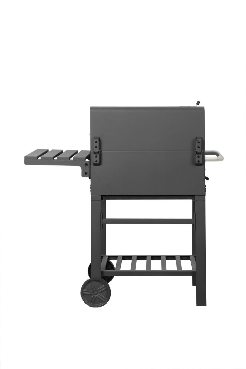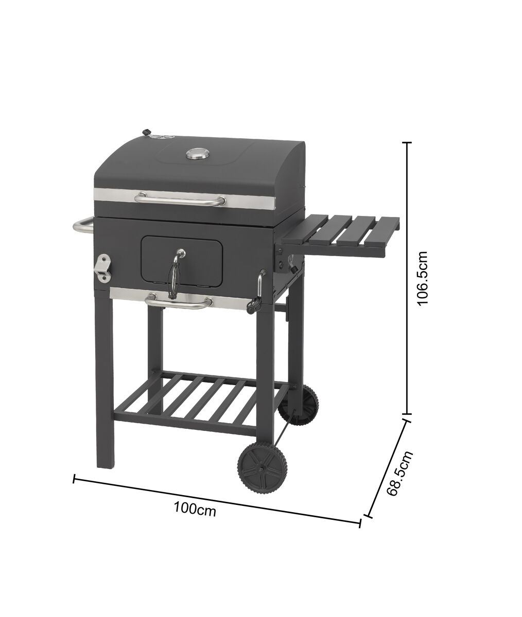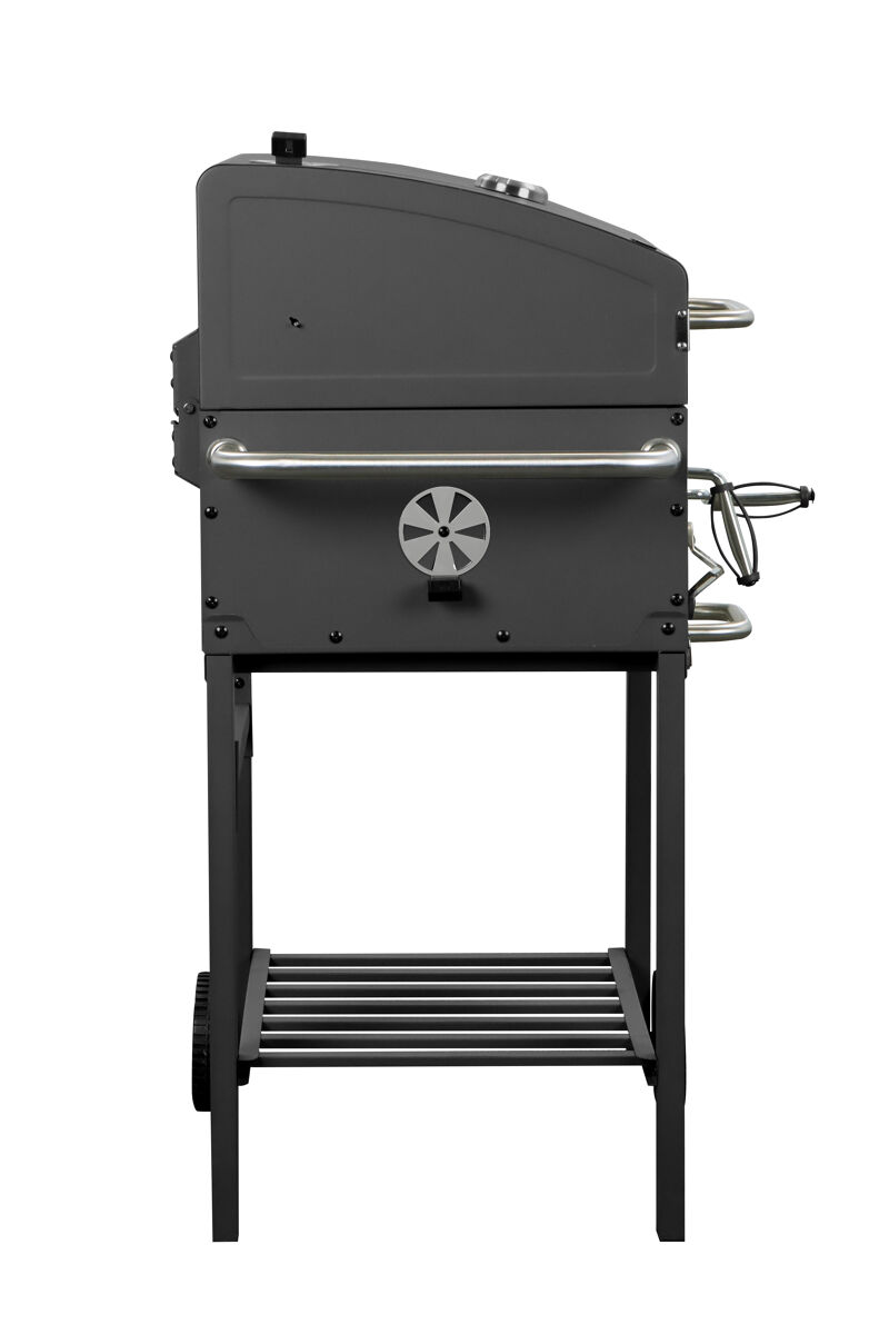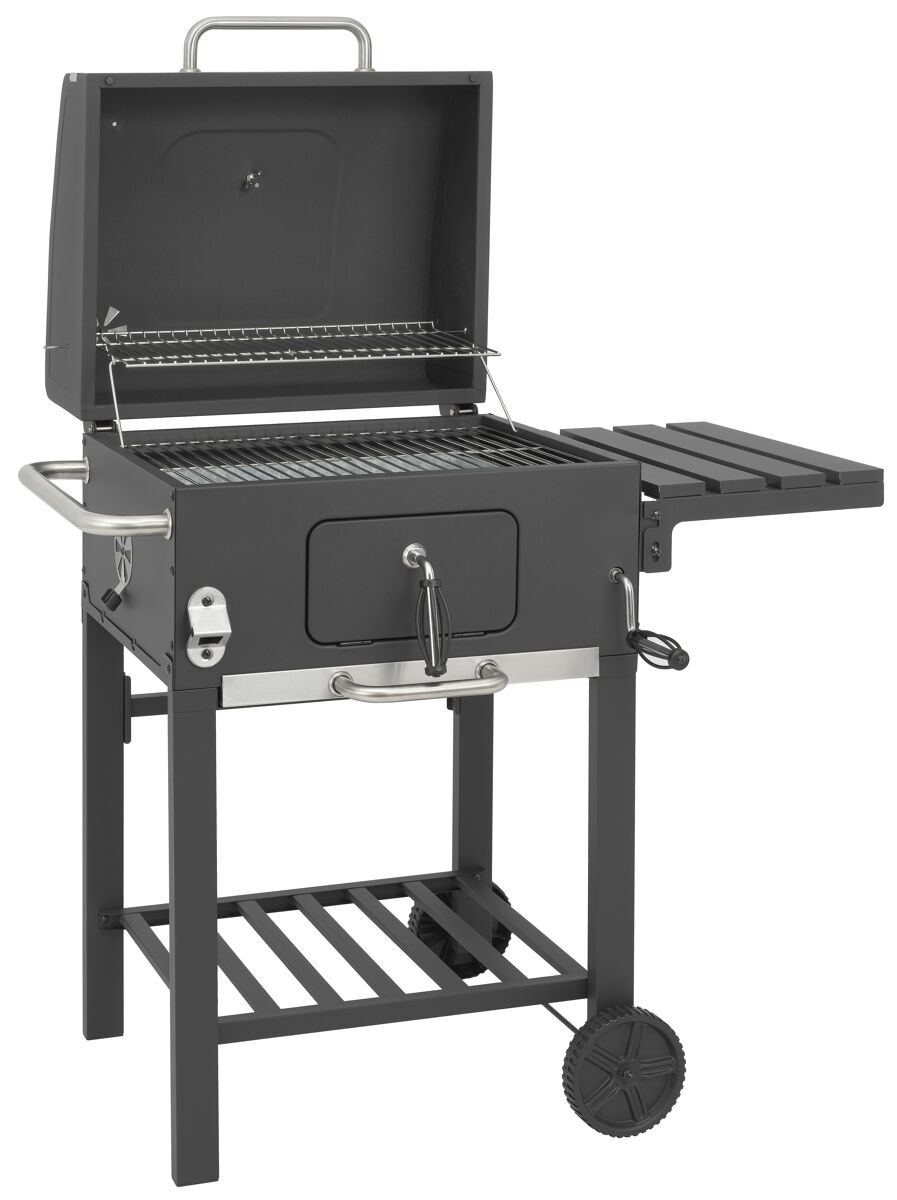 Desfrute de autênticos churrascos com o barbecue de jardim KOA, elegante, em aço inoxidável, cor preto. A sua estrutura em aço maciço com tampa mede 100x106,5x70 cm, oferecendo espaço e durabilidade. Equipado com grelha de altura regulável, termómetro integrado e compartimento de cinzas para uma utilização prática e segura. Inclui um abre-cápsulas e uma prateleira lateral dobrável para maior funcionalidade. É ideal para partilhar momentos ao ar-livre com a família e os amigos.