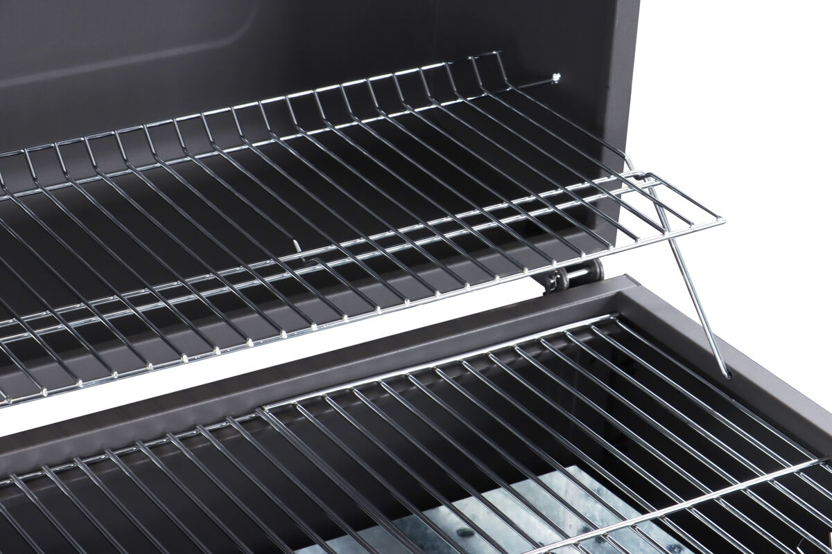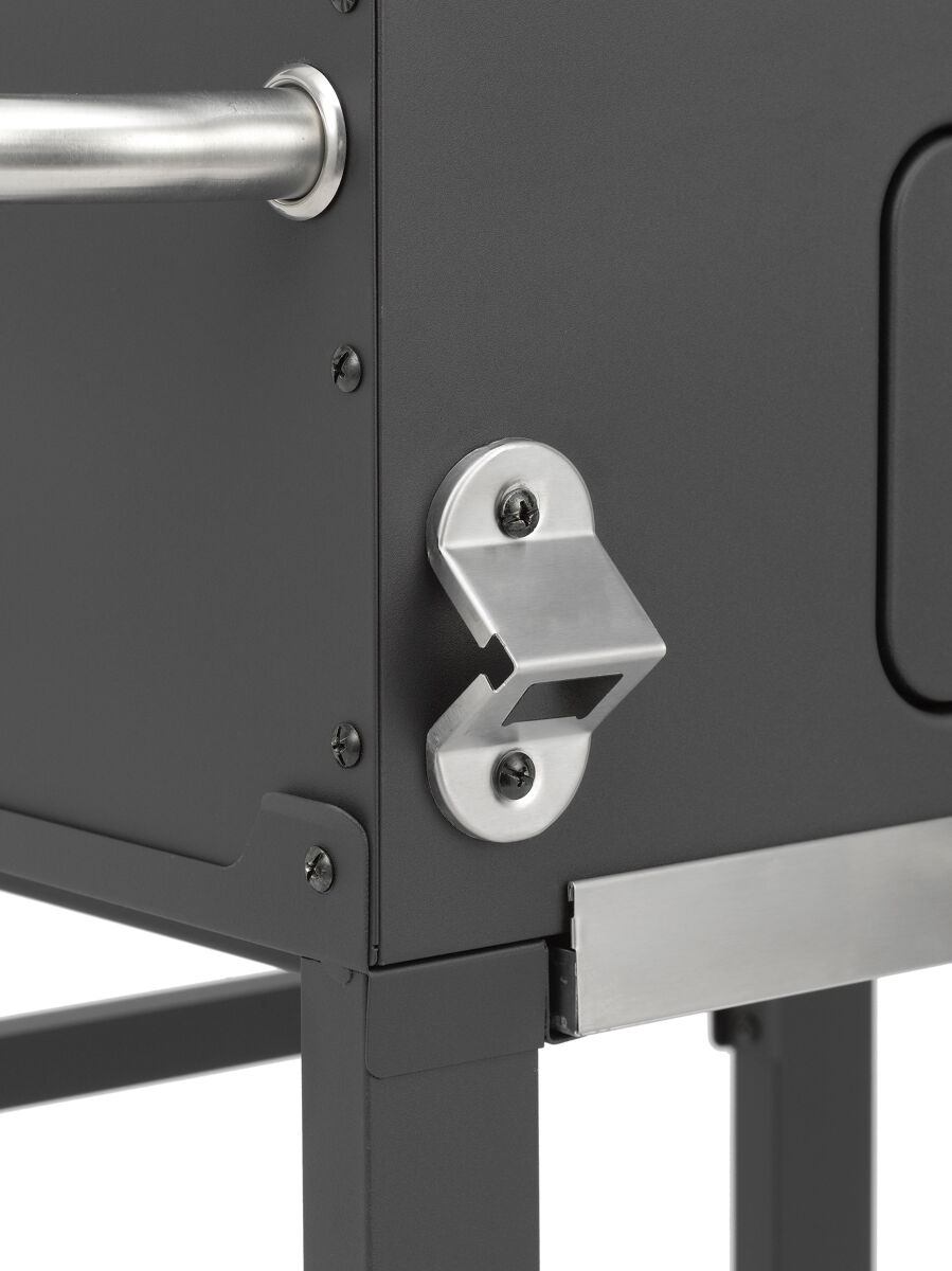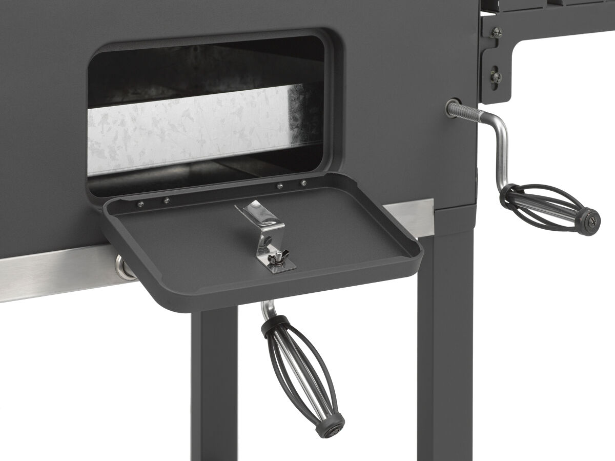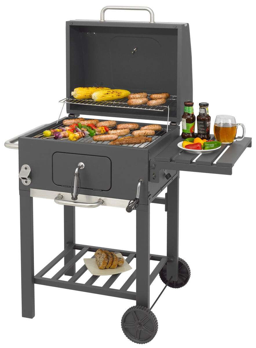 Desfrute de autênticos churrascos com o barbecue de jardim KOA, elegante, em aço inoxidável, cor preto. A sua estrutura em aço maciço com tampa mede 100x106,5x70 cm, oferecendo espaço e durabilidade. Equipado com grelha de altura regulável, termómetro integrado e compartimento de cinzas para uma utilização prática e segura. Inclui um abre-cápsulas e uma prateleira lateral dobrável para maior funcionalidade. É ideal para partilhar momentos ao ar-livre com a família e os amigos.