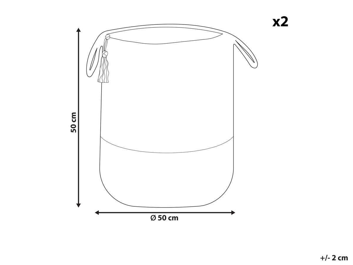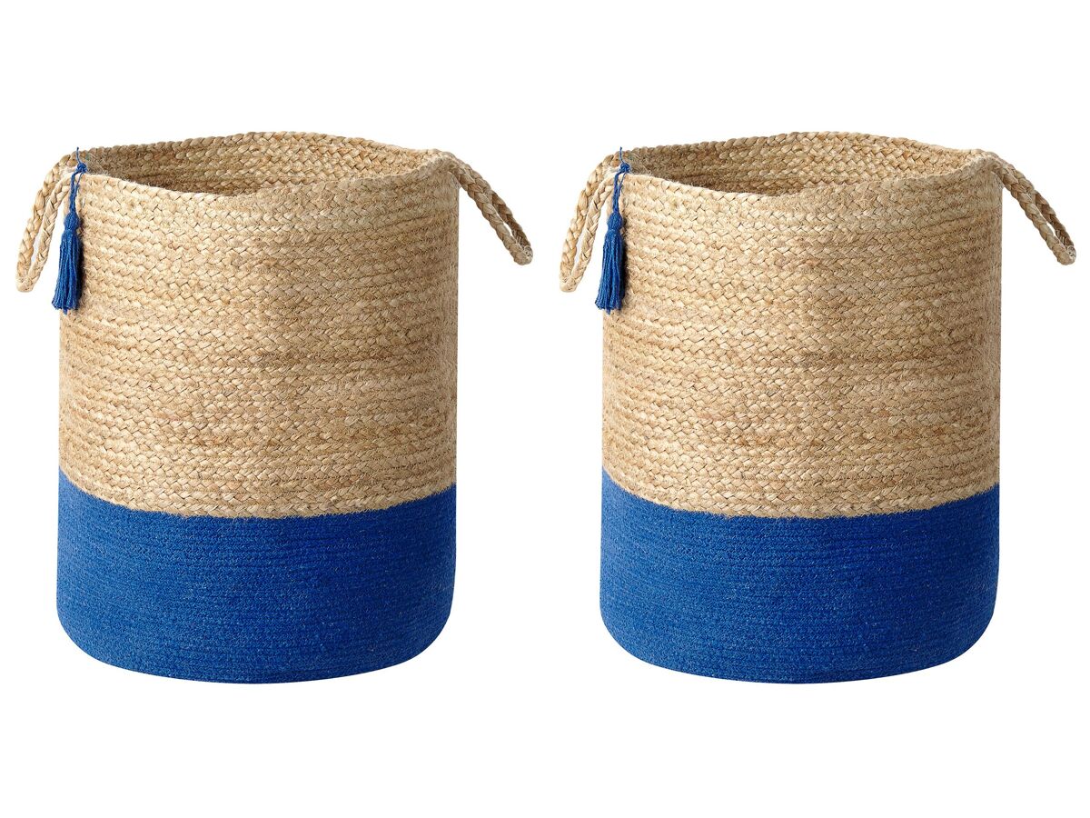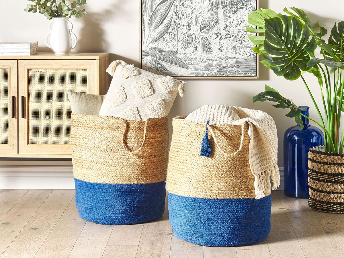Cestos de arrumação. Este conjunto de dois cestos de arrumação é a solução ideal para organizar qualquer espaço. Quando posicionados na sala de estar ou no quarto os cestos podem ser utilizados para arrumar almofadas e cobertores e, no quarto das crianças, ajudarão a organizar os brinquedos. Também podem ser utilizados como cestos para roupa suja. O seu design agradável, uma combinação de algodão e juta, e um toque adicional sob a forma de uma franja decorativa presa às pegas, numa cor correspondente à da base, fazem com que estes acessórios embelezem qualquer interior.
