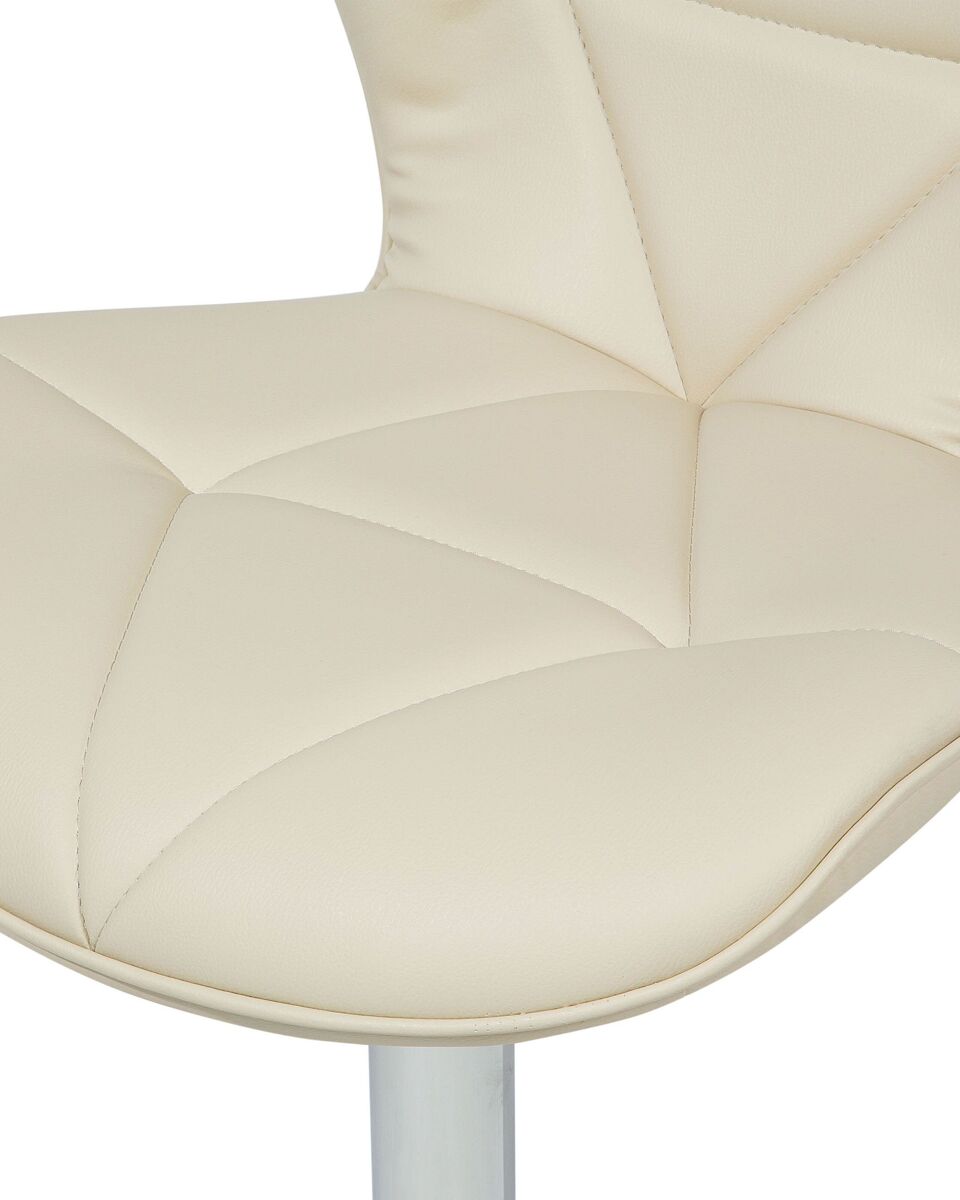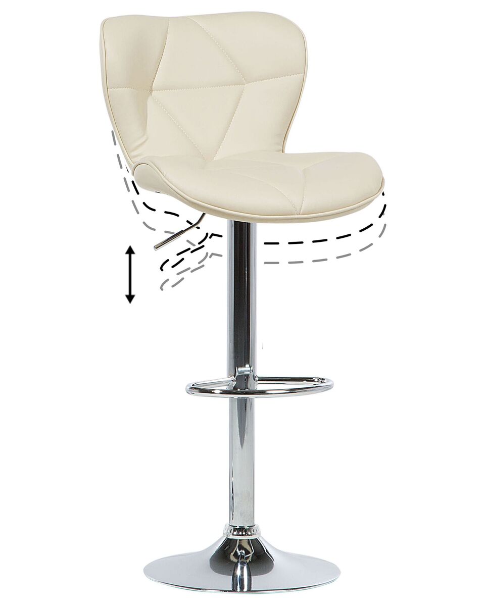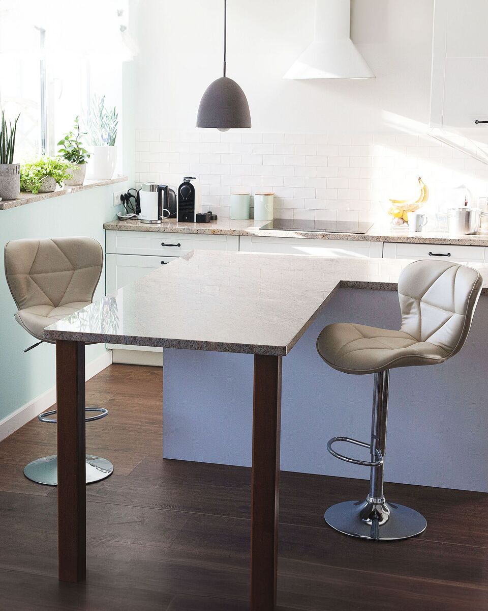 Conjunto de 2 bancos de bar giratórios. Embeleze a sua sala de jantar com este conjunto exclusivo de bancos de bar. O design moderno universal de cada peça torna-a adequada para uma variedade de estilos de decoração e combinações de cores. Graças a uma espessa camada de espuma acolchoada, um assento e costas bem perfilados, os bancos oferecem os mais altos níveis de conforto. As peças possuem um mecanismo giratório que, juntamente com a função de regulação de altura, permite uma acomodação ótima em várias configurações. Detalhes: Tipo de Produto: Tamborete rotativo Estilo: Moderno Cor: Creme Cor da estrutura: Prateado Tom: Creme claro Tipo de Material: Metal Material Principal: Pele sintética Material Adicional: Metal Material dos Pés: Metal Material do Assento: Pele sintética Composição Material: 100% poliéster Apoiador de Braço: Não Empilhável: Não Dimensões: Profundidade: 39 cm Altura do Assento: 59/80 cm Largura: 48 cm Altura: 109 cm Superfície do Assento: 48x38 cm Peso: 8 kg Peso Máximo Suportado: 130 kg A oferta inclui: 2 x Banco de bar Características Principais: Rotação a 360°, Estofos cosidos diagonalmente, Qualidade superior, Ideal para casa ou escritório, Ajuste de altura Informação de Montagem: Apenas os pés. 20-40 min. Informações Adicionais: Para garantir a estabilidade da construção e segurança de uso, recomenda-se verificar se o produto foi montado corretamente 2 semanas após a instalação. Também é recomendado verificar se os parafusos estão devidamente apertados uma vez a cada 3 meses. Dicas de Manutenção: Pele sintética: 1.Uma vez por semana, limpe com um pano húmido e seque após a limpeza. Não lubrifique 2.Use apenas produtos de limpeza e condicionadores suaves dedicados para a pele sintética 3.Limpe com água destilada e use produtos de limpeza à base de sabão em manchas difíceis 4.Por favor, aspire com um acessório adequado. Metal: 1.Para elementos cromados ou cobre, use agente de polimento 2.Para evitar arranhões, não use produtos de limpeza abrasivos 3.Limpe com um detergente suave num pano macio, seque depois.