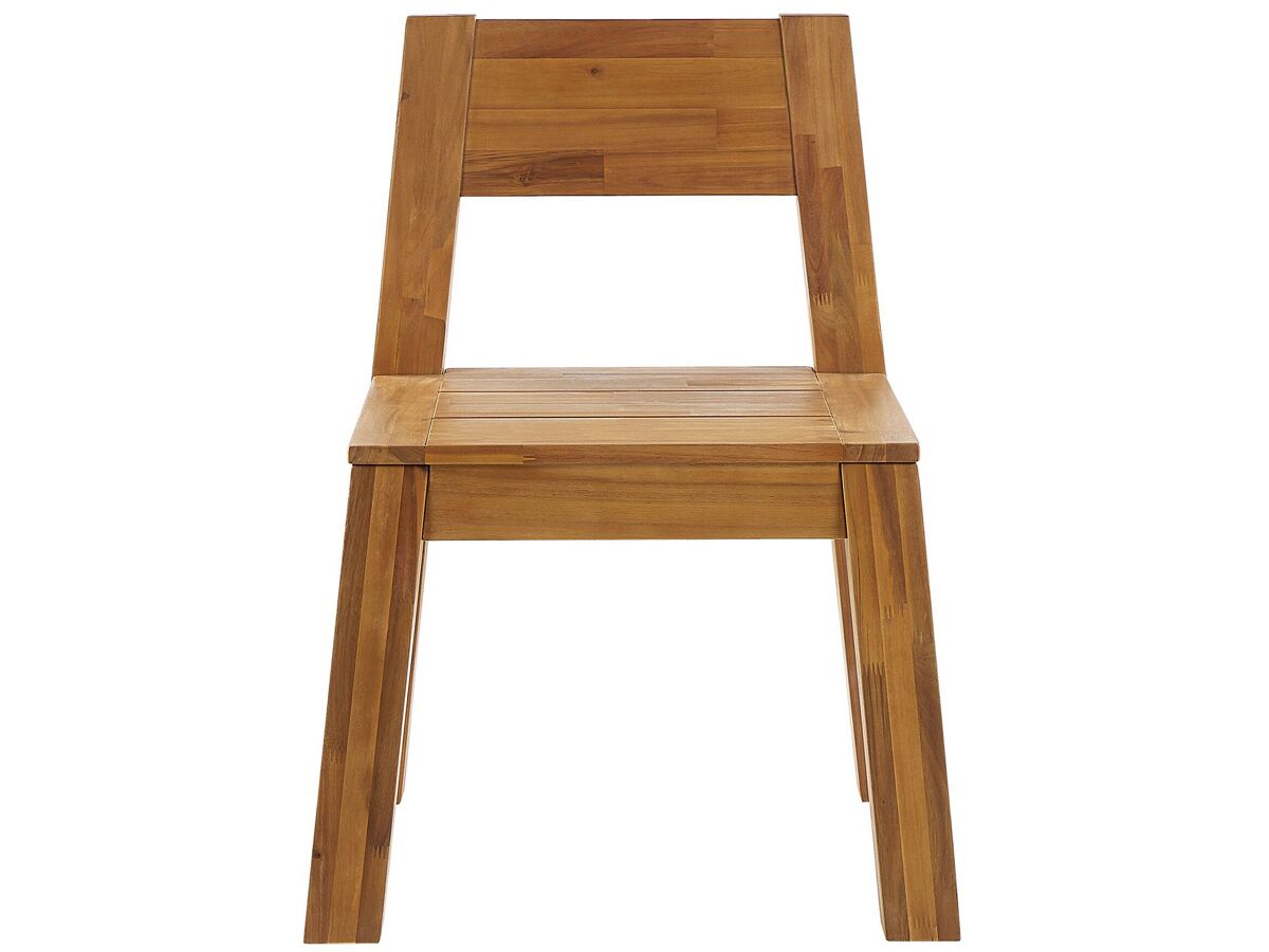 Conjunto de 4 cadeiras de jardim em madeira de acácia. Renove o estilo do seu jardim com estas cadeiras rústicas, numa forma inspirada no moderno. As suas linhas limpas e a madeira clara podem ser combinadas com uma variedade de decorações. As cadeiras são feitas de madeira laminada de acácia de alta qualidade, para que o conjunto possa ser usado tanto em ambientes fechados como ao ar livre.