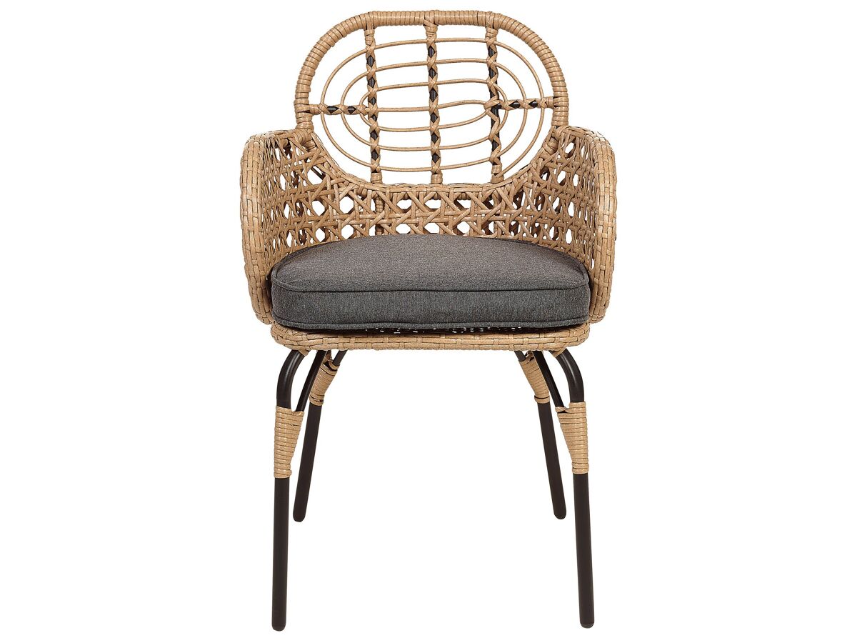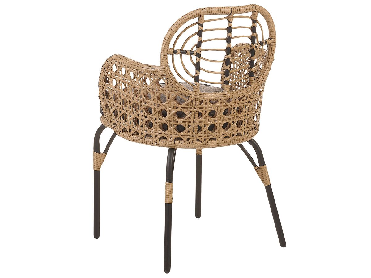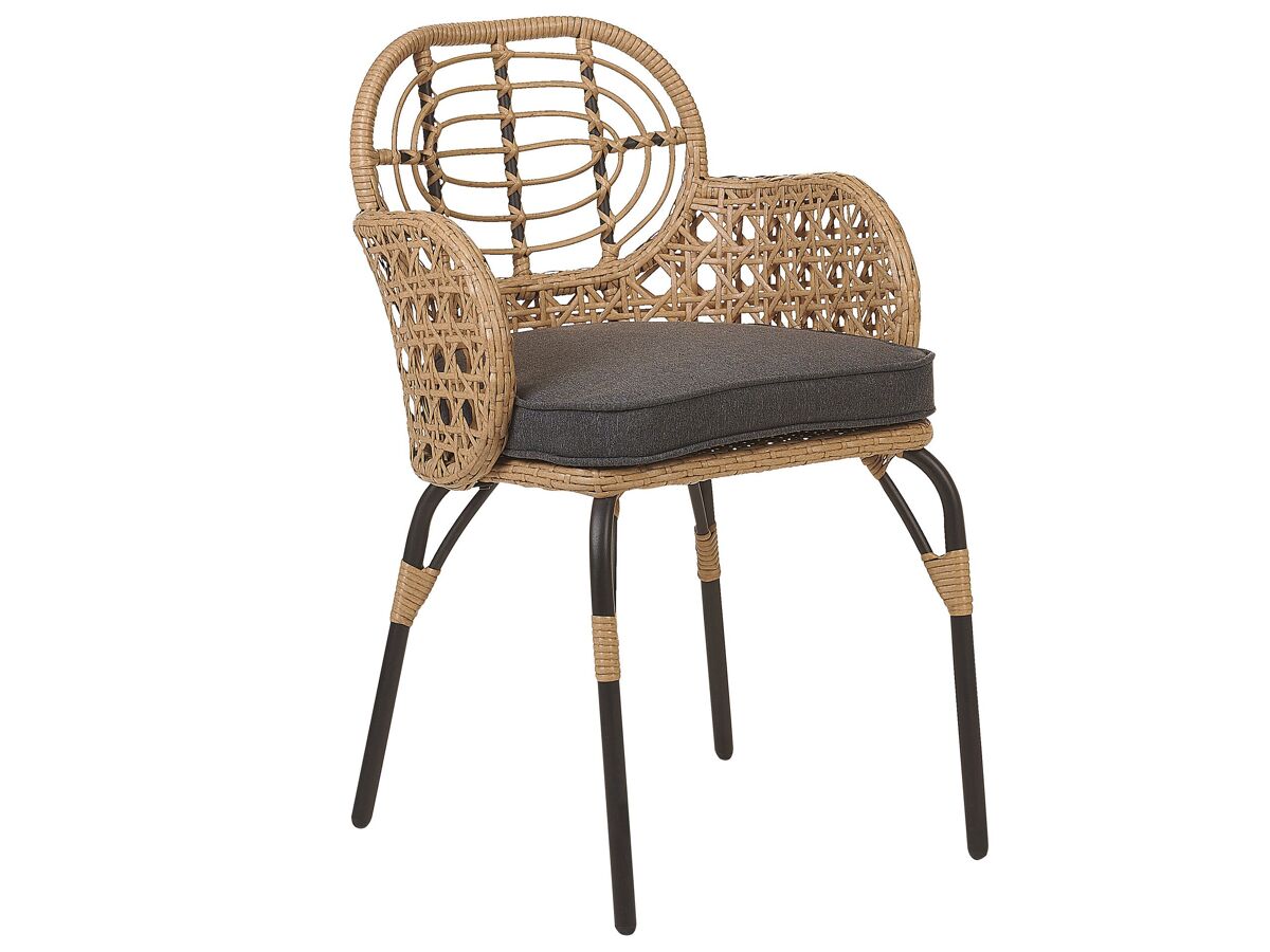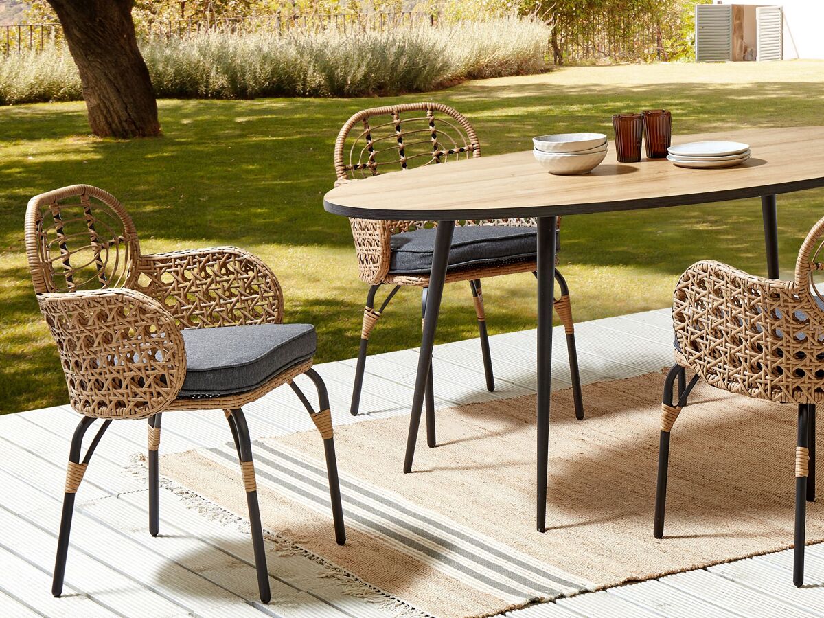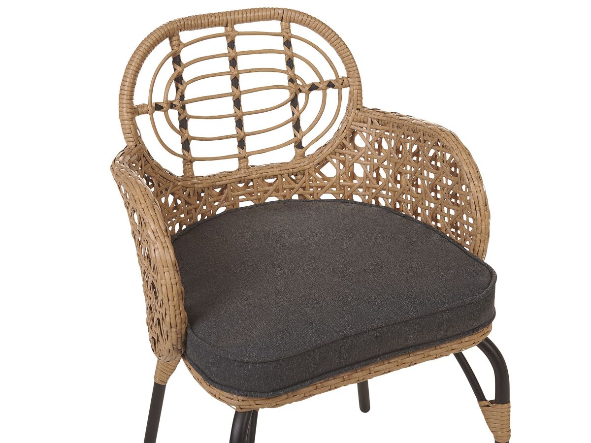 Cadeiras com almofadas de exterior de estilo boho. Prepare o exterior da sua casa para os dias quentes de verão, com este elegante conjunto de cadeiras para jardim. Feito de materiais duráveis, as cadeiras apresentam um encantador encosto e apoios de braços feitos a partir de rattan entrançado. As peças vêm com uma almofada de assento densamente acolchoada de cor escura, o que as torna ainda mais confortáveis. A combinação de cores e o design inspirado na natureza tornam esta numa peça encantadora, que combinará com uma variedade de estilos de decoração. Detalhes: Tipo de Produto: Cadeira de jardim Estilo: Boho Cor: Natural Tom: Cinzento grafite Tipo de Material: Ratan sintético Material Principal: Ratan sintético Material Adicional: Aço Material dos Pés: Metal Material do Assento: Ratan sintético Composição Material: 100% poliéster Apoiador de Braço: Sim Acabamento: Revestimento em tinta em pó Dobrável: Não Densidade da Espuma do Assento: 20 kg/m3 Empilhável: Não Dimensões: Altura das Poltronas: 71 cm Profundidade: 49 cm Grossura do Assento: 5 cm Altura do Assento: 46 cm Largura: 45 cm Altura: 84 cm Superfície do Assento: 45x46 cm Peso: 8 kg Peso Máximo Suportado: 100 kg A oferta inclui: 2 x Cadeira, 2 x Almofada de assento Características Principais: Proporciona uma atmosfera acolhedora, Tecido sólido, Materiais de qualidade superior, Adequado para uso interior e exterior, Resistência UV 5 (ISO 105-B02), Capas de almofada removíveis para uma limpeza simples Informação de Montagem: Parcialmente necessária. 20-40 min. Texto de Resistência: A resistência à água leve permite-lhe utilizar o artigo no exterior, e mantê-lo durante a chuva leve e em condições húmidas. Se não for possível guardar no interior, aconselhamos a usar uma capa protetora. Expor mobiliário ou acessórios a um contacto prolongado com a humidade pode resultar em danos. Resistência: Manchas Dicas de Manutenção: Ratan sintético: 1.Limpe com produtos de limpeza à base de sabão. Não use detergentes químicos agressivos 2.Para prolongar a vida útil do móvel, proteja-o da exposição solar direta 3.Utensílios ou acessórios de vidro podem causar superaquecimento da superfície 4.Durante o inverno, use uma capa protetora ou guarde os móveis no interior. Poliéster: 1.Lave apenas à mão, use água fria e um sabonete suave/neutro. Lave do lado direito com o fecho completamente fechado 2.Não seque na máquina e não passe a ferro 3.Quando não estiver em uso, mantenha em um local limpo e seco para protegê-lo das condições atmosféricas.