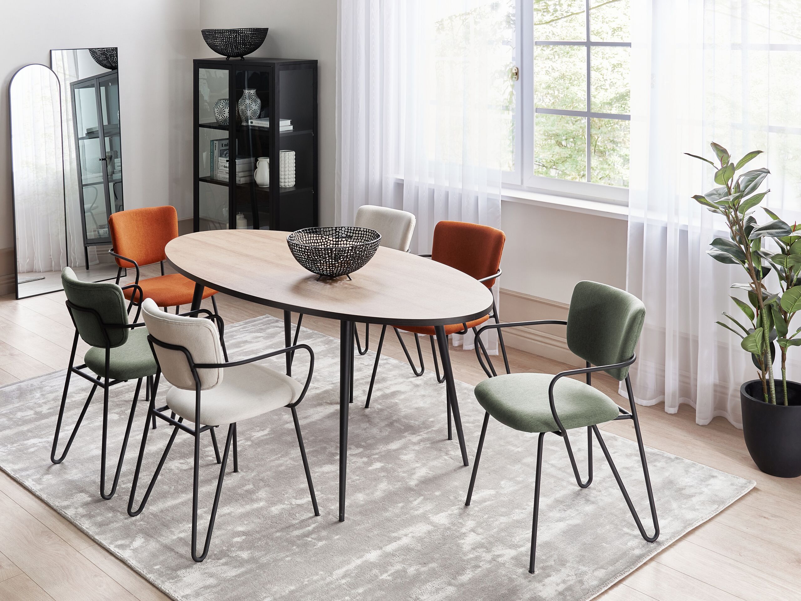 Conjunto de 2 cadeiras de refeição contemporâneas . Graças a estas cadeiras de sala de jantar, todas as suas refeições serão ainda mais saborosas, e você vai sentar-se confortavelmente durante elas. Feitas de poliéster durável, são macias e de baixa manutenção, tornando-as perfeitas para famílias ocupadas. Graças ao seu visual moderno, são uma excelente escolha para interiores contemporâneos, onde a sua estrutura de ferro, combinada com a cor contrastante, se destacará. Detalhes: Tipo de Produto: Cadeira de refeição Estilo: Moderno Cor: Laranja Tipo de Material: Tecido Material Principal: Poliéster Material Adicional: Ferro Material dos Pés: Metal Material do Assento: Tecido Composição Material: 100% poliéster Apoiador de Braço: Sim Acabamento: Revestimento em tinta em pó Empilhável: Não Dimensões: Altura das Poltronas: 61 cm Profundidade: 54 cm Grossura do Assento: 6 cm Altura do Assento: 43 cm Largura: 53 cm Altura: 80 cm Superfície do Assento: 42x45 cm Peso: 5 kg Peso Máximo Suportado: 150 kg A oferta inclui: 2 x Cadeira Características Principais: Braços cómodos e perfeitamente ajustados, Superfície do assento ampla e confortável, Design intemporal, Acabamentos de qualidade, Pés com proteções anti-riscos Informação de Montagem: Apenas os pés. 20-40 min. Informações Adicionais: Para garantir a estabilidade da construção e segurança de uso, recomenda-se verificar se o produto foi montado corretamente 2 semanas após a instalação. Também é recomendado verificar se os parafusos estão devidamente apertados uma vez a cada 3 meses. Dicas de Manutenção: Poliéster: 1.Limpe com um shampoo seco e uma esponja húmida ou com um detergente neutro 2.Aspire com um acessório adequado. Ferro: 1.Limpe com um detergente suave num pano macio, seque depois 2.Para elementos cromados ou cobre, use agente de polimento 3.Para evitar arranhões, não use produtos de limpeza abrasivos.