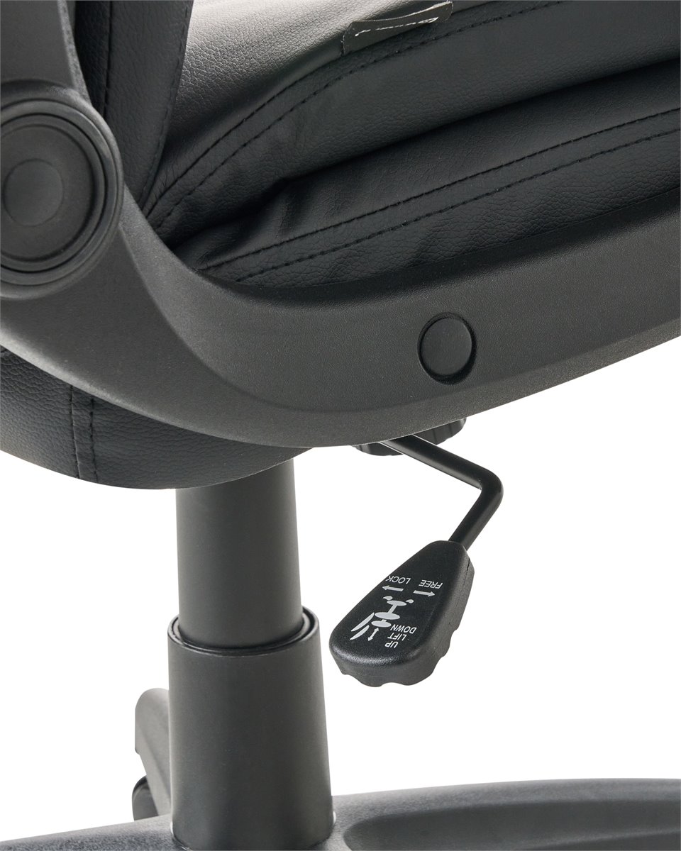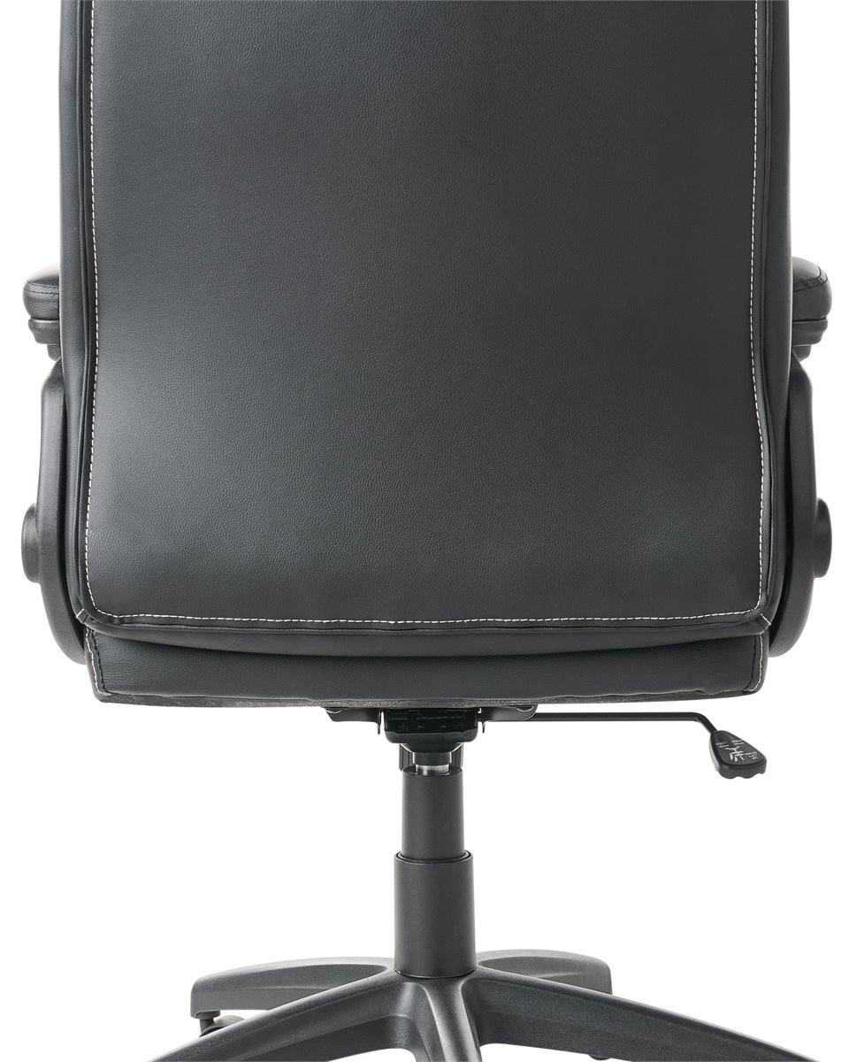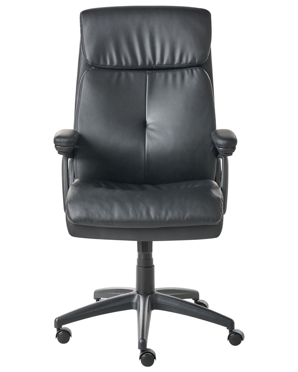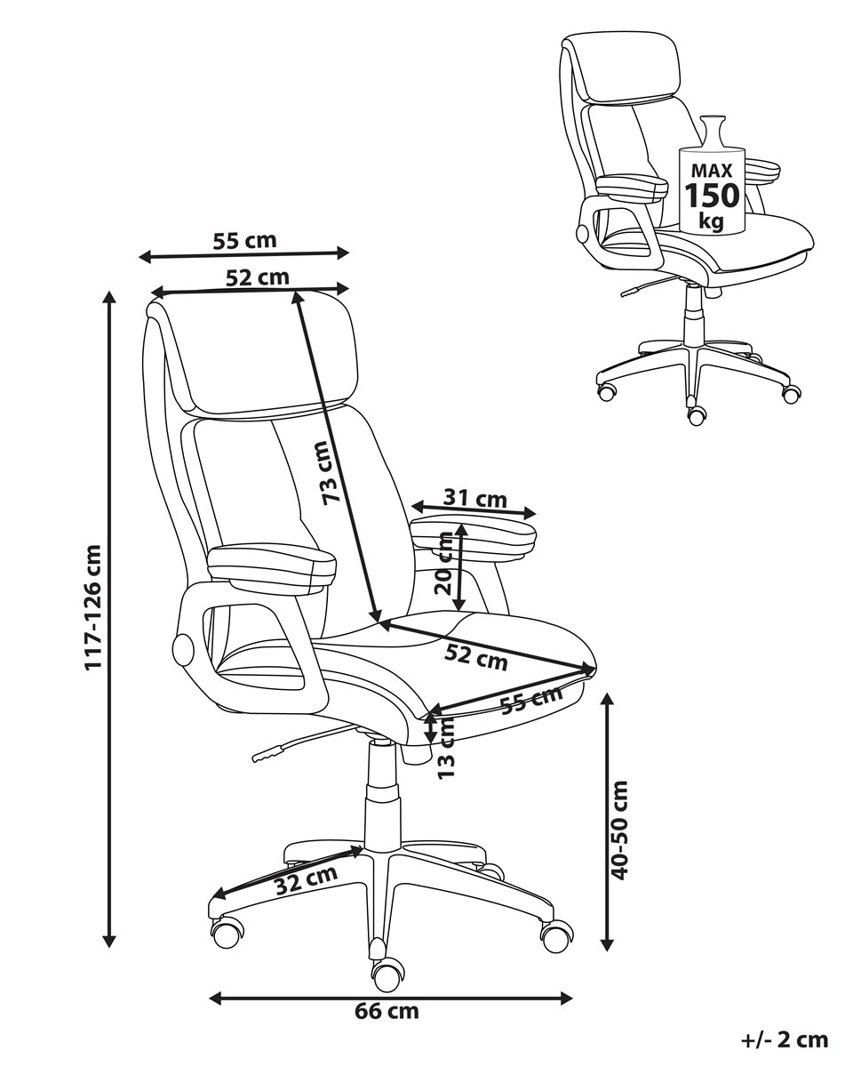 Cadeira de escritório com encosto alto e almofadado. Melhore o seu espaço de trabalho com esta cadeira executiva, desenhada para lhe proporcionar o máximo conforto diário e suporte profissional. O encosto ajuda a alinhar corretamente a sua coluna, promovendo uma melhor postura e reduzindo a tensão causada por longas horas sentado. O acolchoamento espesso é generosamente distribuído por toda a cadeira, incluindo uma borda de assento em cascata que alivia a pressão e promove a circulação sanguínea nos membros inferiores. O suporte lombar integrado melhora o alinhamento ergonómico, enquanto os apoios de braço acolchoados oferecem conforto adicional. Use a alavanca sob o assento para ajustar a altura ou ativar a função de inclinação, que lhe possibilita movimentos dinâmicos ou uma posição vertical fixa. Estofada em pele sintética, a cadeira possui um aspeto de alta de qualidade, adequando-se tanto a espaços domésticos como executivos. Detalhes: Tipo de Produto: Cadeira executiva Estilo: Tradicional Cor: Preto Tipo de Material: Pele sintética Material Principal: Pele sintética Material Adicional: Nylon Material dos Pés: Material sintético Material do Assento: Pele sintética Composição Material: 100% pele sintética Giro 360: Sim Partes Ajustáveis: Altura do assento Apoiador de Braço: Sim Protetores para os Pés: Não Inclinação: Sim Dimensões: Altura das Poltronas: 20 cm Profundidade: 66 cm Altura do Assento: 40-50 cm Largura: 66 cm Altura: 117-126 cm Superfície do Assento: 55x52 cm Peso: 15 kg Peso Máximo Suportado: 150 kg A oferta inclui: 1 x Cadeira de escritório Características Principais: Rodas giratórias com travões de segurança, Rotação a 360°, Mecanismo de inclinação permite um ajustamento perfeito, Assento ajustável via sistema de molas pneumáticas, Apoios de braços almofadados para um maior conforto dos antebraços e cotovelos, Encosto e apoio de braços concebidos para proporcionar um suporte ideal do corpo, Acolchoado espesso proporciona um conforto ideal, Formato ergonómico, Acolchoado de qualidade superior Informação de Montagem: Necessita de montagem completa. 20-40 min. Dicas de Manutenção: Pele sintética: 1.Limpe com um shampoo seco e uma esponja húmida ou com um detergente neutro 2.Aspire com um acessório adequado. Material sintético: 1.Use apenas detergentes neutros e panos macios, seque depois.